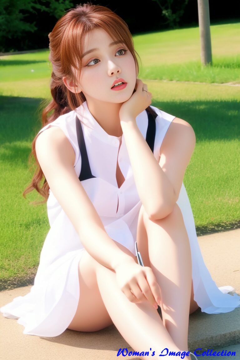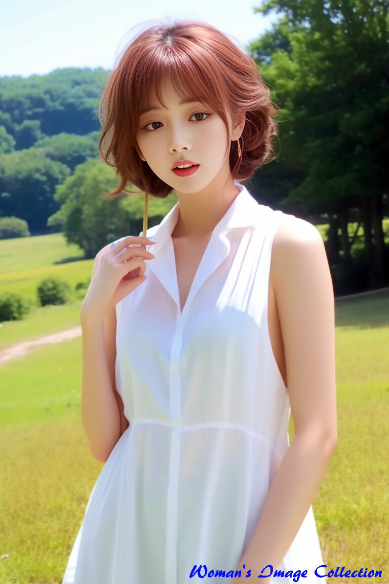 背景の自然とのコントラスト、風になびく髪とスカートの動き、光を透かす素材感――