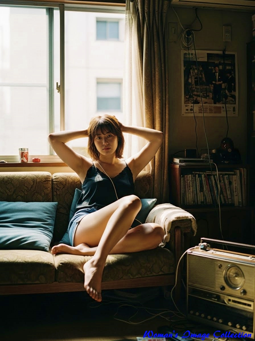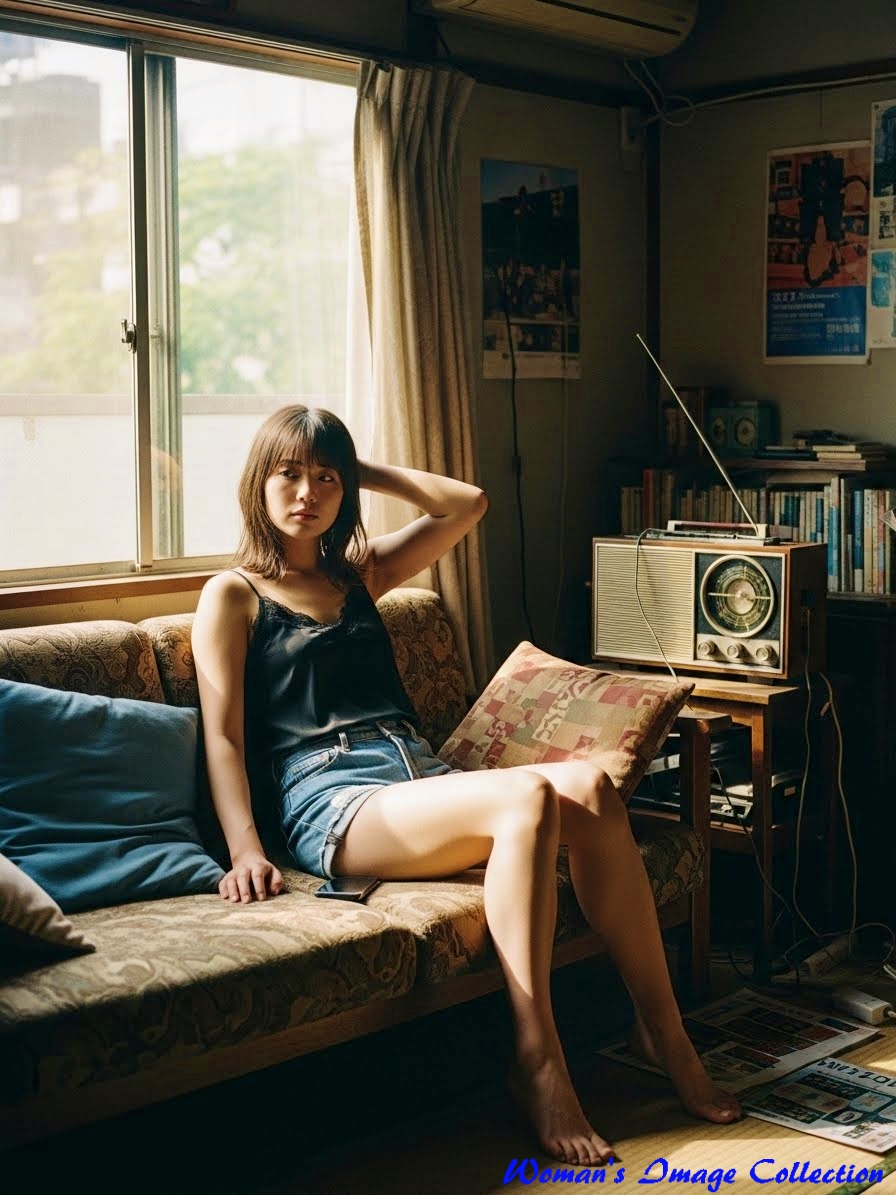 詳細 (窓の光が髪や肌に当たっている, 穏やかな表情, 裸足, 古びた昭和の大きなラジオ, 配線, 古い木造アパートの質感)