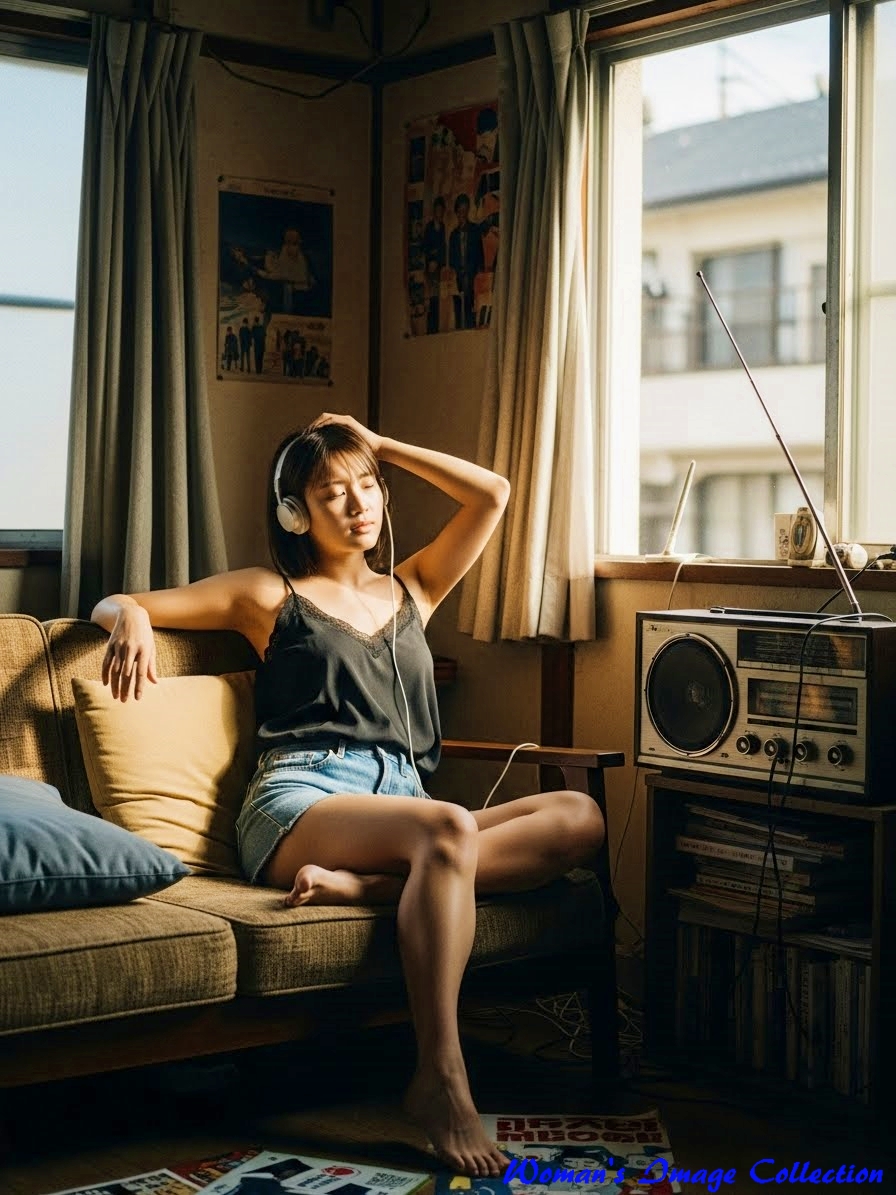 動作 (ソファに深く腰掛け, 膝を立てて,ラジオのスピーカーから流れてくる音楽を聴いている, リラックスしたポーズ),