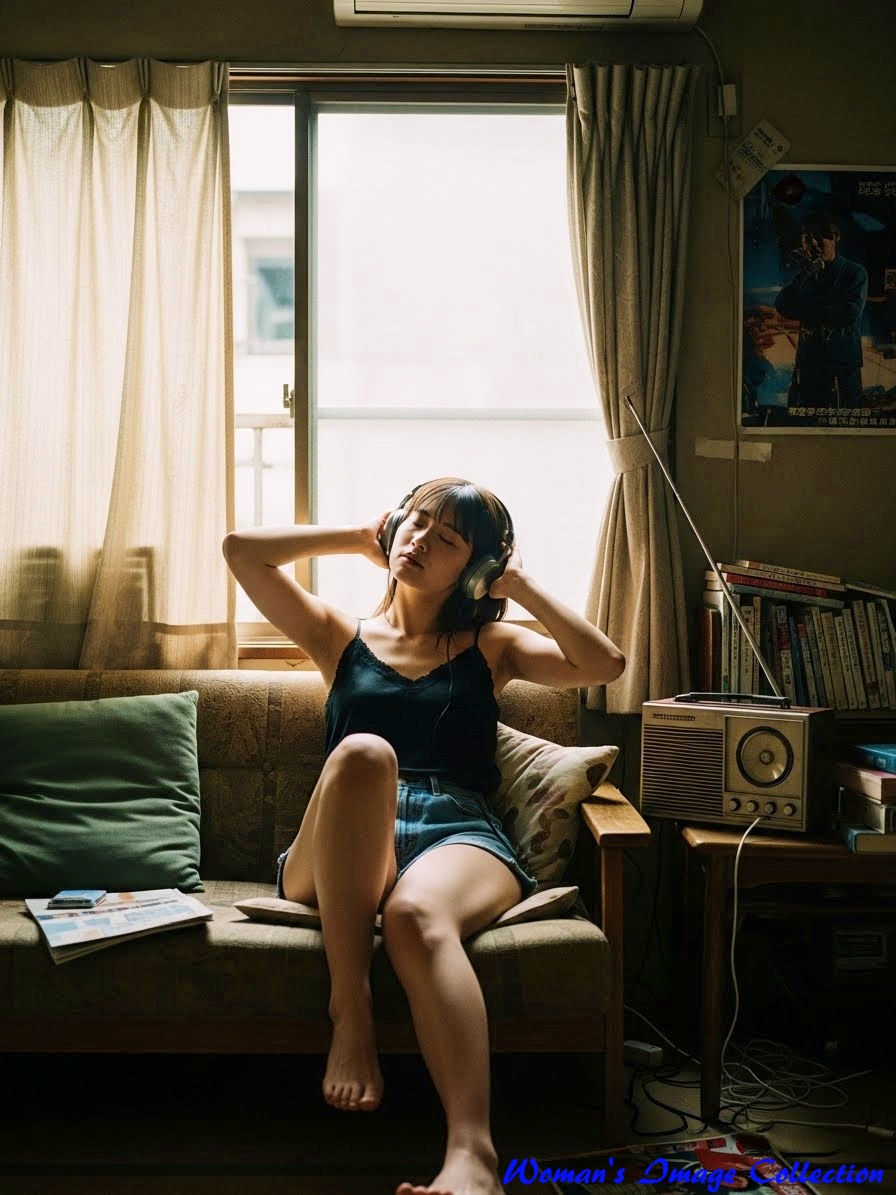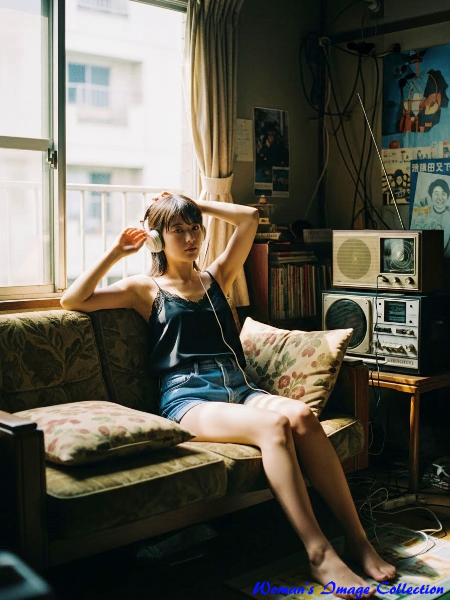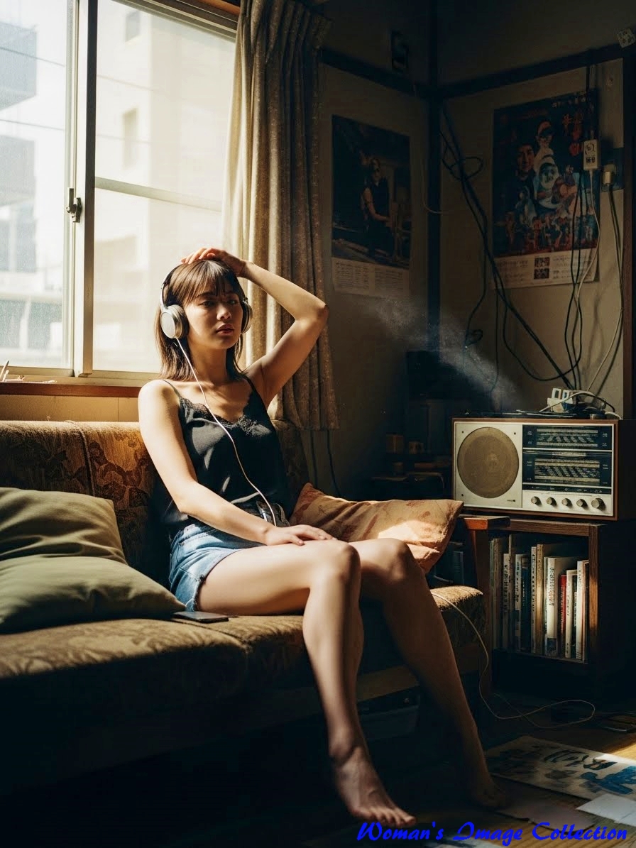 今回は、ラジオから流れてくる音楽をソファーに座って聞いている女性にプロンプトです。