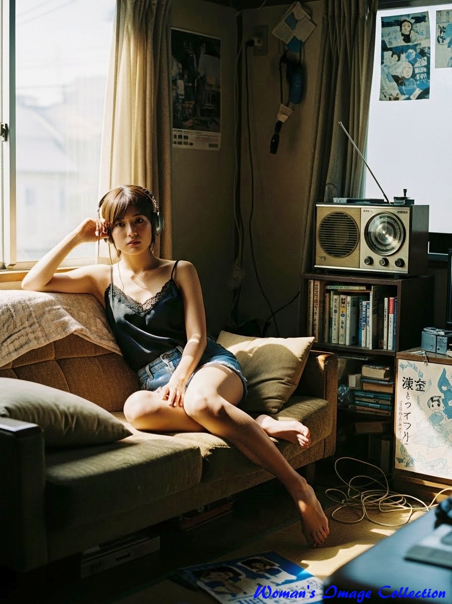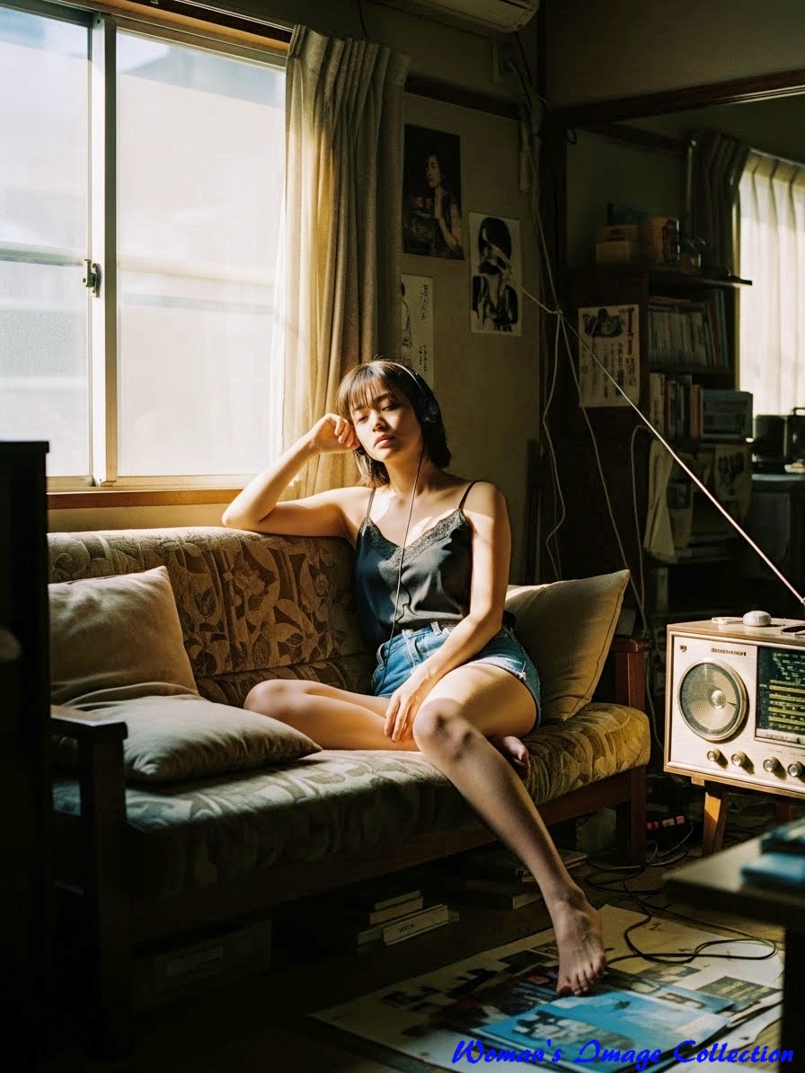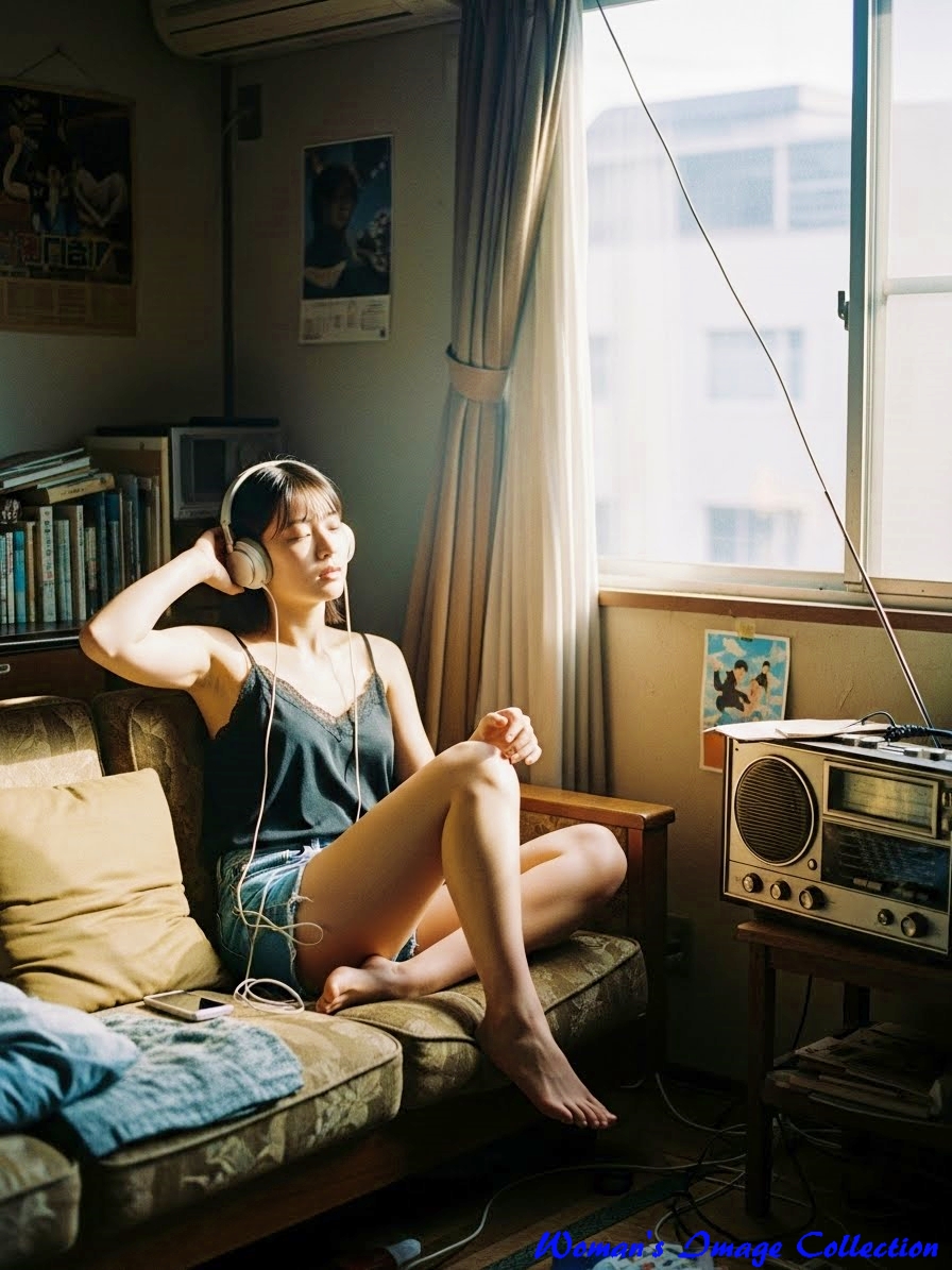 今回は、ラジオから流れてくる音楽をソファーに座って聞いている女性にプロンプトです。