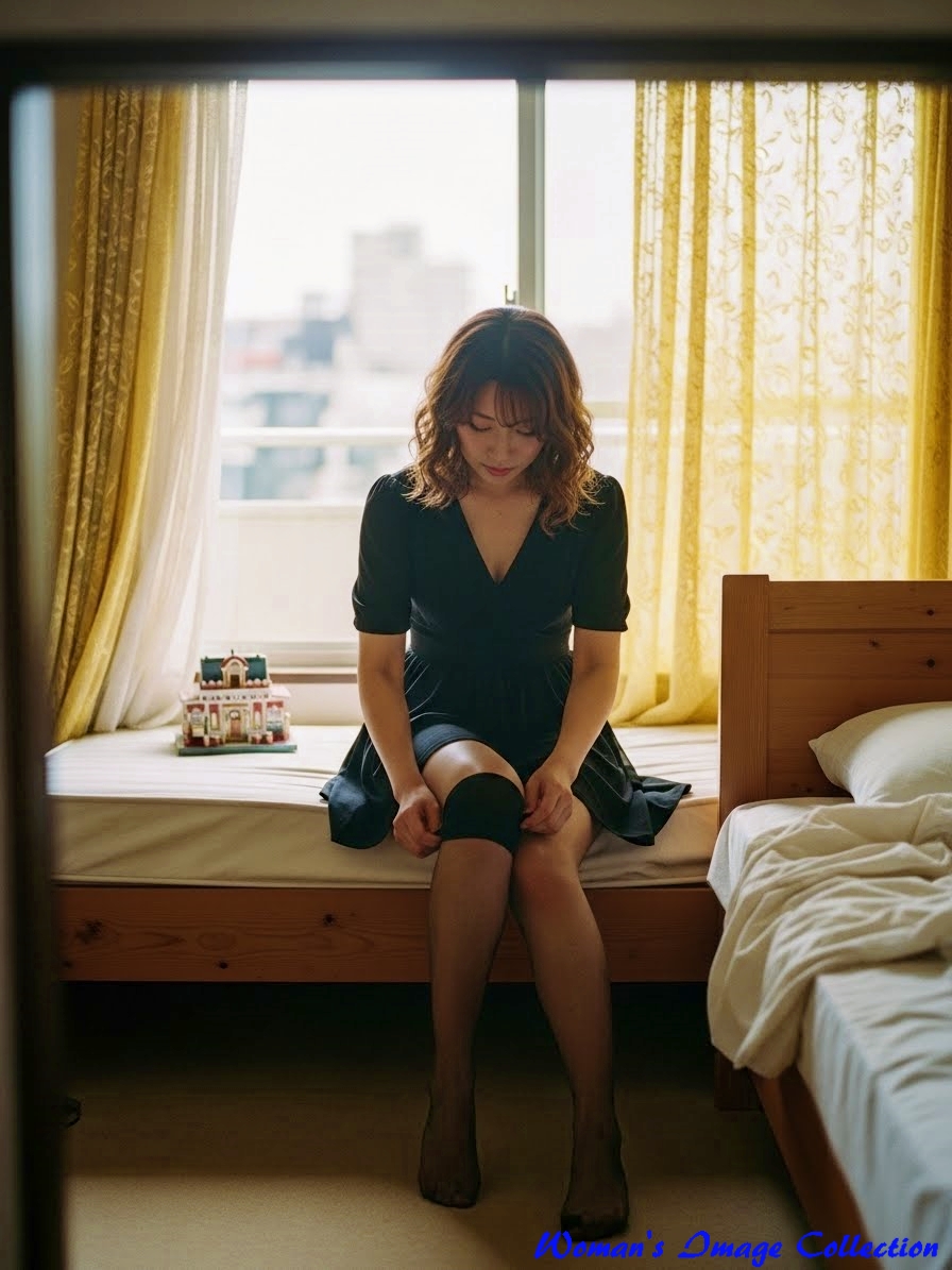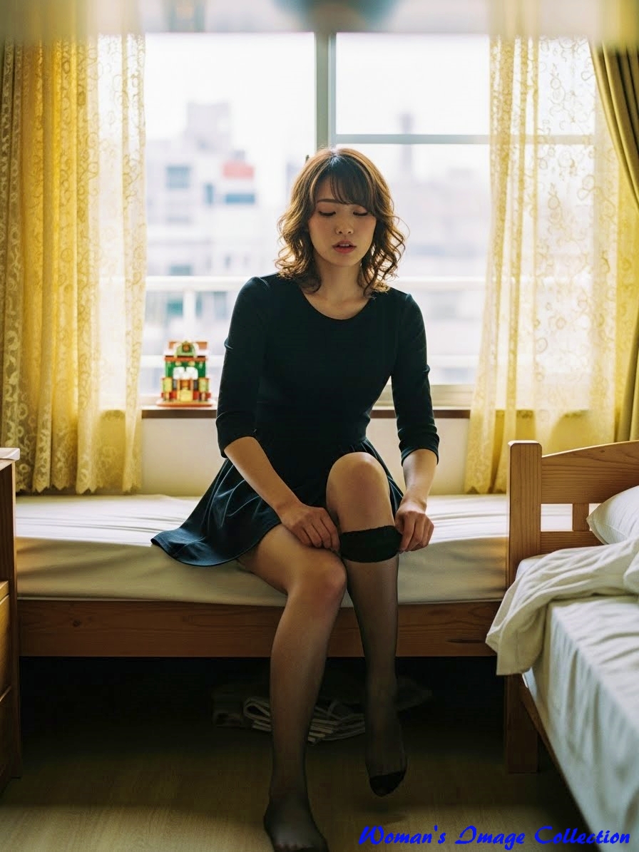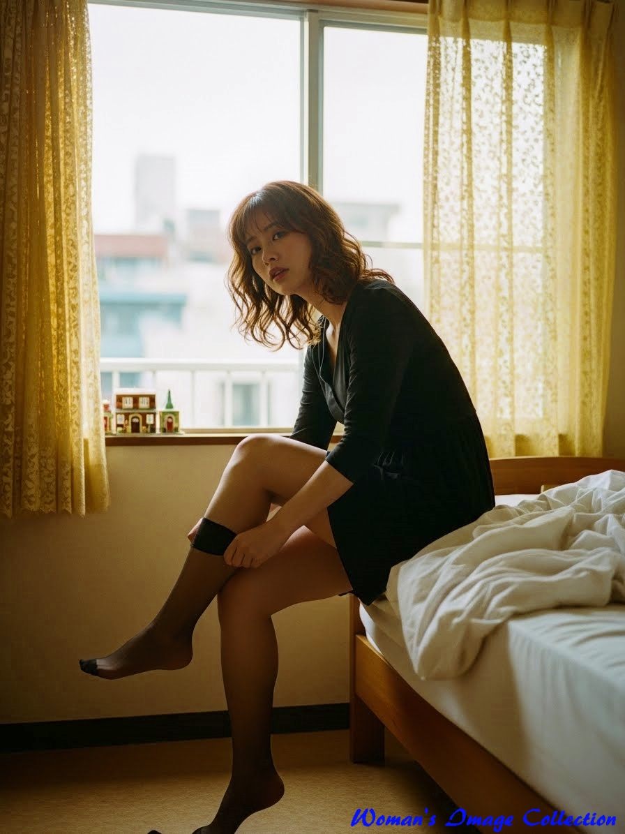 動作 (窓辺のベッドの端に座り、少し身をかがめてきれいな素足に黒いストッキングを履こうとしているポーズ),