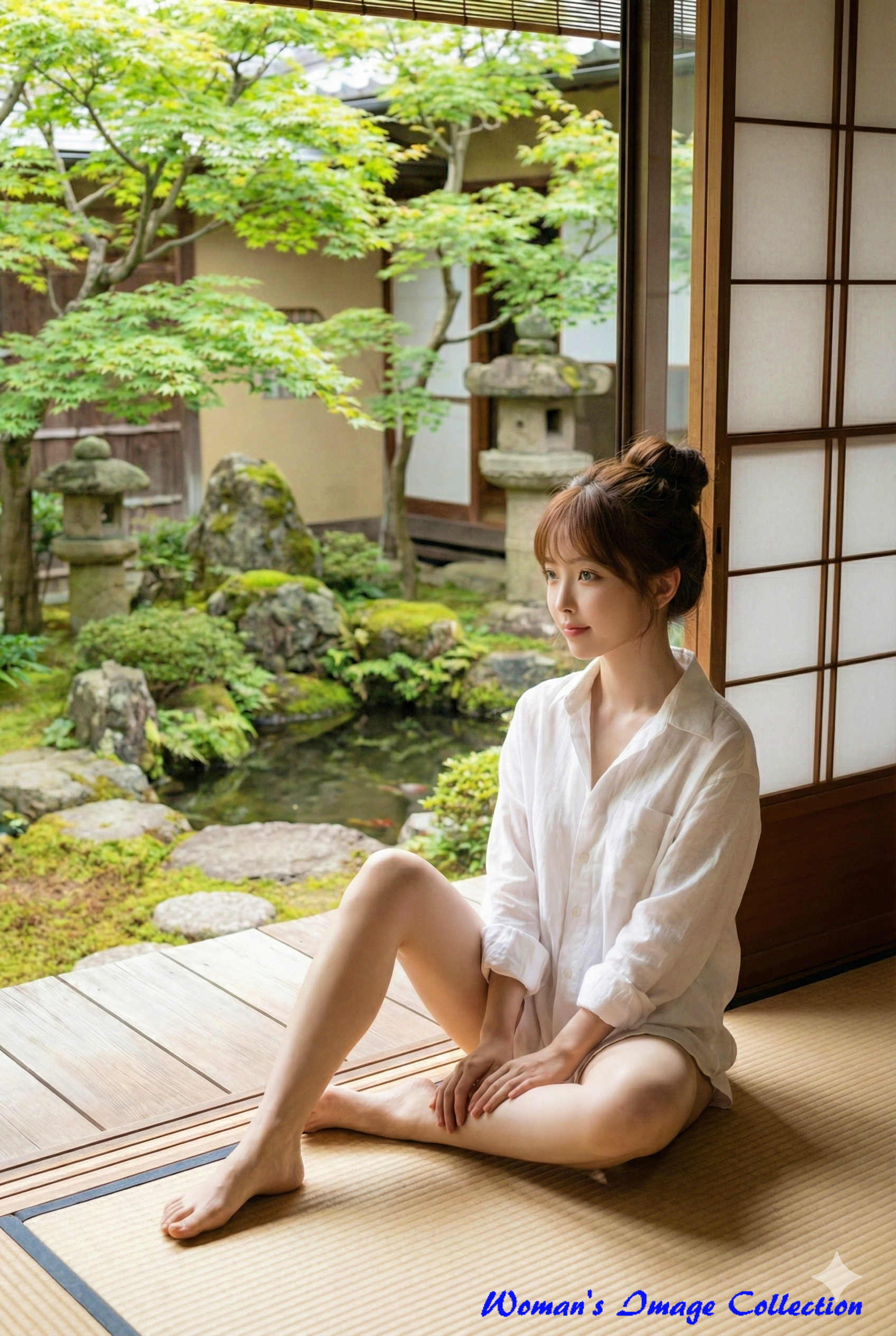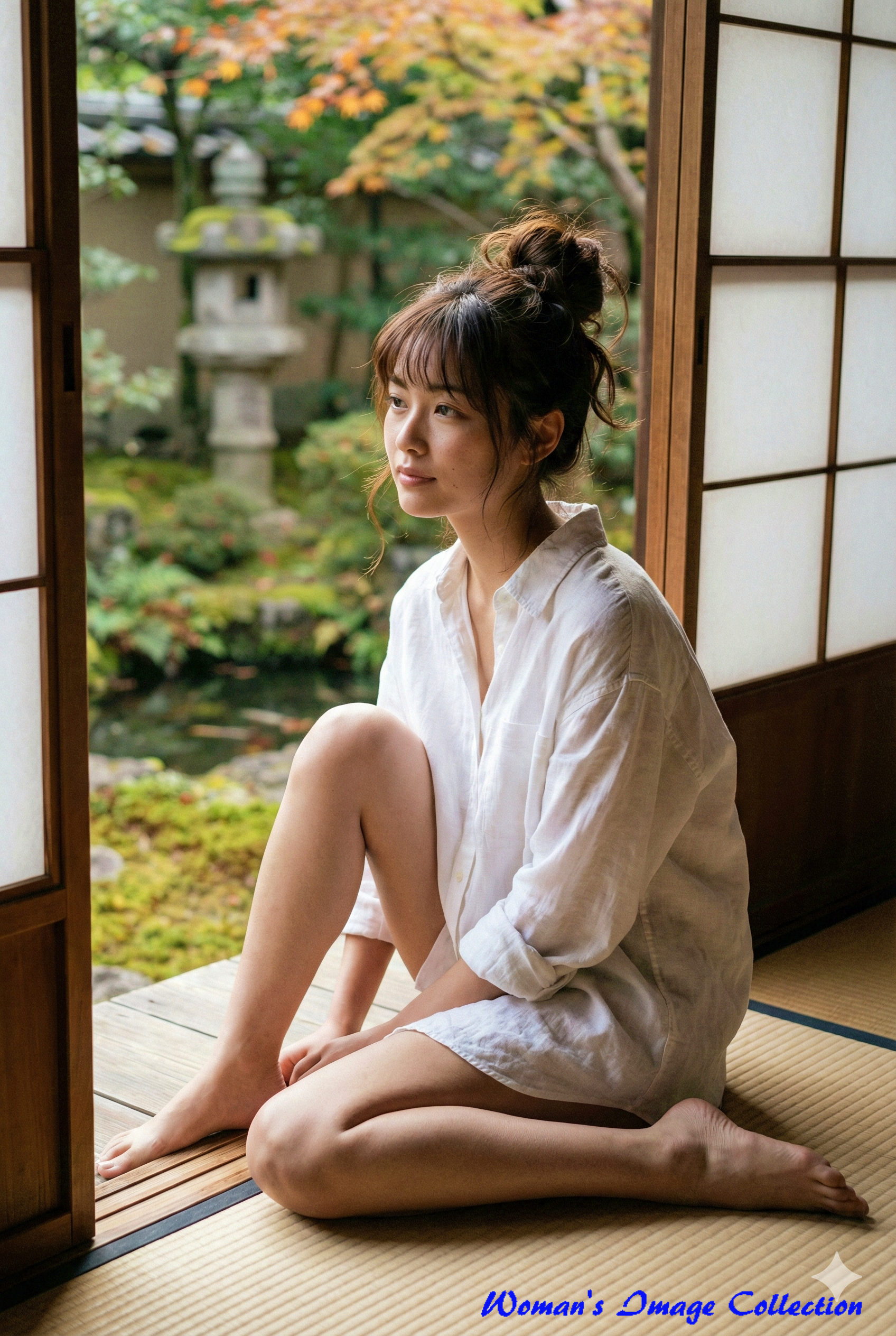 主役となる女性は、清潔感あふれるオーバーサイズの白いリネンシャツを身にまとい、畳の上でリラックスしたポーズをとっています。 「白シャツ×畳×自然光」という組み合わせが、懐かしさと新しさが同居する「ノスタルジック」な世界観を作り上げているのが特徴です。