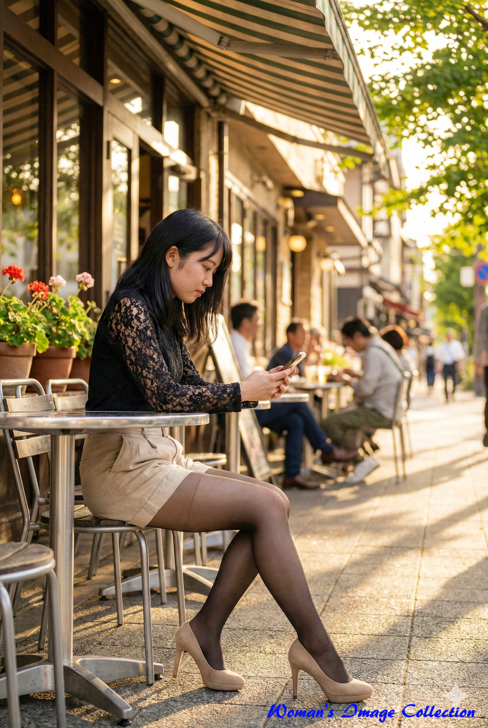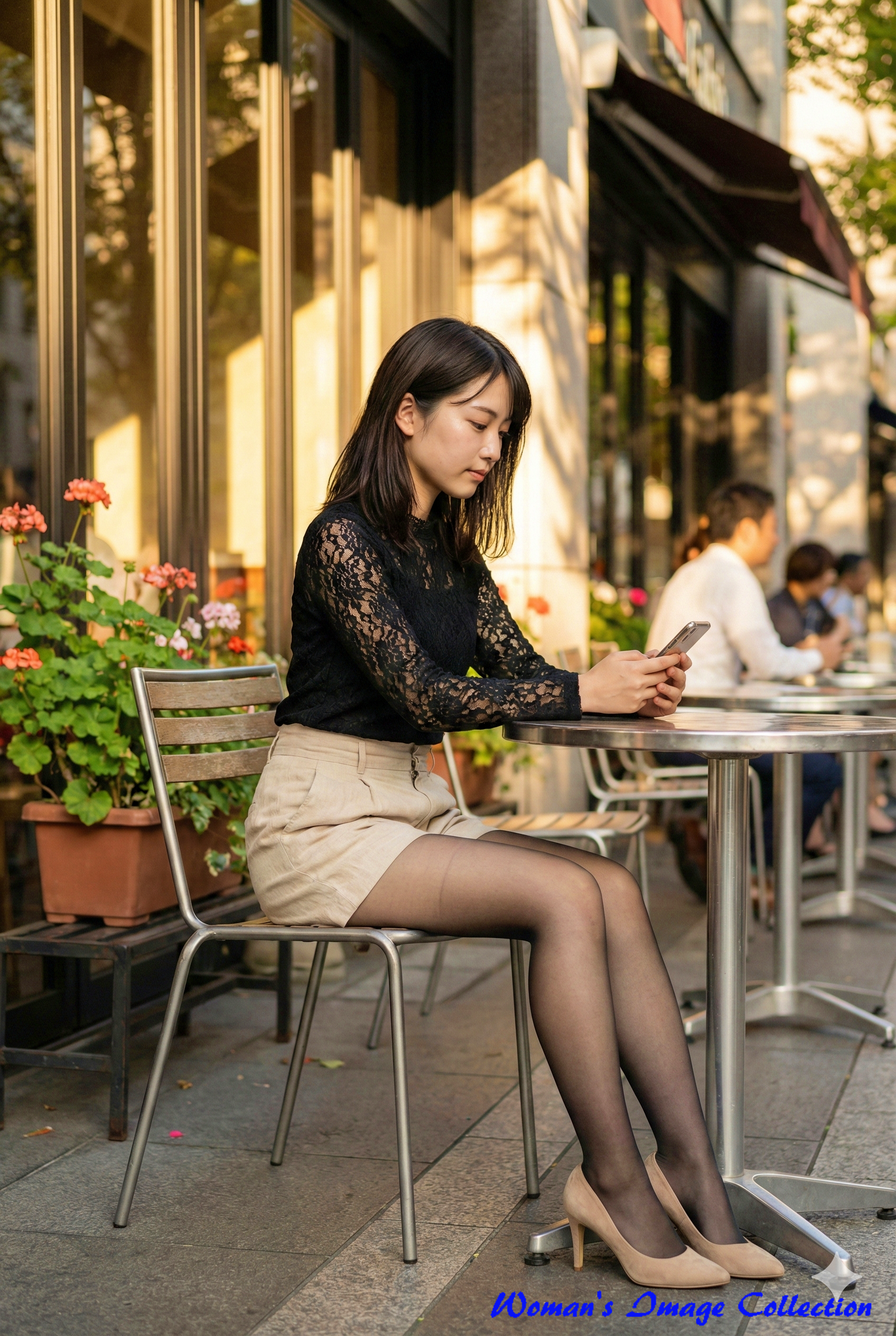 この画像は、午後の柔らかな陽光(ゴールデンアワー)が差し込む屋外カフェの雰囲気を完璧に捉えています。黒の花柄レースという複雑なテクスチャを持つ衣装が、光の当たり方によって立体感を生み出し、背景のガラス窓や鉢植えの緑がボケ味(被写界深度)を伴って配置されることで、主役の女性を美しく引き立てています。85mmレンズ特有の圧縮効果をシミュレートしており、落ち着いた表情とスマートフォンを操作する日常的な動作が、AI生成とは思えない「実在感」を演出しています。