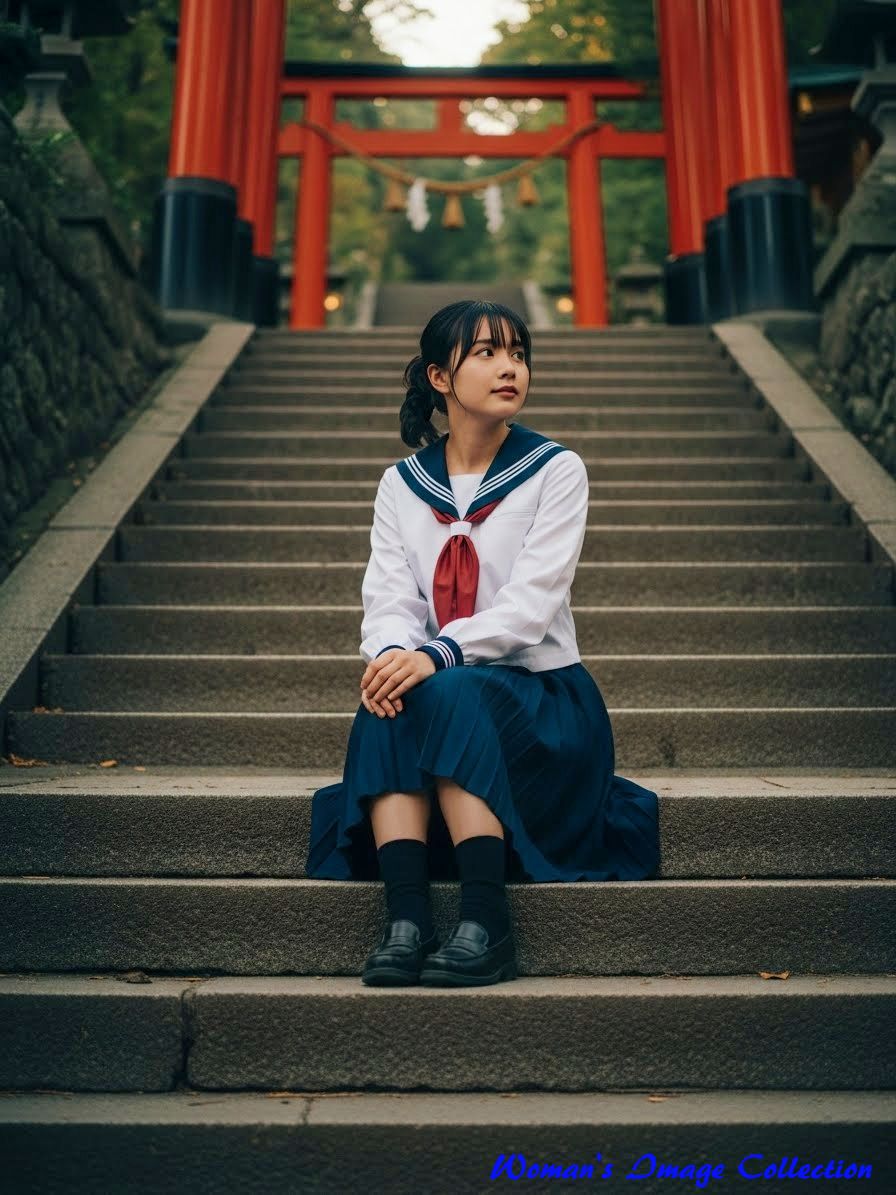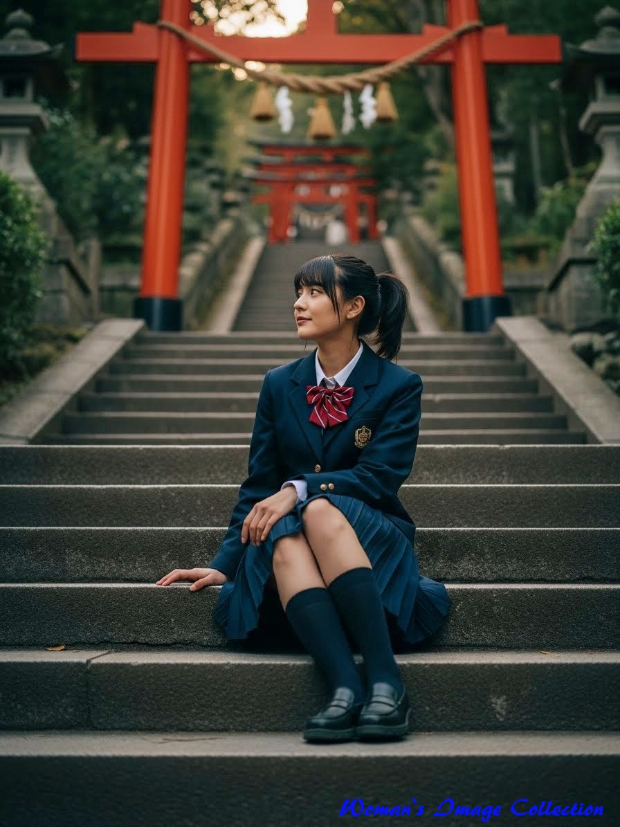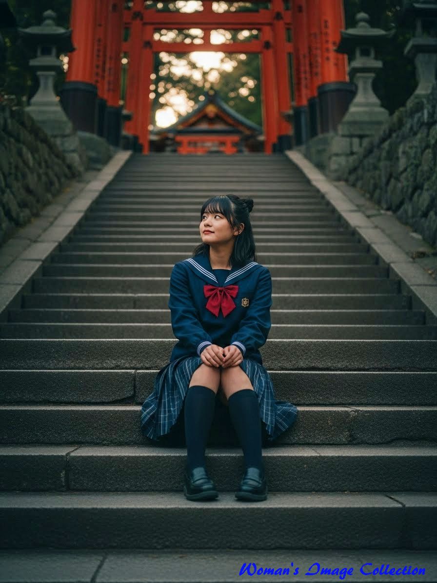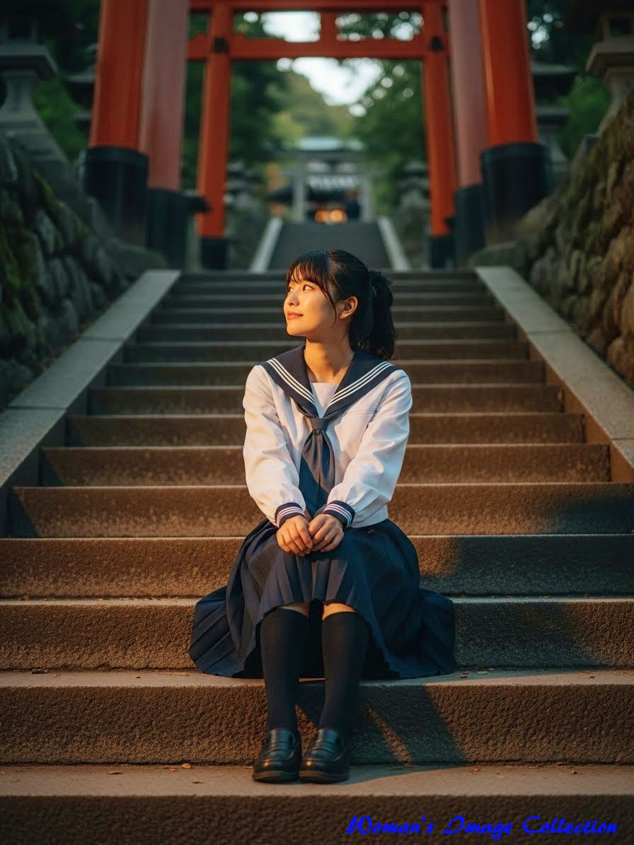 注目してほしいのは、この「光」の表現です。 夕暮れ時の黄金色の光(ゴールデンアワー)が、彼女の横顔を優しく照らしていますよね。背景の赤い鳥居を少しぼかすことで、階段に座る彼女の表情がぐっと引き立ち、物語が始まる直前のような静かな空気感まで伝わってきます。