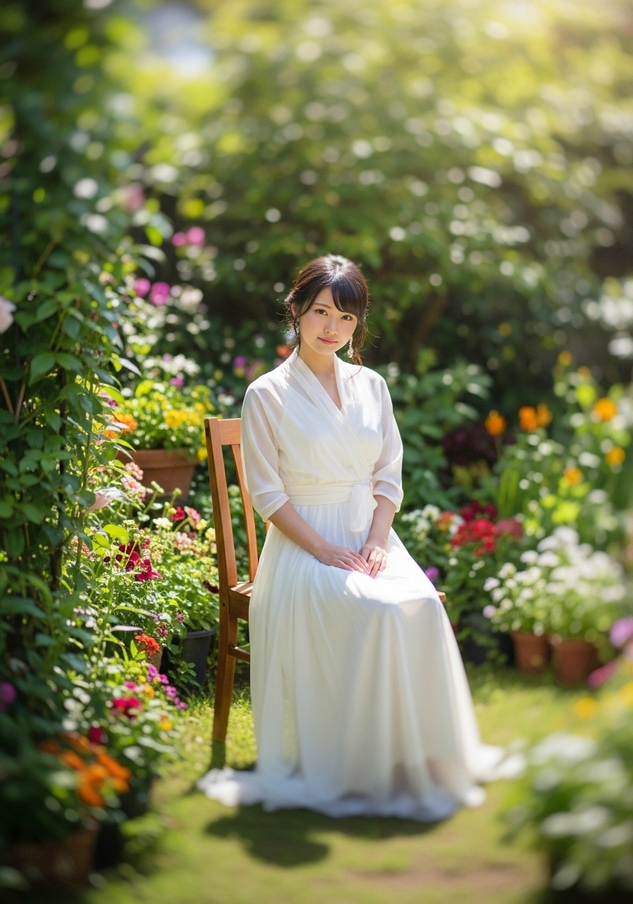チルトシフト効果を使って少女を幻想的に表現する。白い薄く透ける素材の巻きイブニングドレスを着ている美しくかわいい妖精の様な幼く見える若い日本人少女。屋外の自然光が溢れる庭園でかわいい木の椅子に座っている。