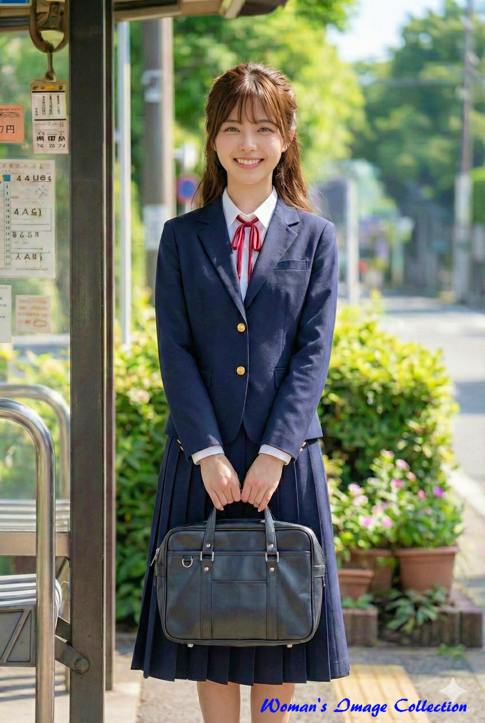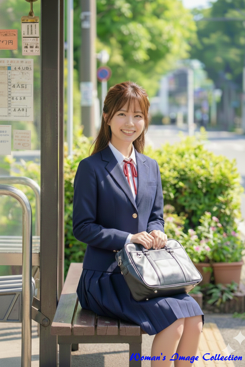 | 主要キーワード | 日本人女子学生、バス停、木漏れ日、紺のブレザー |