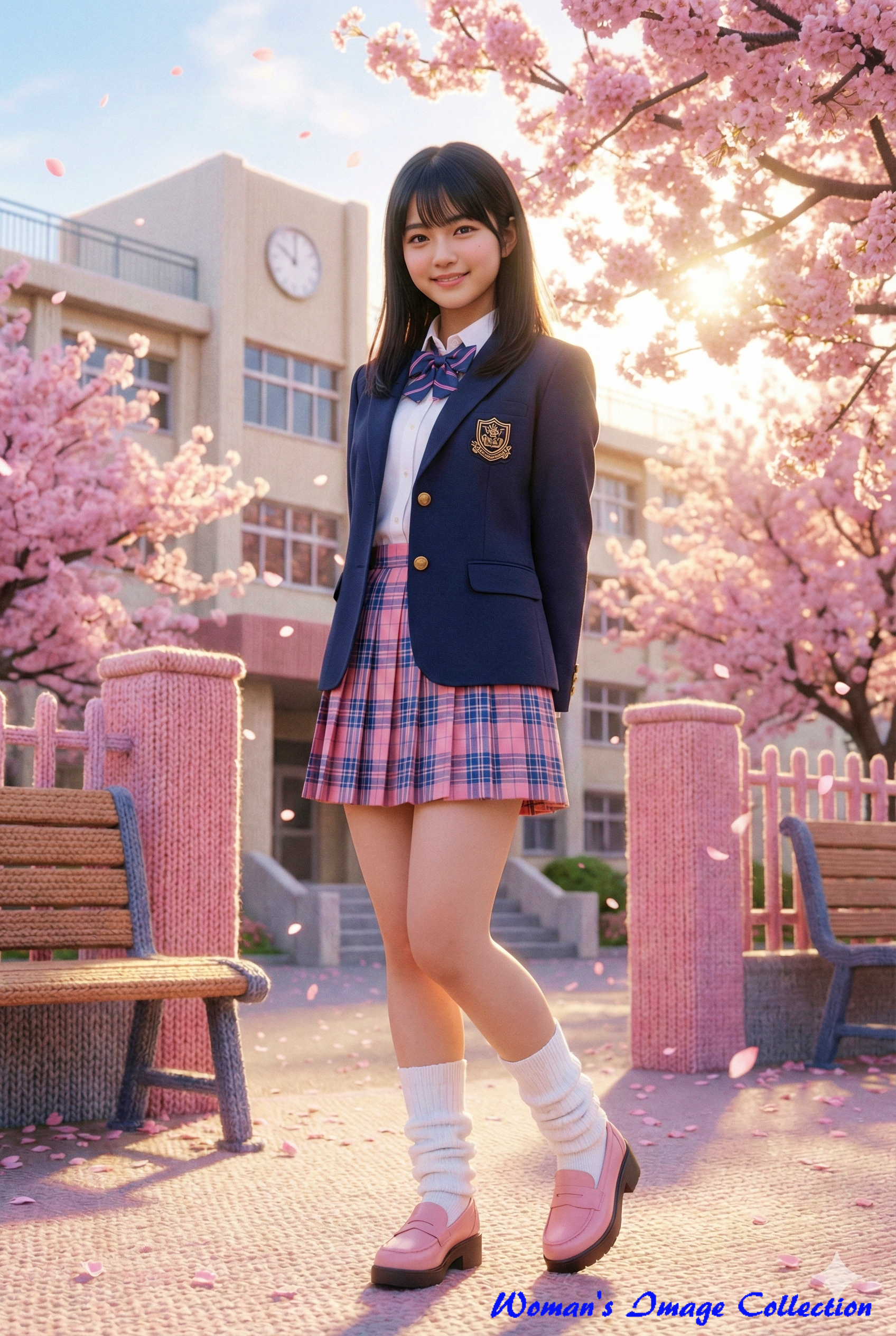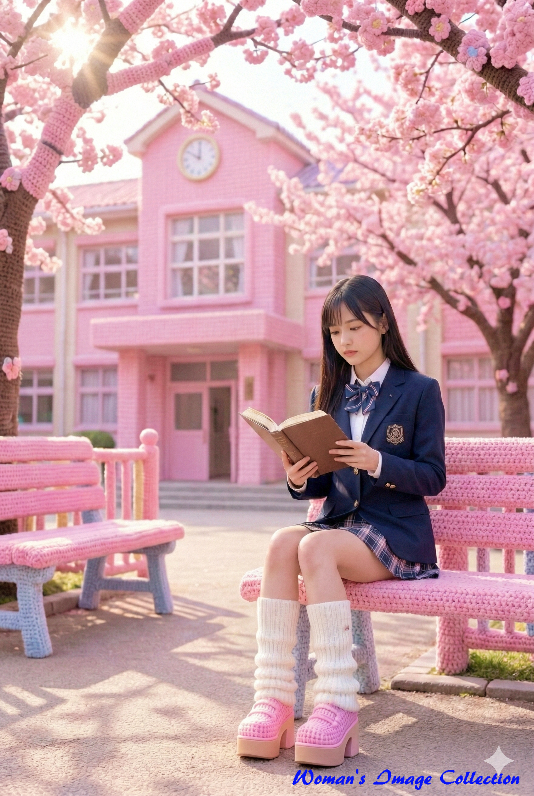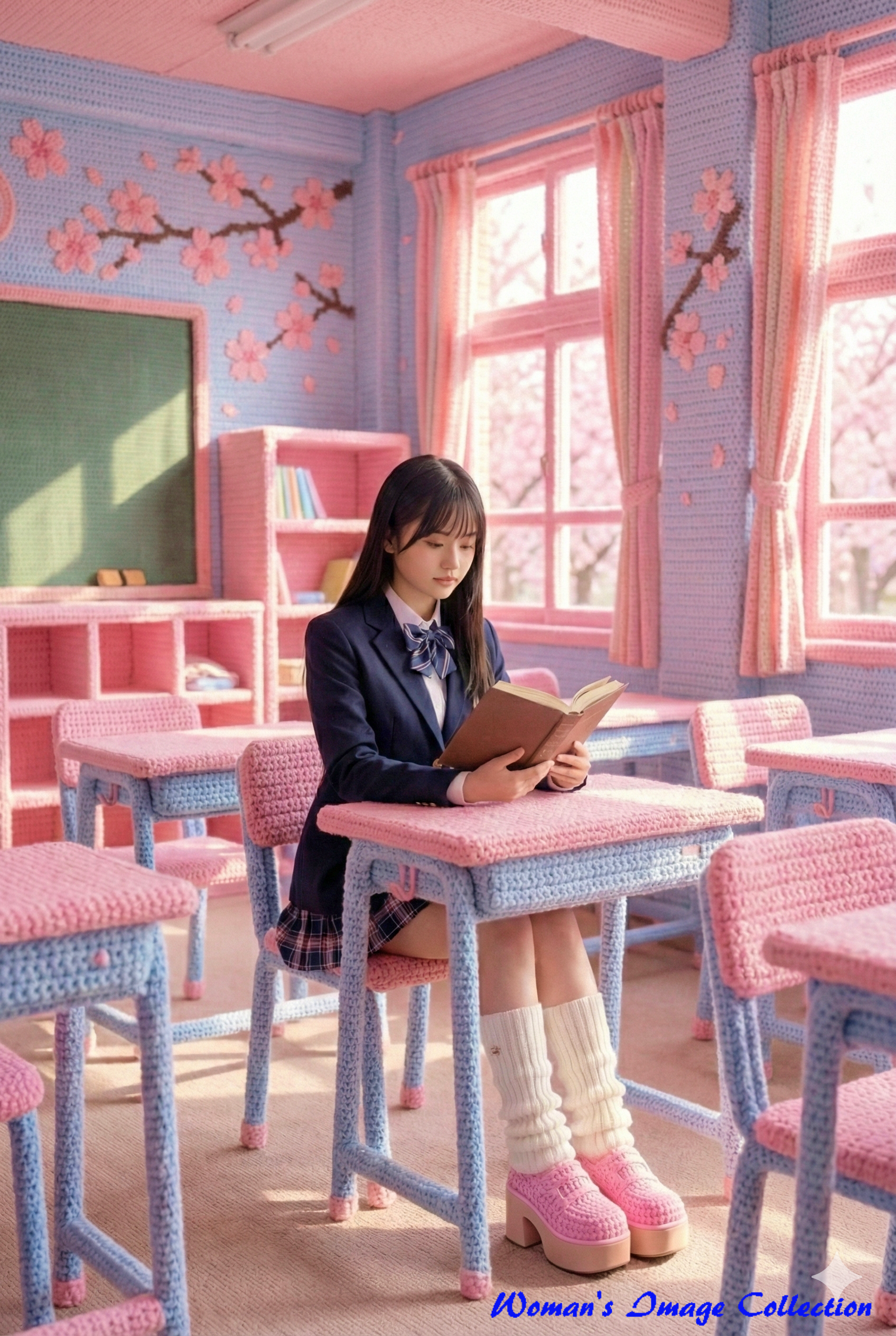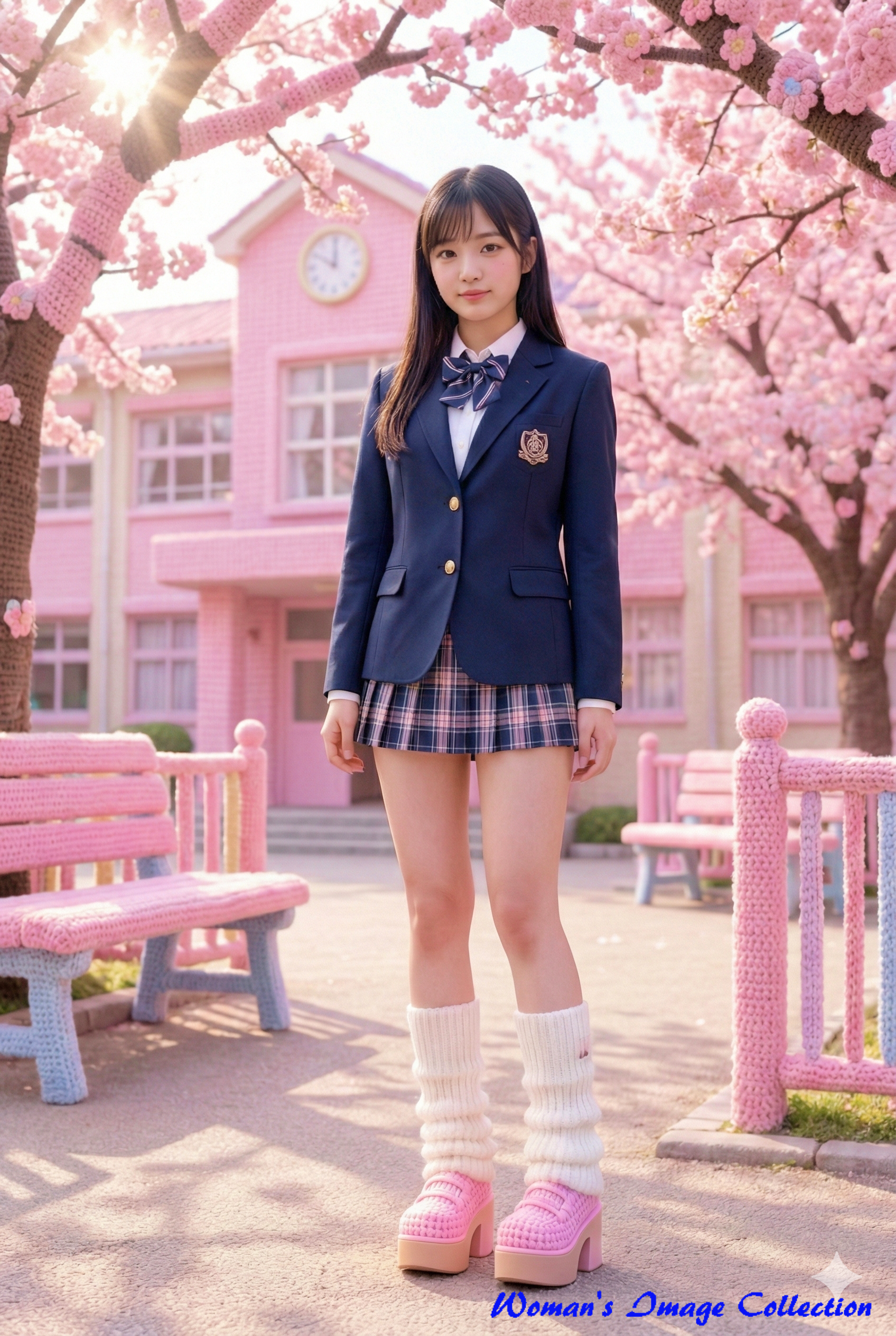 この画像は、満開の桜並木から校舎、ベンチに至るまで、世界のすべてが「手編み」で構成されたかのような独特の世界観を表現しています。夕暮れ時(ゴールデンアワー)の柔らかな太陽光が、編み目のひとつひとつを照らし出し、立体的で緻密な質感を強調。ネイビーの制服を着た日本人女性がその中心に立つことで、日常と非日常が交差する、映画のワンシーンのような美しい構図となっています。
