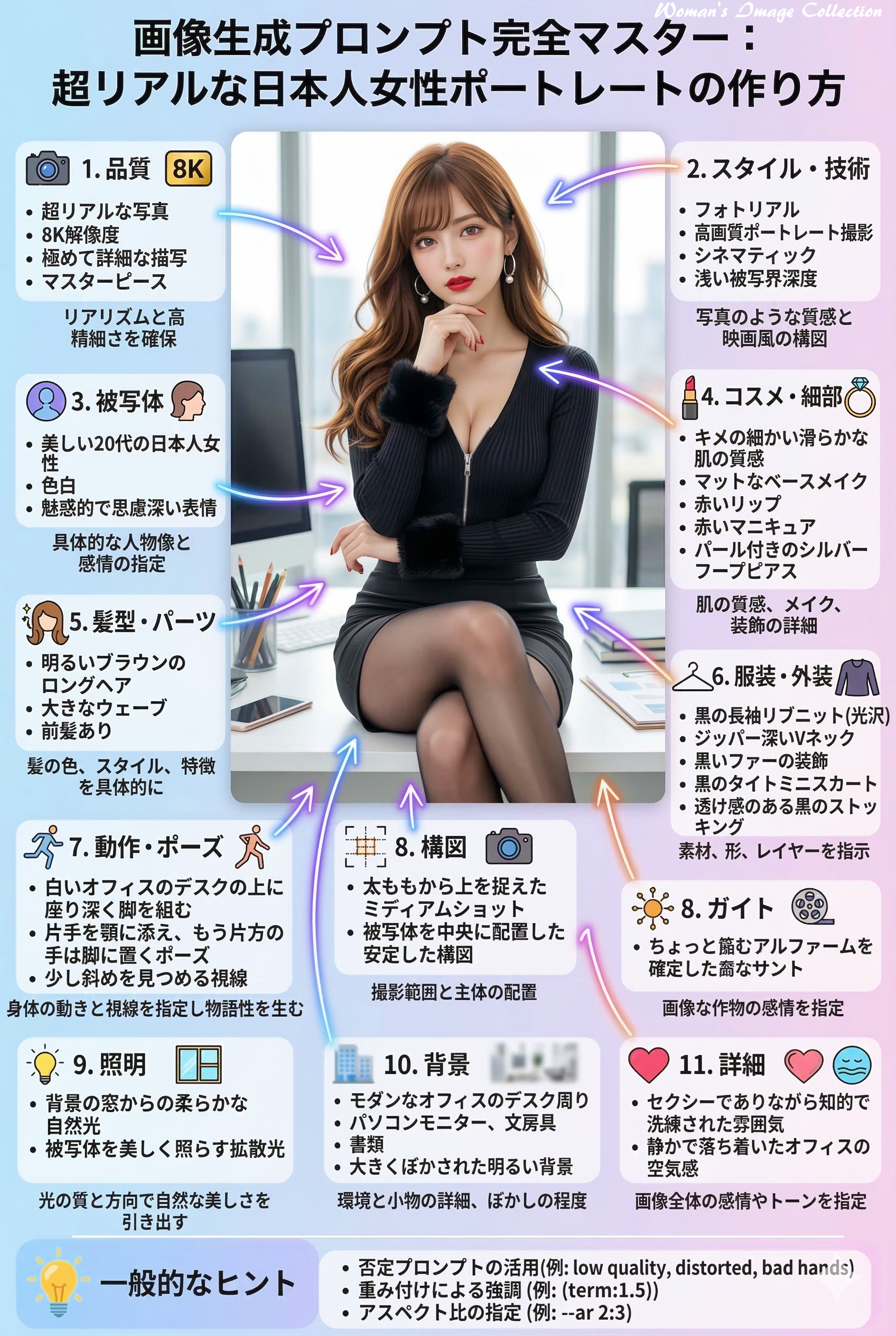 今回は、洗練されたオフィス環境を舞台に、知性と色香が同居する大人のポートレートをご紹介しました。ライティングやポージングの変化だけで、同じキャラクターでも「静寂な思考」から「ダイナミックなビジネスシーン」まで幅広く表現することが可能です。あなたのブログやSNSの素材として、ぜひこのプロンプト構成を参考に、魅力的なビジュアル生成に挑戦してみてください。
