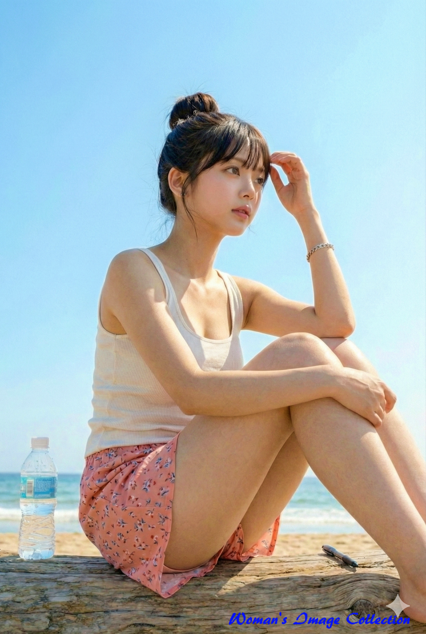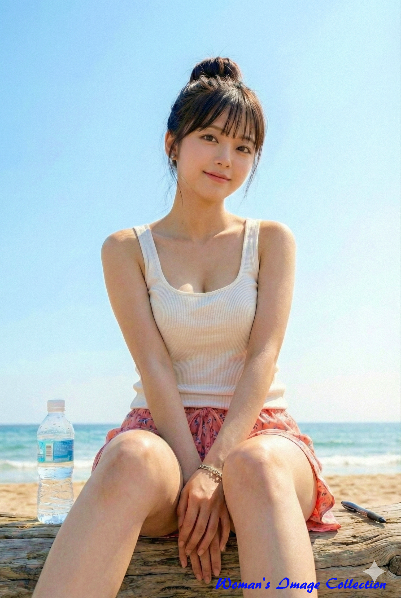 今回ご紹介するのは、真夏の海岸線で流木に腰掛け、真っ直ぐにこちらを見つめる女性のポートレートです。 この画像の最大の魅力は、「圧倒的なリアリティと清潔感」の融合にあります。