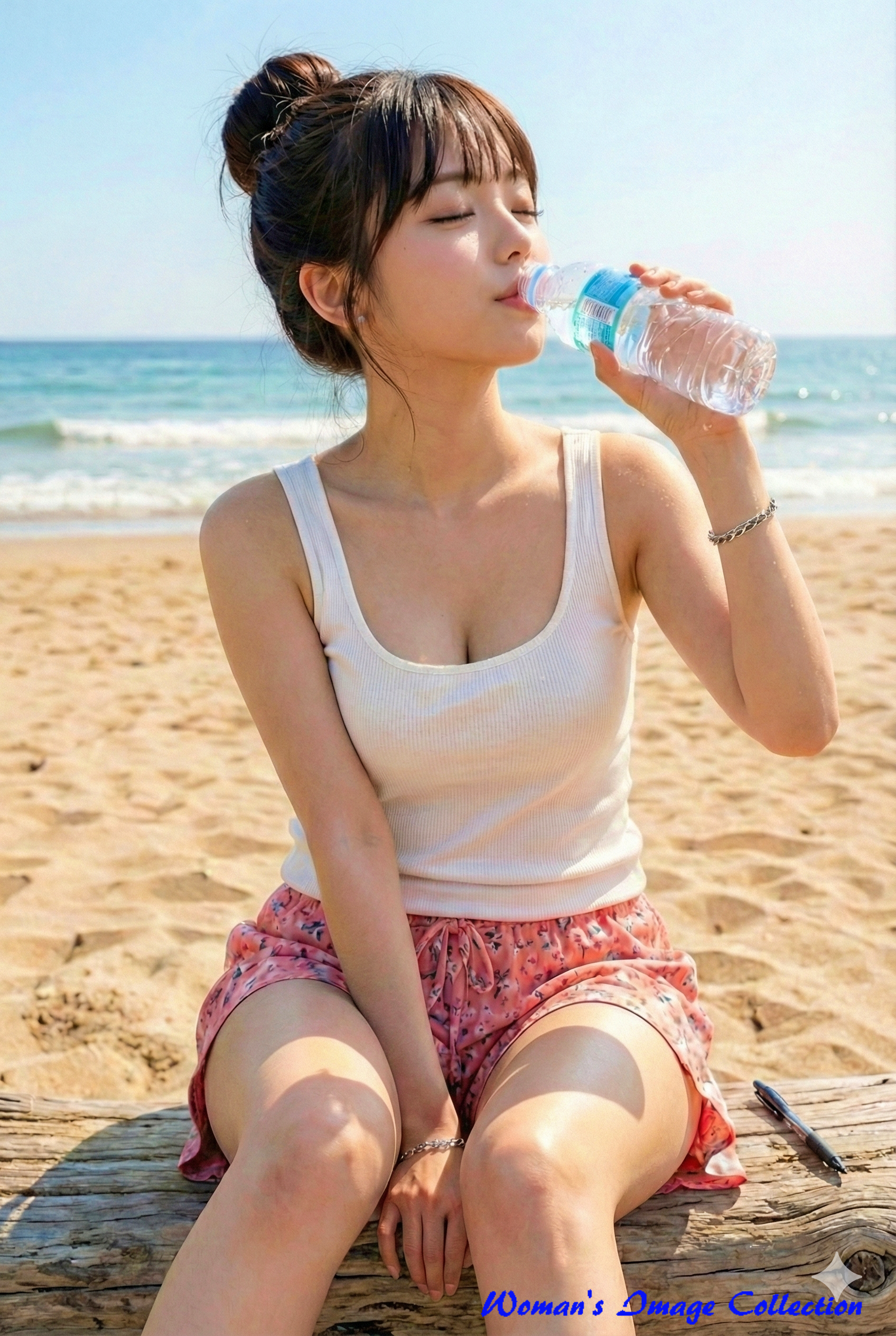 - 解説:構図の「 両手を脚の間に置いたポーズ, カメラを真っ直ぐに見つめている」を「ペットボトルの水を飲んでいる」に変更しています。女性の水を飲むシーンが美しく表現されています。