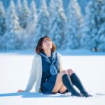 Angle: ローアングルにより女性のポーズと身体のライン、特に脚が長く見えるように強調