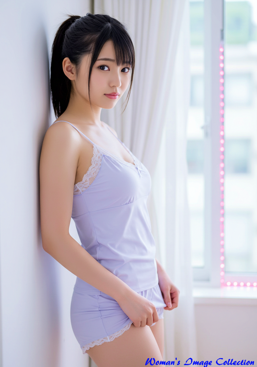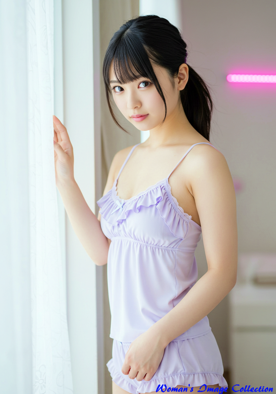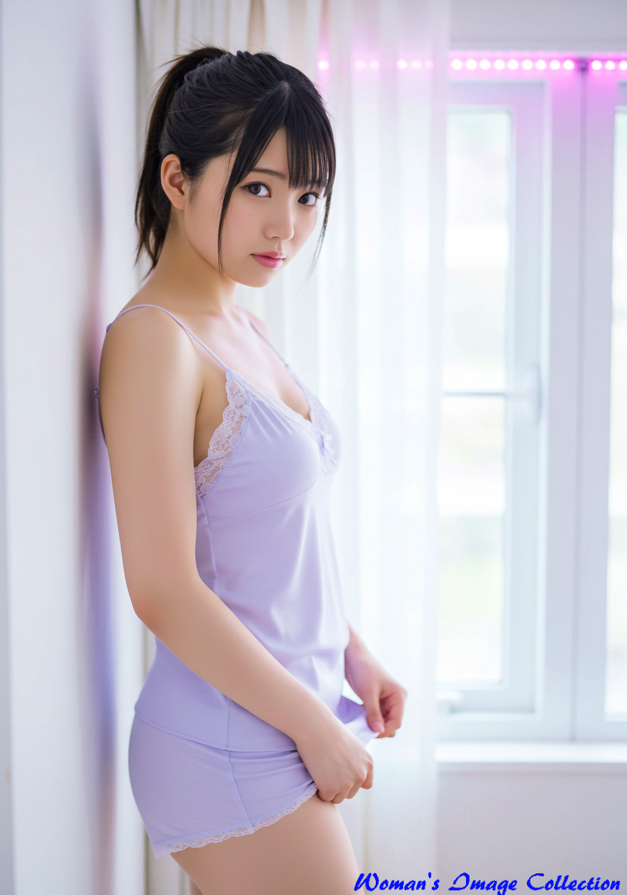 Subject (被写体): Type: 女性 Gender / Species: 豊満な美人な日本人女性 Age / Condition: 10代後半から20代前半、魅惑的 Features: ボリュームがあり髪が多い黒髪で上の方で結んだポニーテール、、色白、大きな瞳、あどけない顔つき Clothing / Equipment: 薄い紫色のキャミソール、同色のショートパンツ Emotion / Pose: ややうつむき加減、片手を壁につけ、もう一方の手でショートパンツの裾を軽く掴むポーズ Setting (場所・背景): Location Type: 屋内 Specific Location: 窓辺、明るい室内 Background Details: ぼやけた窓、白いカーテン、窓枠、ピンクのLEDライト Style (スタイル・画風): Art Style: 写実的、ポートレート Artist / Photographer: 篠山紀信のような柔らかな光の表現 Genre: ポートレート、ファッション写真 Medium: デジタル写真 Lighting & Atmosphere (光・雰囲気): Lighting Type: 自然光、逆光 Time of Day: 昼間 Color Palette: パステルカラー、暖色系、白、薄い紫 Mood / Atmosphere: 穏やか、ロマンチック、穏やか Composition & Angle (構図・アングル): Shot Type: 全身ショット Angle: 美しく見える構図 Perspective: 一人称視点 Framing: 左右非対称 Quality & Details (品質・詳細): Resolution: 超高解像度、8k Realism: フォトリアリスティック Modifiers: 傑作、最高品質、最高傑作、細部まで精密 Negative Prompt: 低画質、ぼやけた、奇形、不自然な手、変なポーズ、変な顔、変な目、ブレている