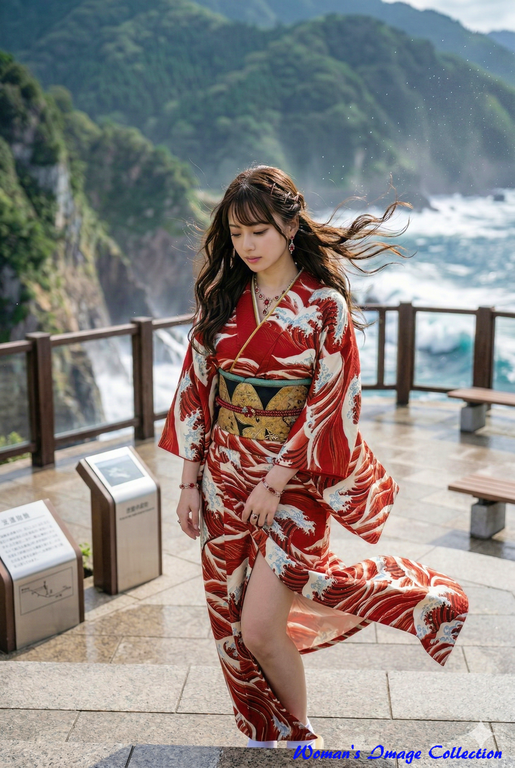 絶景の岬に立つ、北斎の波を描いた豪華着物の美女