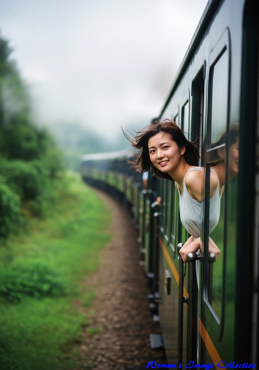 今回は山を走る蒸気機関車のドアから上体を出して外の景色と強い風を楽しんでいる少女のプロンプト。前回と同じようにチルトシフト効果を使ってみましたが、前回ほどの効果はなかったように思います。