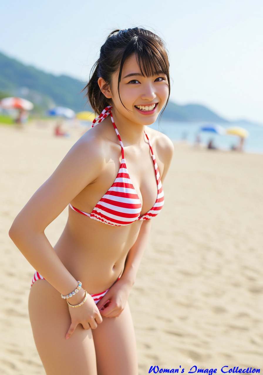 Subject (被写体): Type: 女性 Gender / Species: 可愛く美人な日本人女性 Age / Condition: 10代後半から20代前半 Features: ボリュームがあり髪が多い黒髪で上の方で結んだポニーテール、色白、丸い目、健康的で引き締まった体型、小顔 Clothing / Equipment: 赤と白のストライプのビキニ、腕にブレスレット Emotion / Pose: 満面の笑顔、片手を腰に当て、もう一方の手でビキニパンツの紐を掴む Setting (場所・背景): Location Type: 屋外 Specific Location: ビーチ、ライフガードステーション Background Details: ぼやけたビーチパラソル、砂浜、遠くに海 Style (スタイル・画風): Art Style: 写実的、繊細 Artist / Photographer: 篠山紀信のような柔らかな光の表現 Genre: ポートレート、ファッション写真 Medium: デジタル写真 Lighting & Atmosphere (光・雰囲気): Lighting Type: 強い日差し、自然光 Time of Day: 晴れた日の午後 Color Palette: 鮮やかな赤、白、青、暖色系 Mood / Atmosphere: 活気がある、楽しげ、開放的 Composition & Angle (構図・アングル): Shot Type: 全身ショット Angle: ややローアングル Perspective: 遠近感 Framing: ゴールデンアワー、左右対称、部分的に非対称箇所あり Quality & Details (品質・詳細): Resolution: 超高解像度、8k Realism: フォトリアリスティック Modifiers: 傑作、最高品質、最高傑作、細部まで精密 Negative Prompt: 低画質、ぼやけた、奇形、不自然な手、変なポーズ、変な顔、イラスト