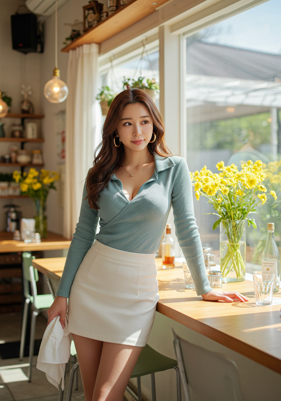 Emotion / Pose: 窓からの光を見つめるような、穏やかで自信に満ちた表情。カウンターのようなテーブルに寄りかかり、片手はテーブルに、もう一方の手で白い布を軽く持っているポーズ