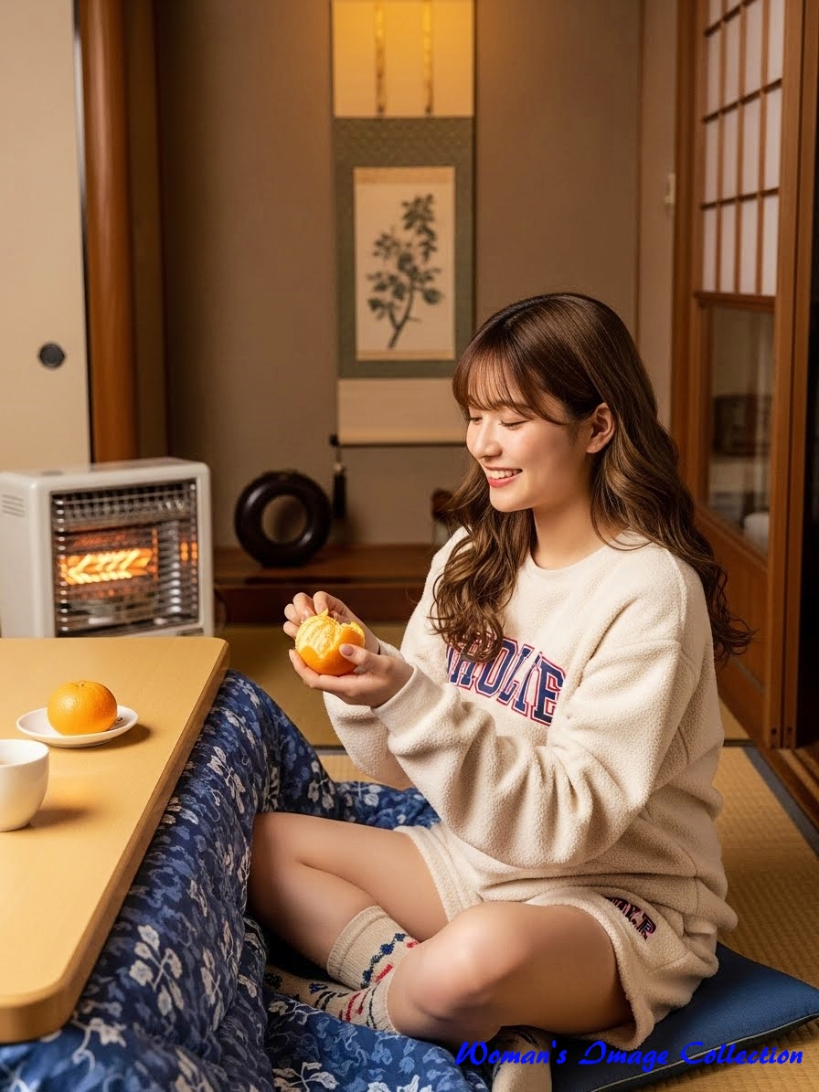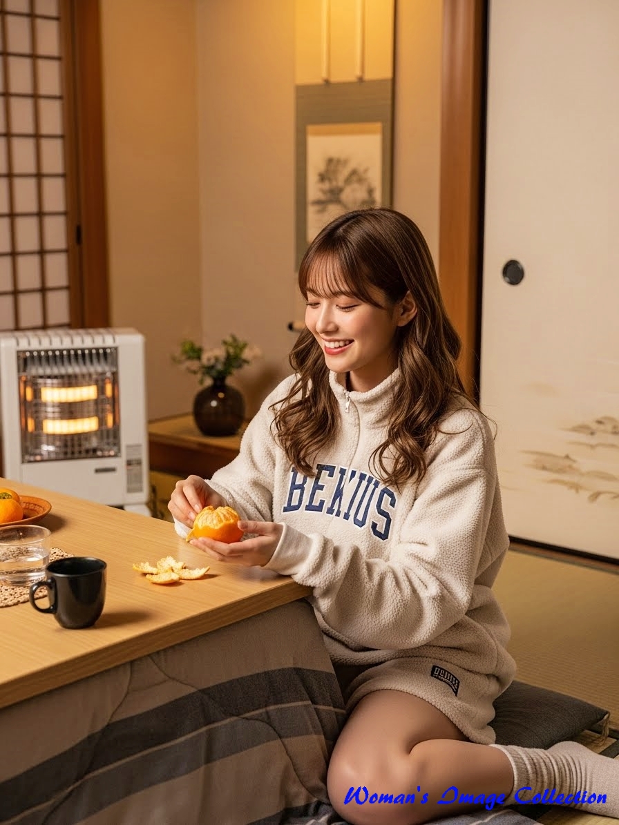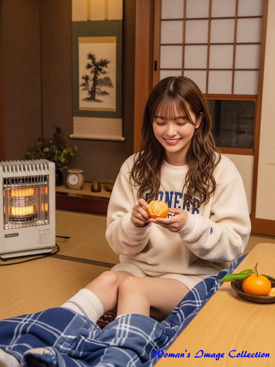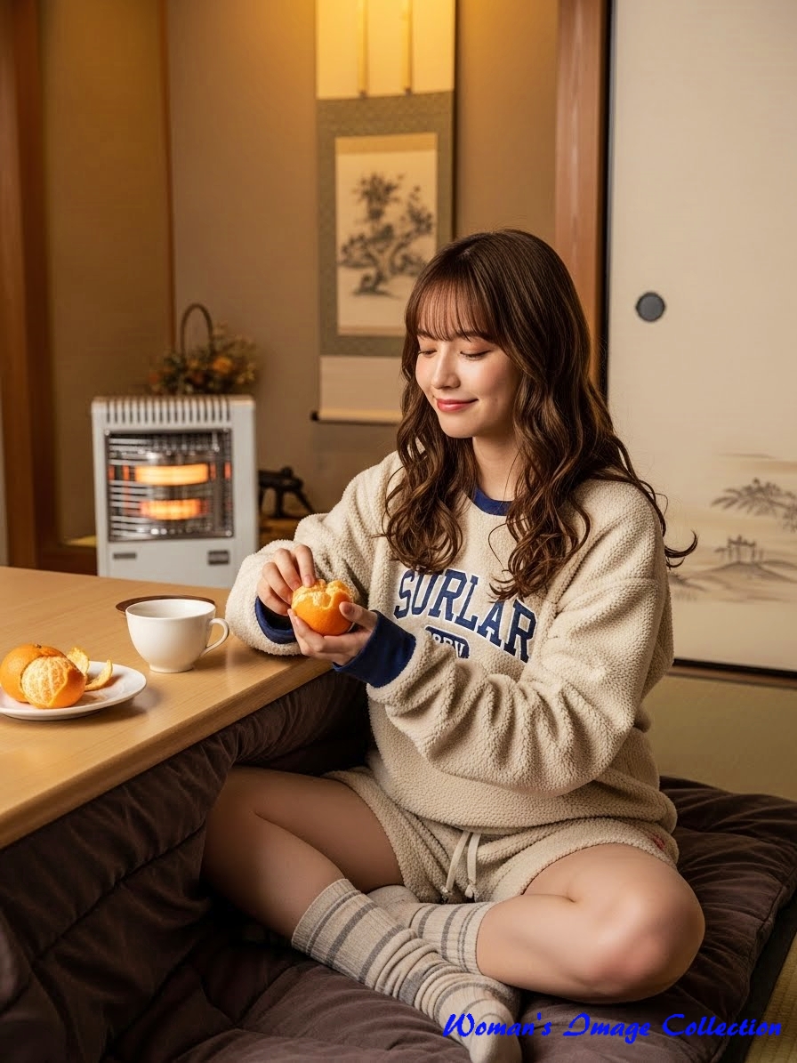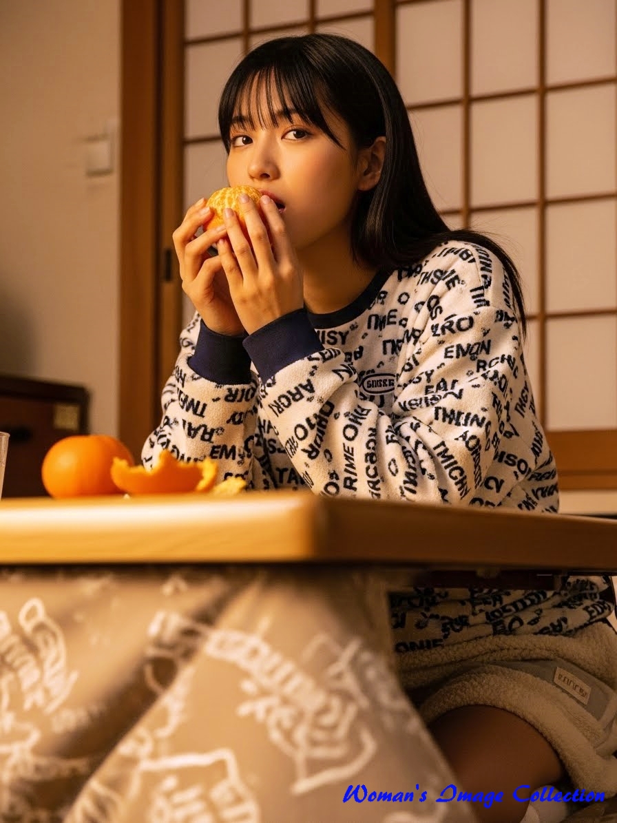 今回は、こたつに入って蜜柑を向いている女性のプロンプトです。