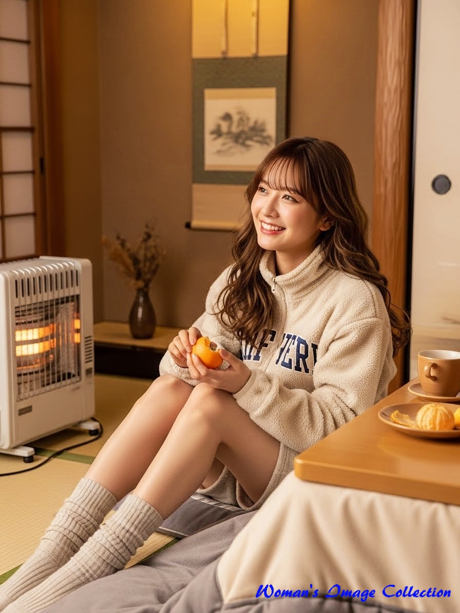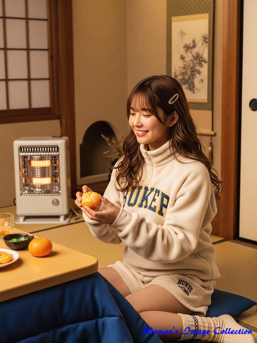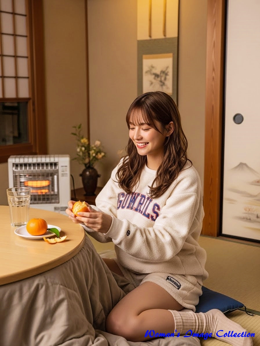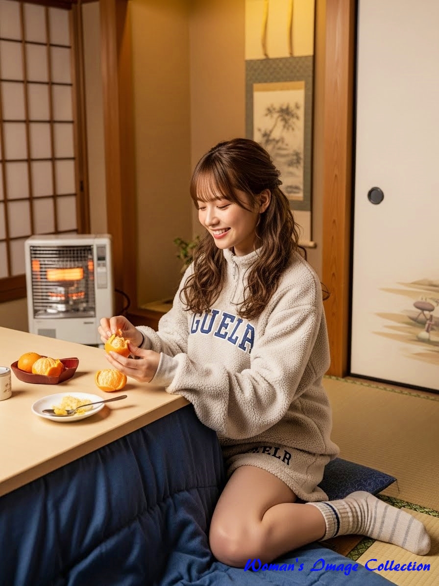 今回は、こたつに入って蜜柑を向いている女性のプロンプトです。