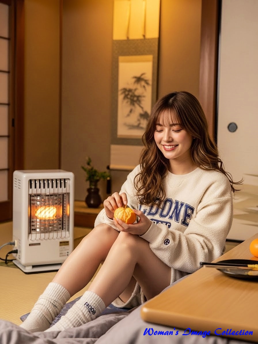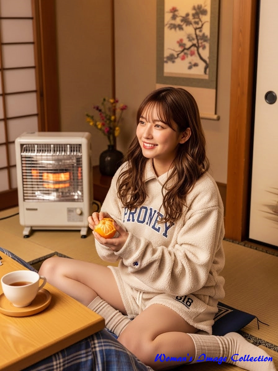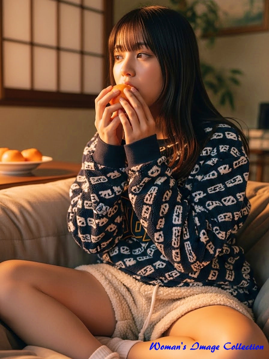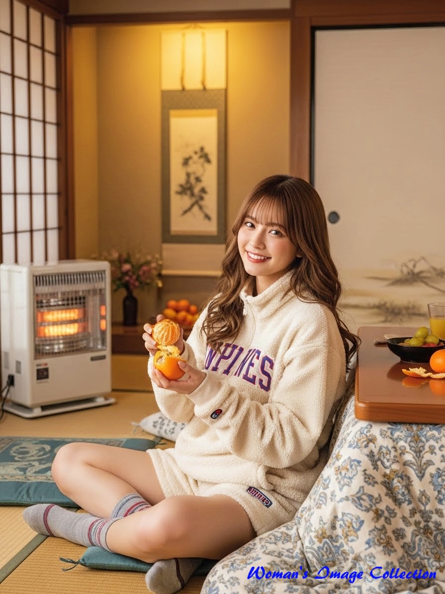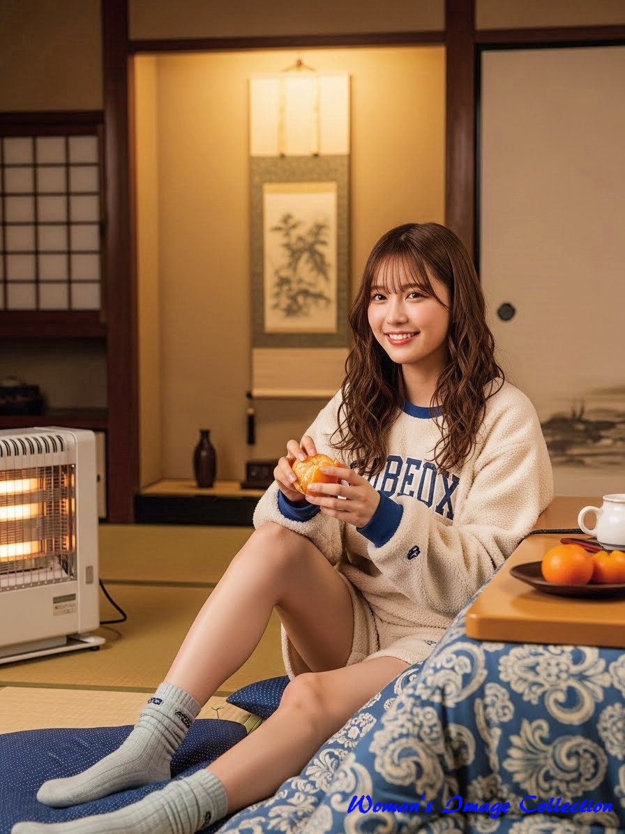 今回は、こたつに入って蜜柑を向いている女性のプロンプトです。