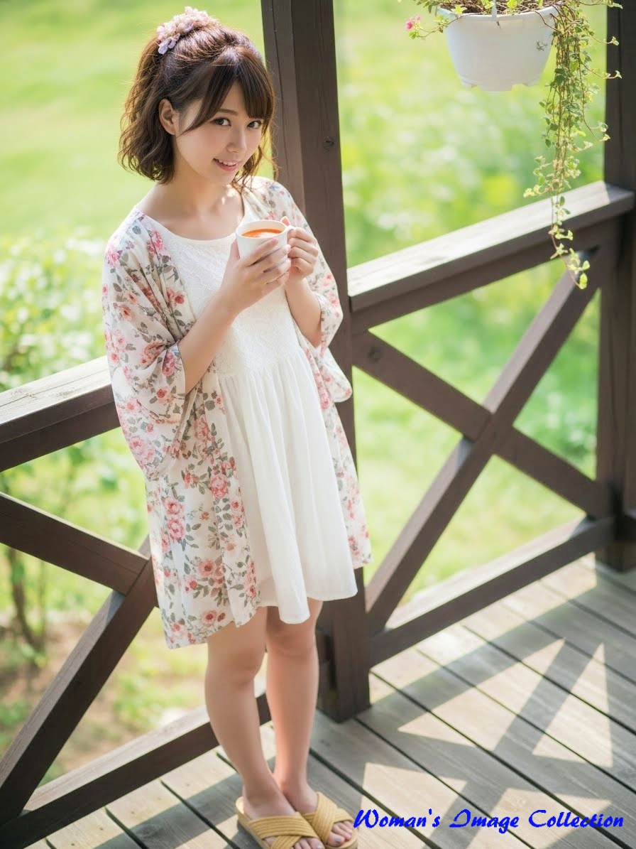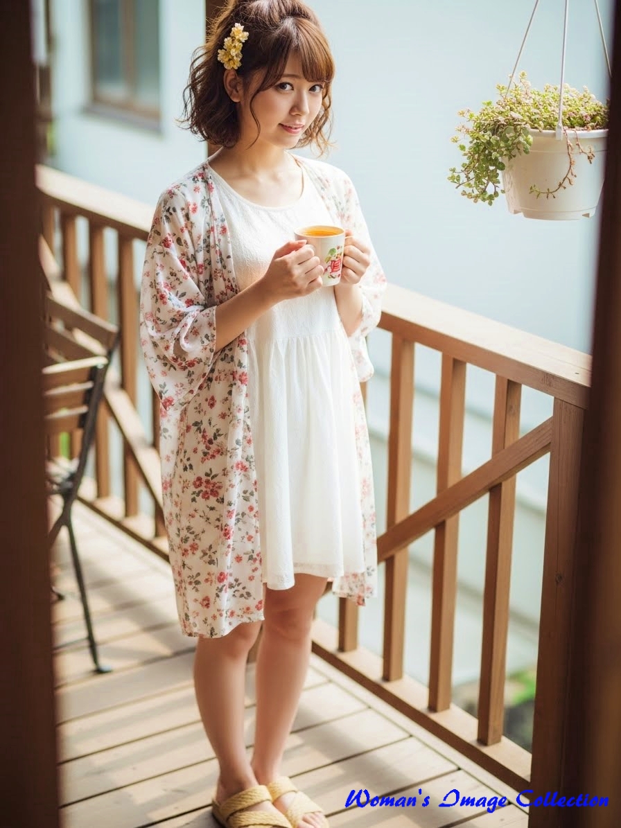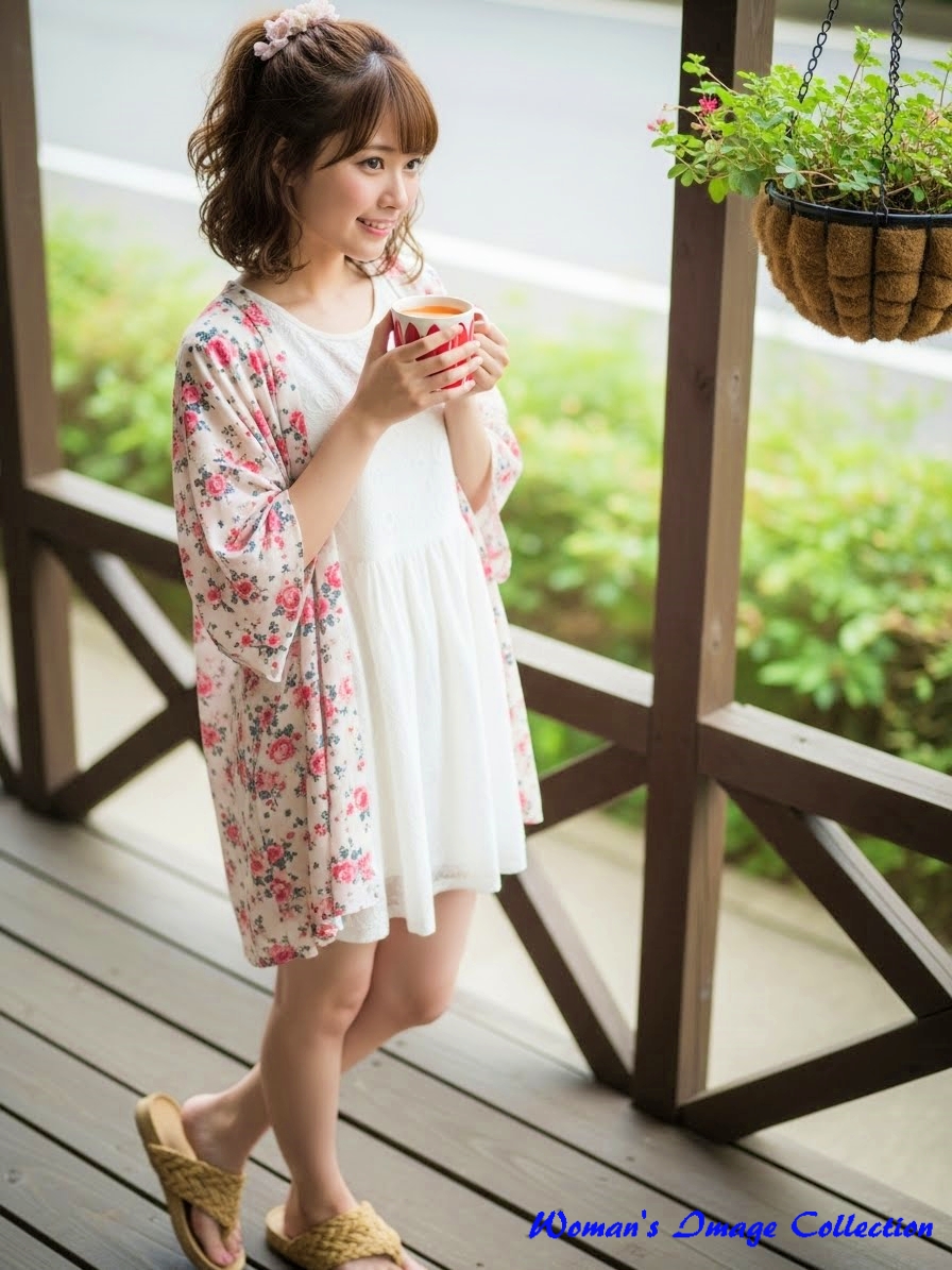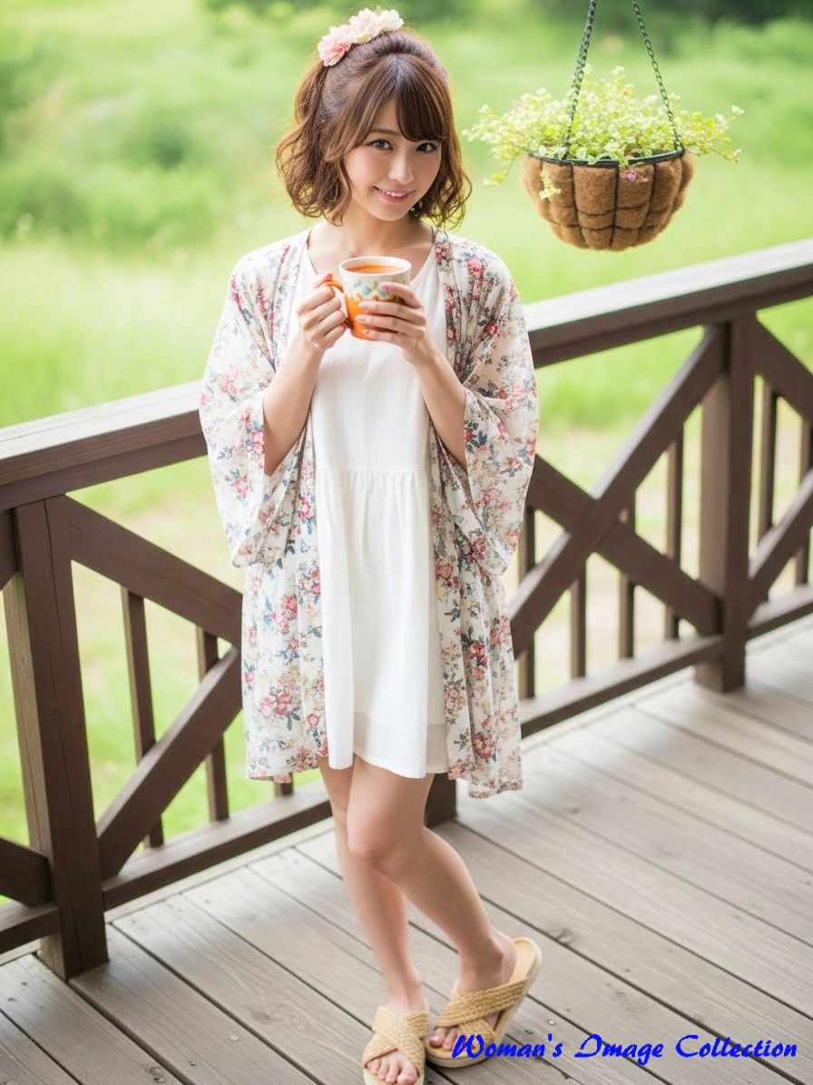 被写体 (短くウェーブのかかった茶色の髪を後ろでまとめた10代の少女, 白いワンピース, 花柄の薄い羽織り, 麦わら色のサンダル),
