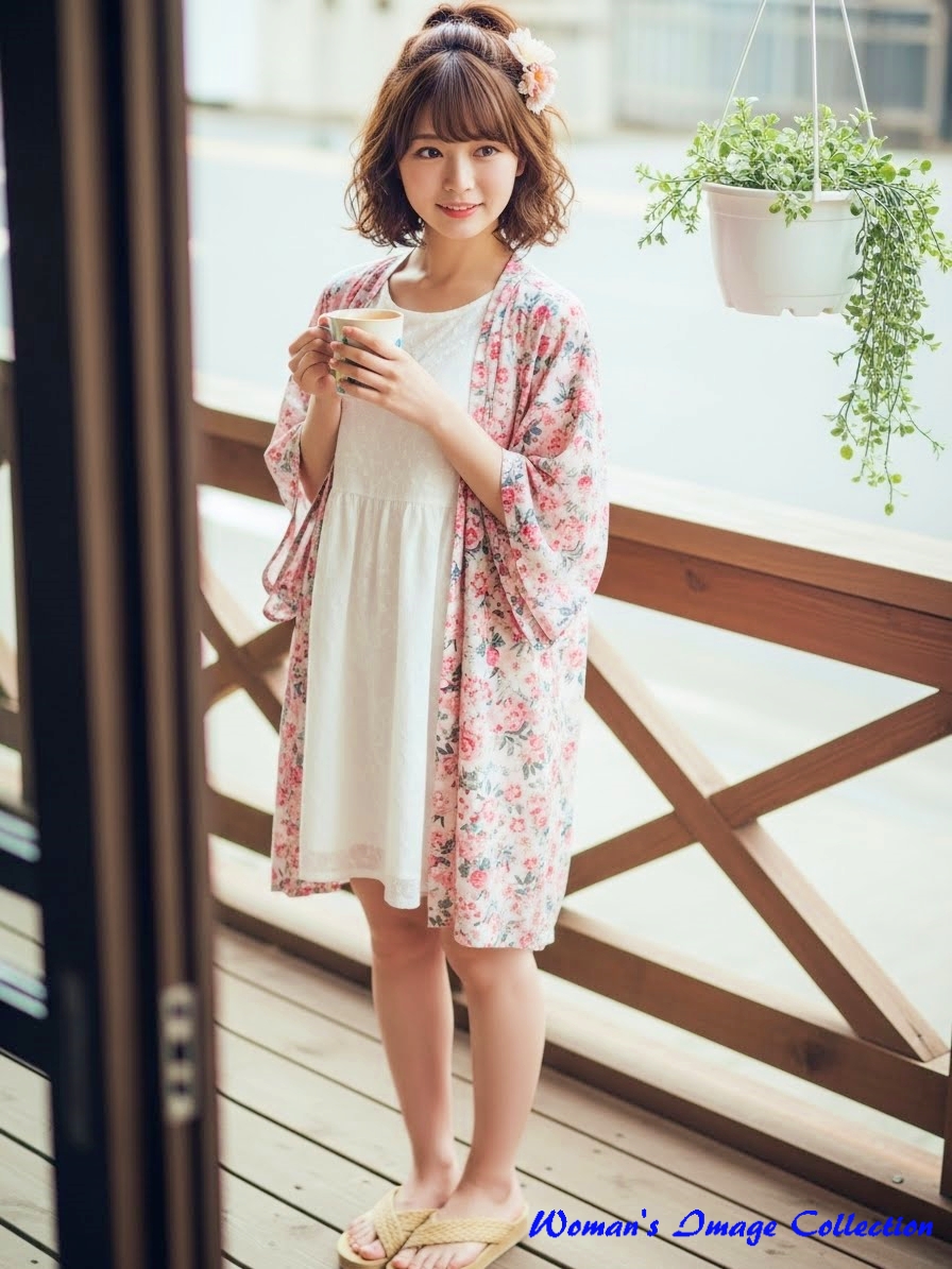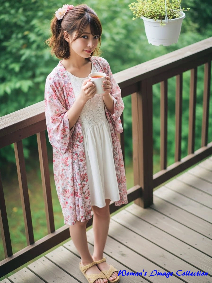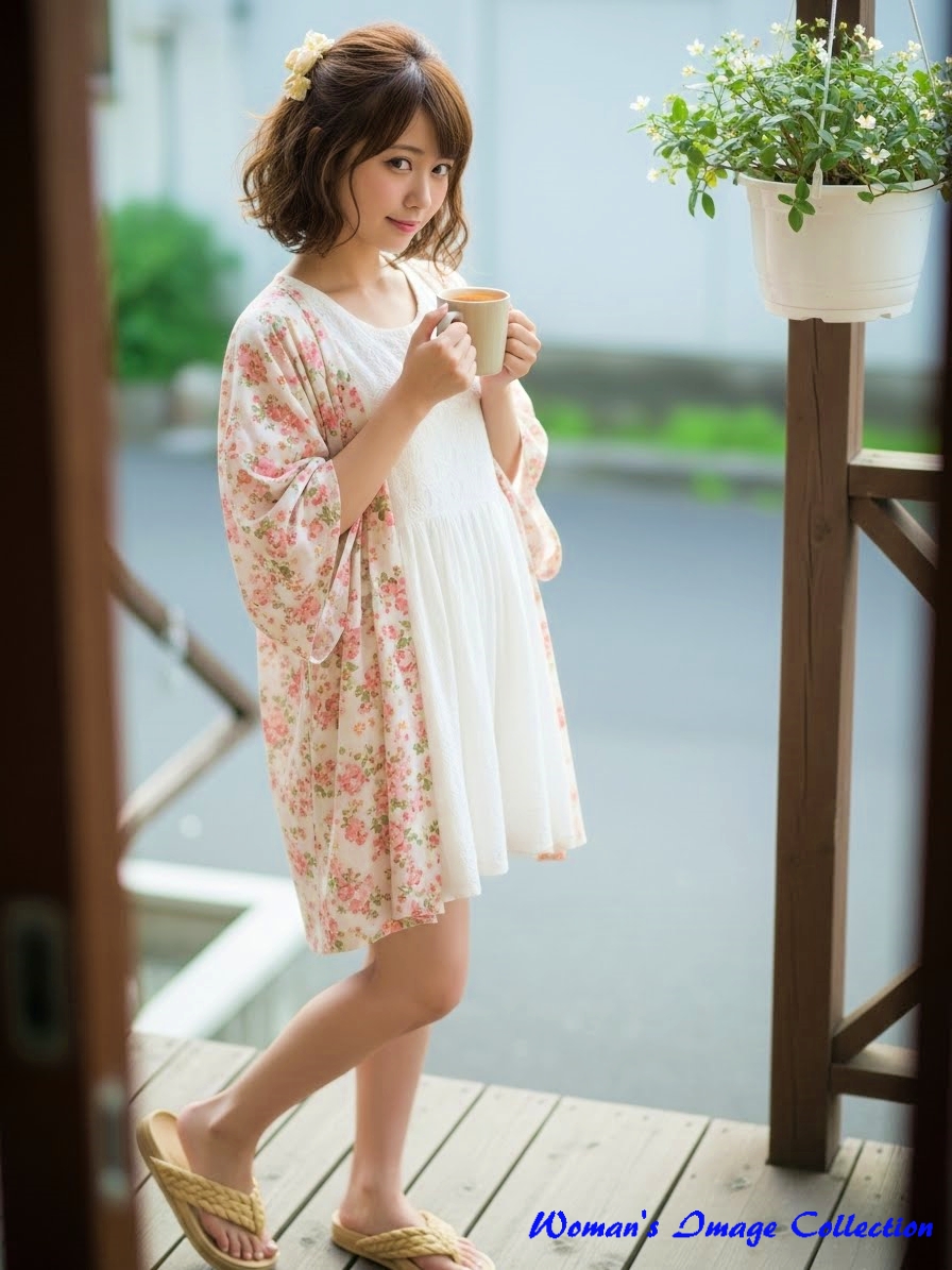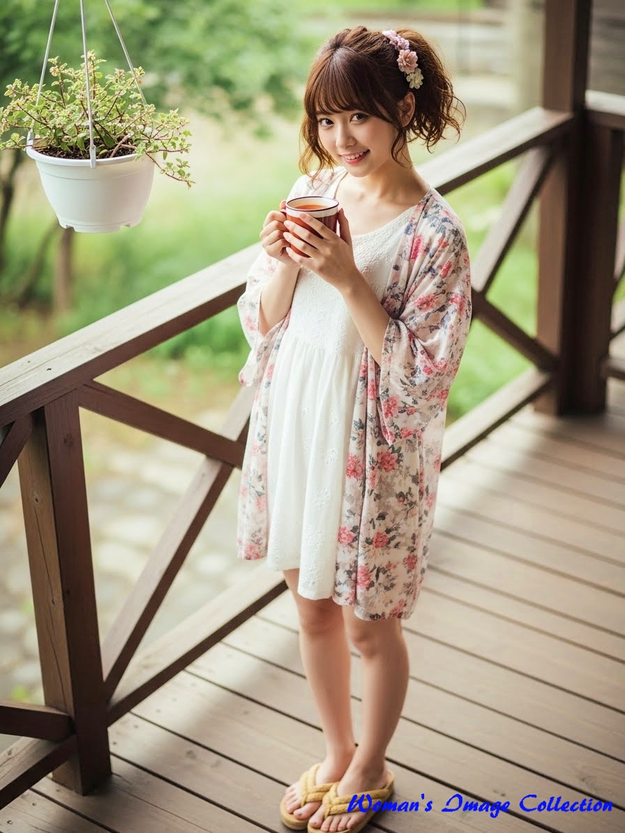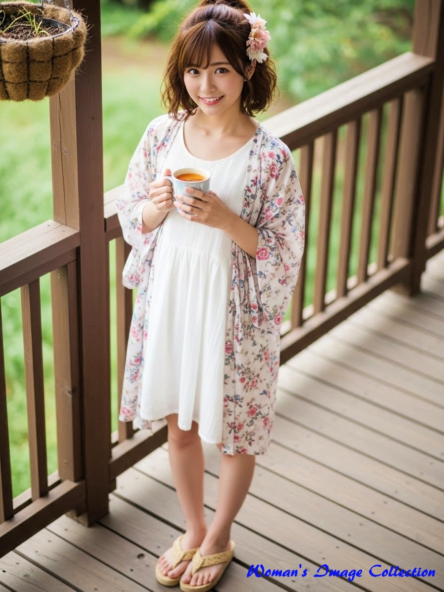 被写体 (短くウェーブのかかった茶色の髪を後ろでまとめた10代の少女, 白いワンピース, 花柄の薄い羽織り, 麦わら色のサンダル),