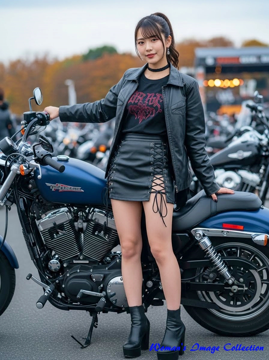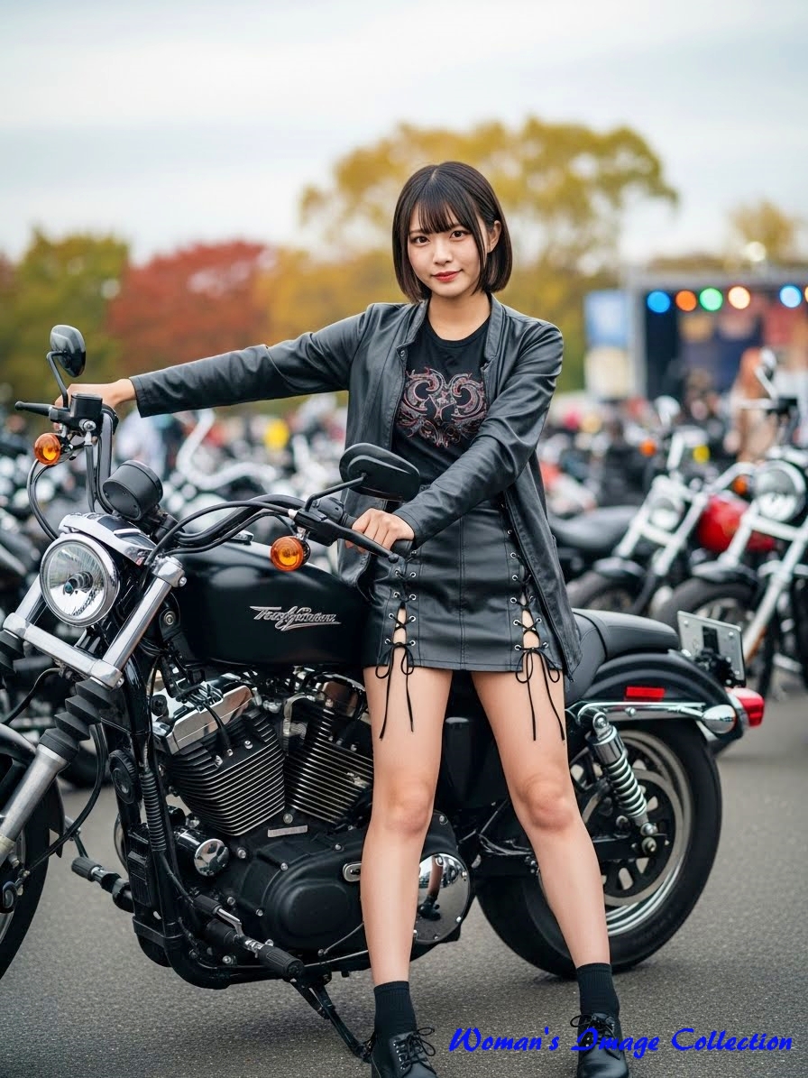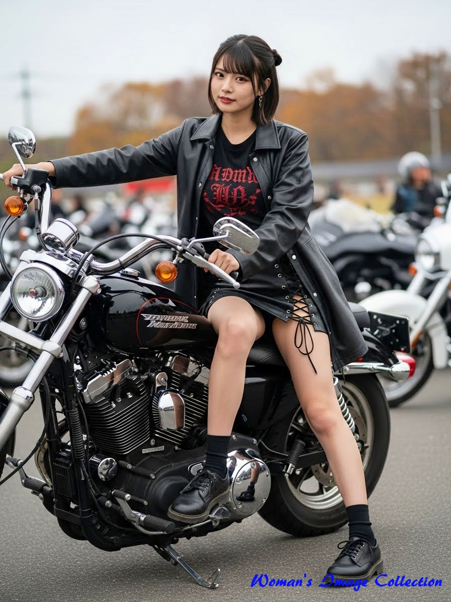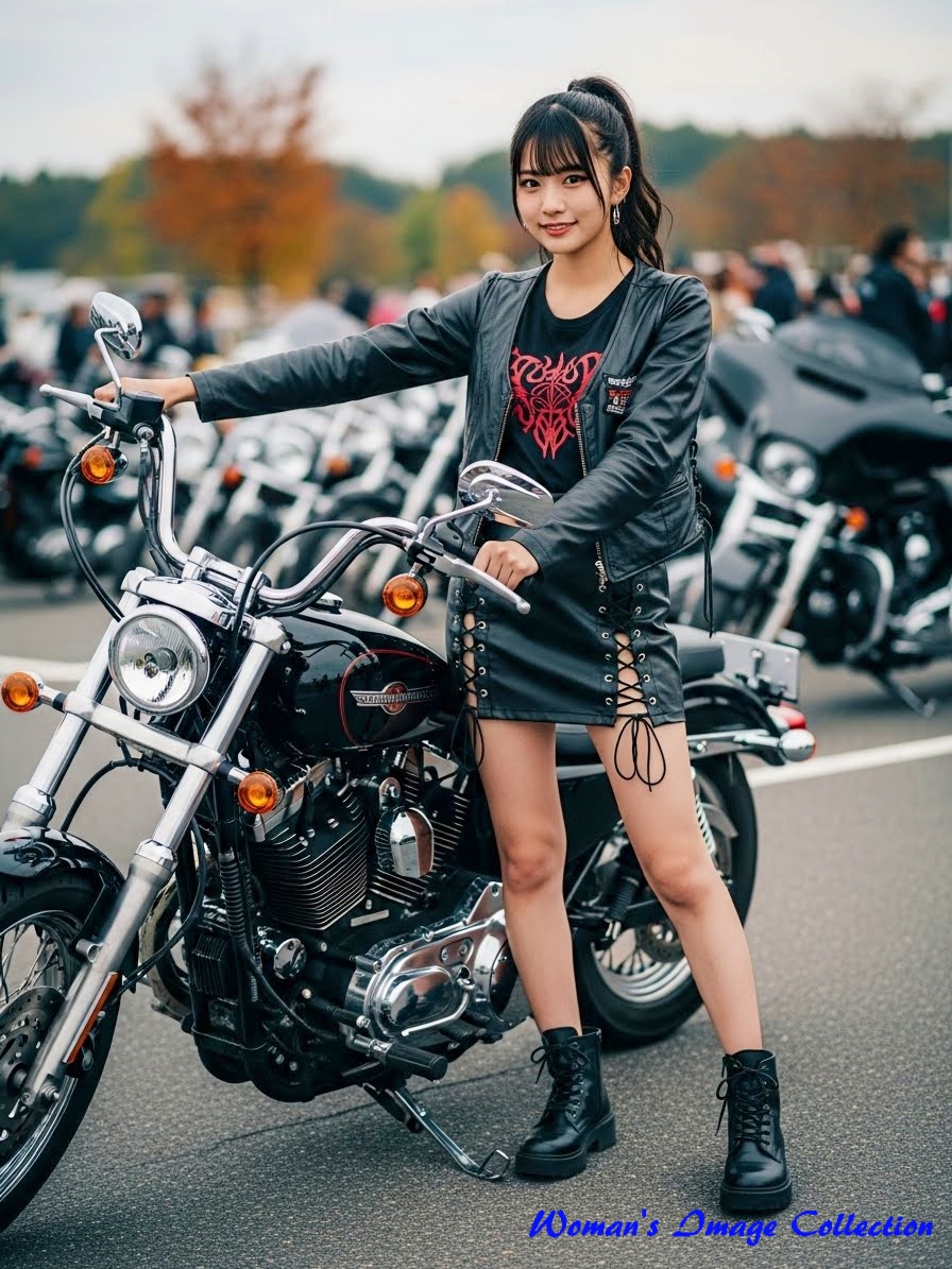 動作 (かわいい雰囲気, 笑顔, ハーレーの大型バイクに跨っている),
