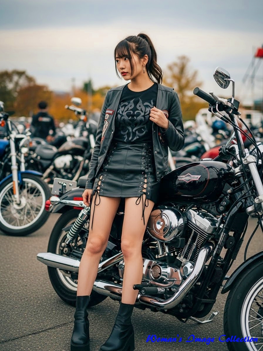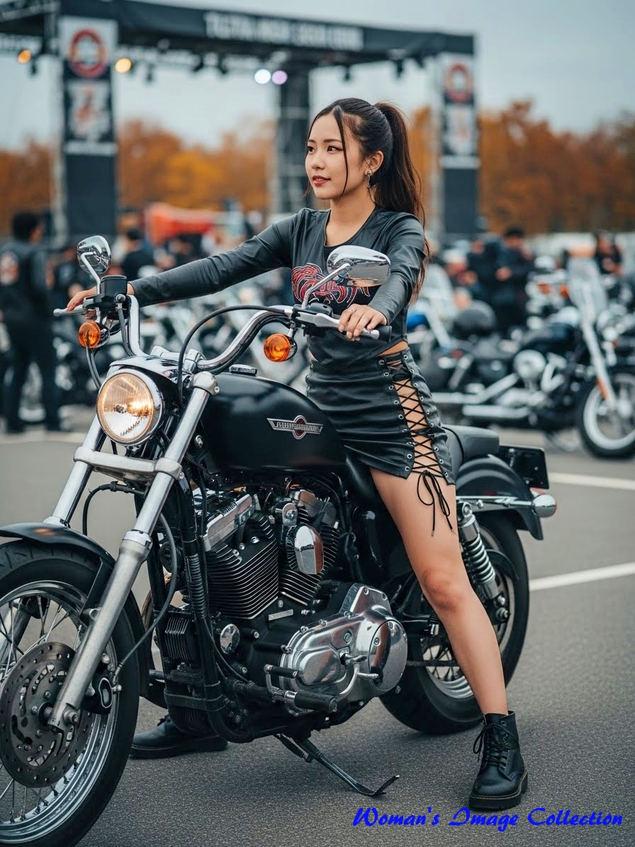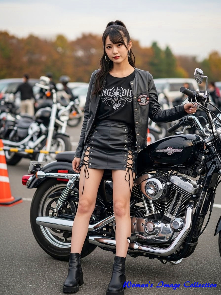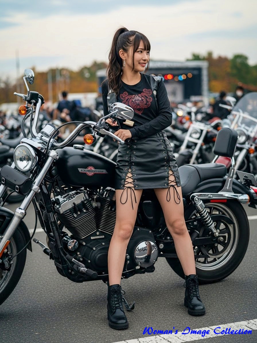 動作 (かわいい雰囲気, 笑顔, ハーレーの大型バイクに跨っている),