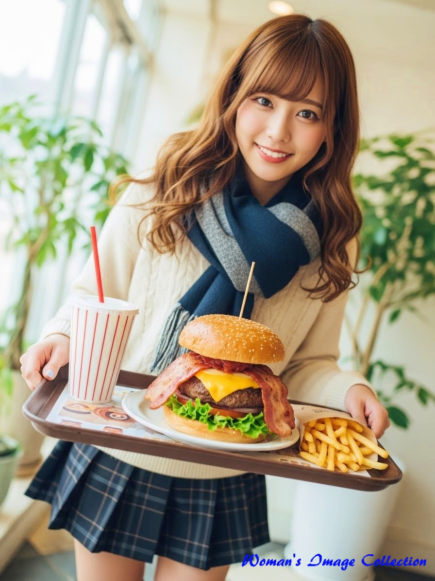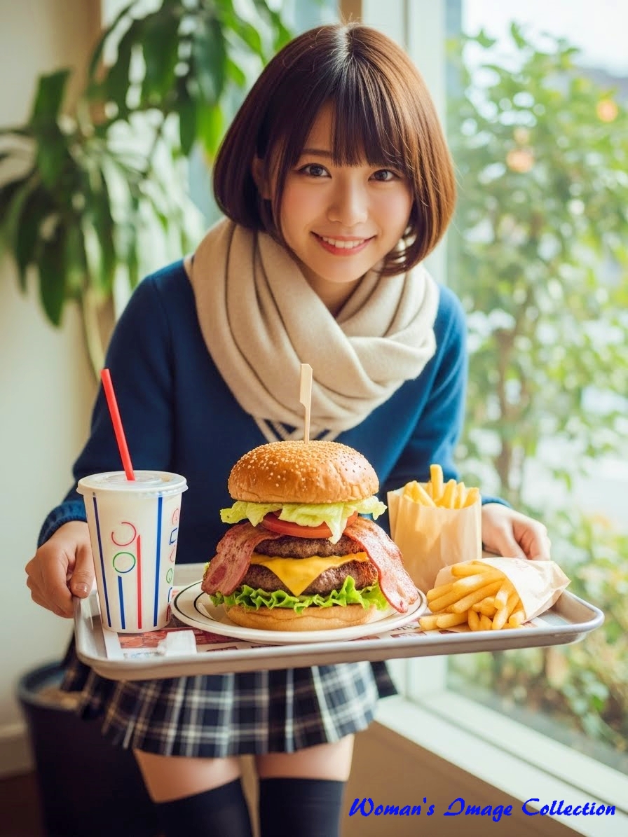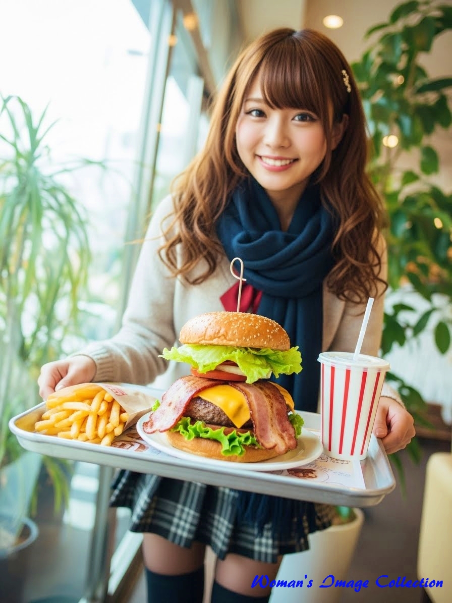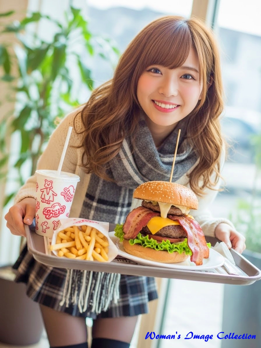 今回は、カフェでハンバーガーとフライドポテト、ジュースをトレイに乗せて微笑んでいる女性のプロンプトです。