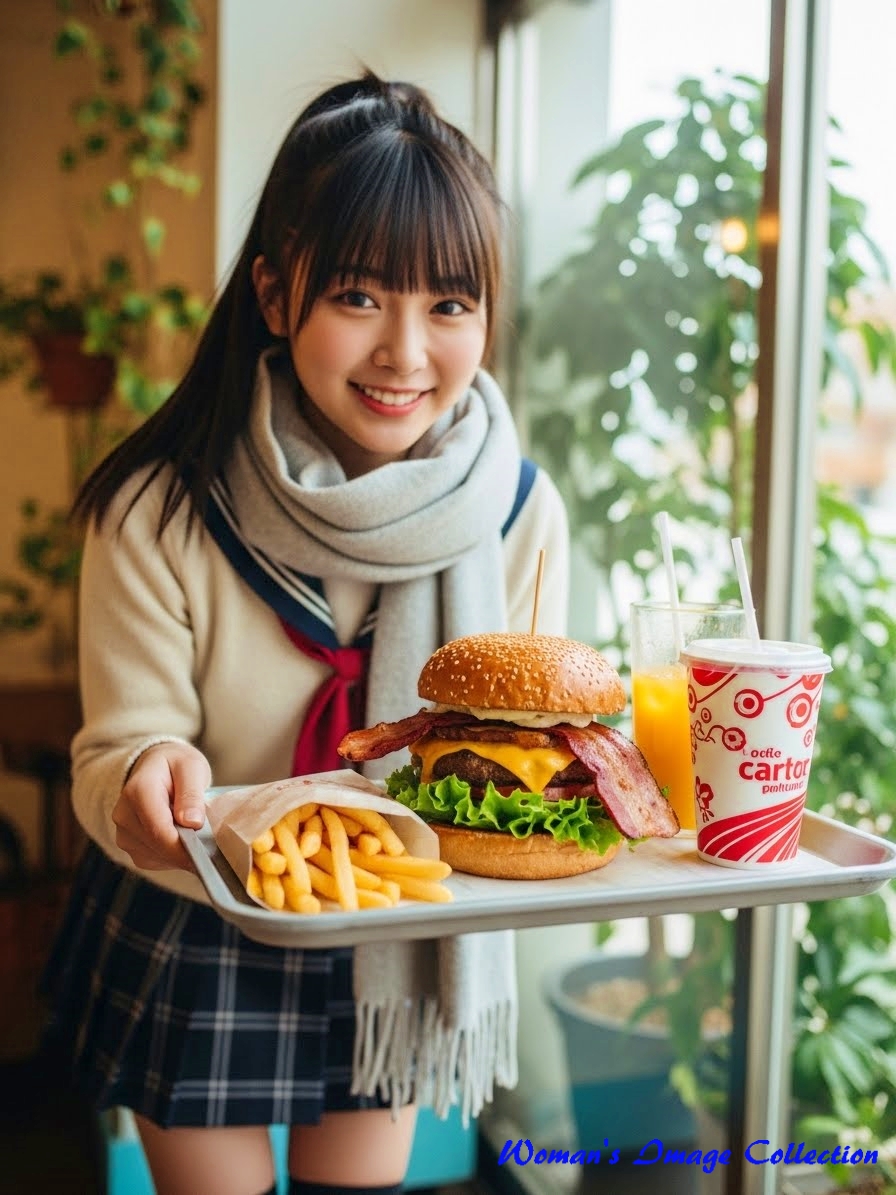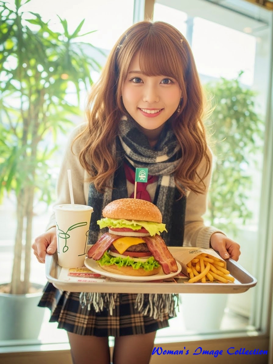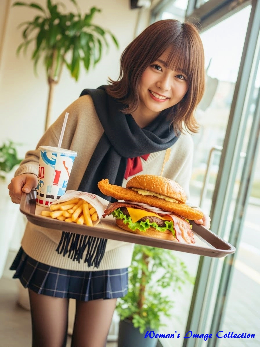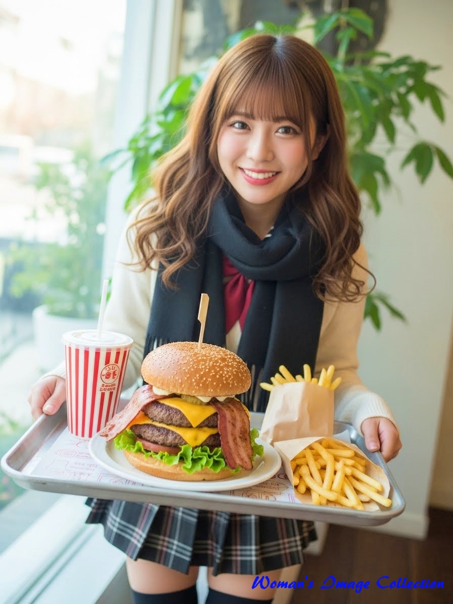 今回は、カフェでハンバーガーとフライドポテト、ジュースをトレイに乗せて微笑んでいる女性のプロンプトです。
