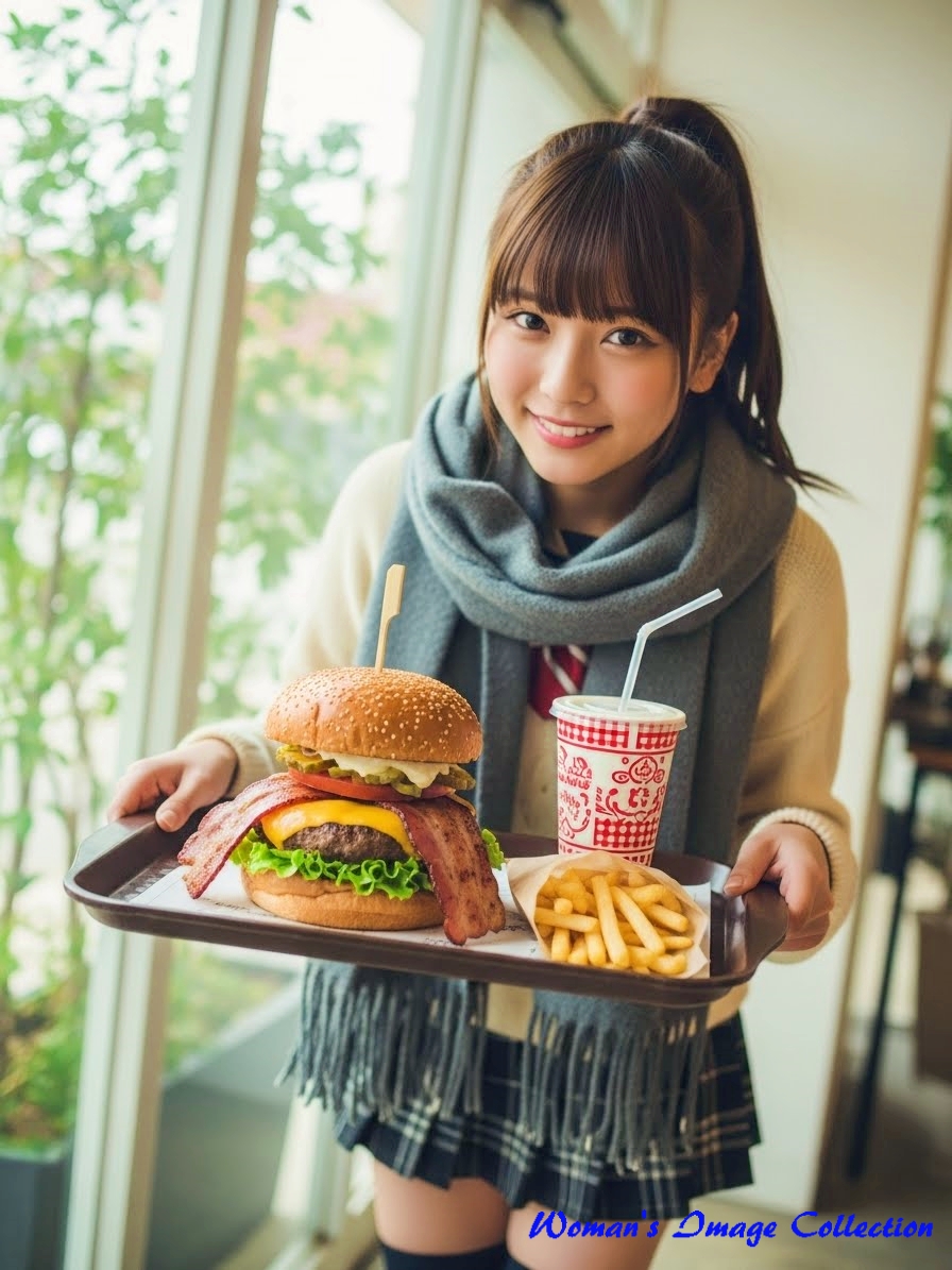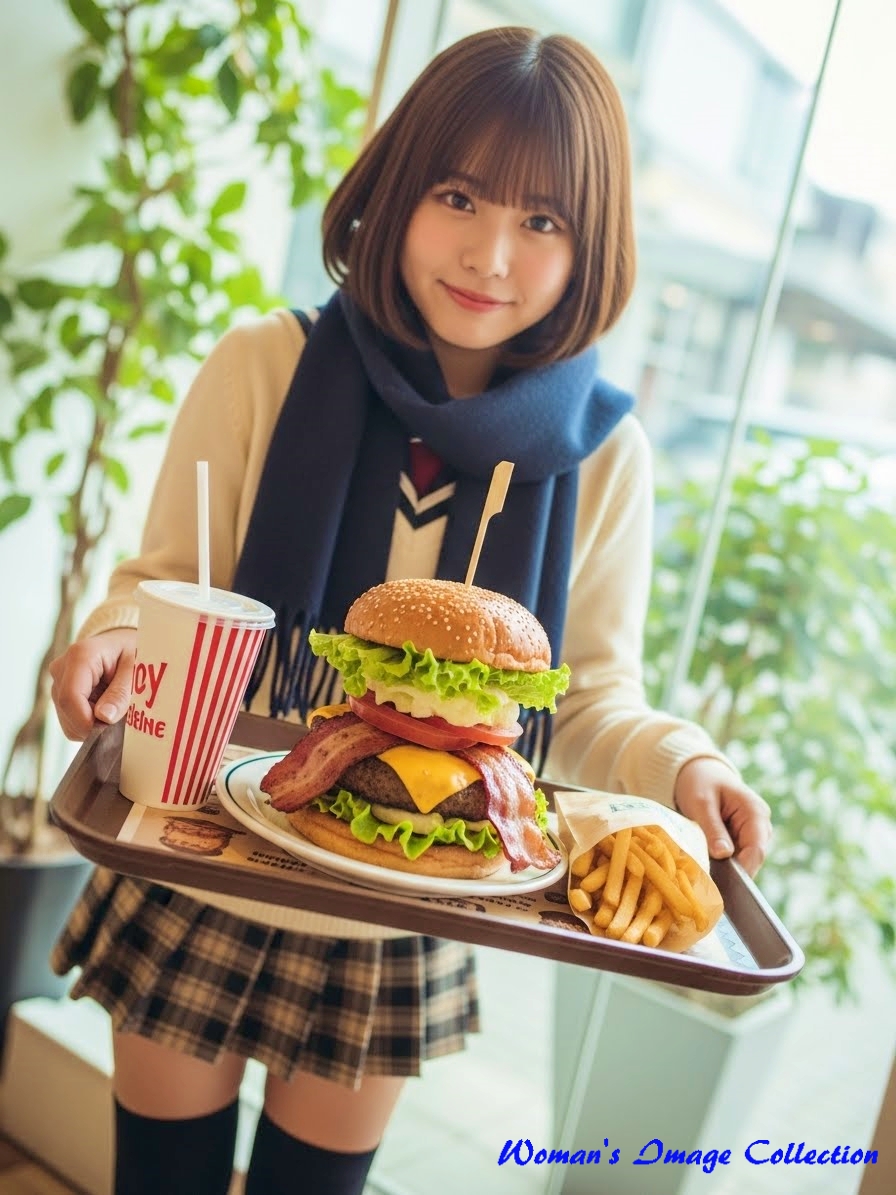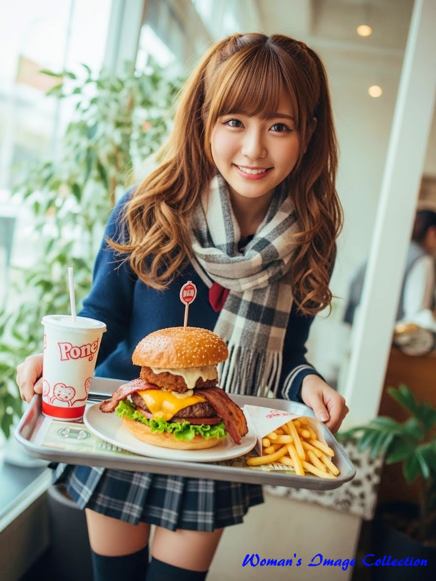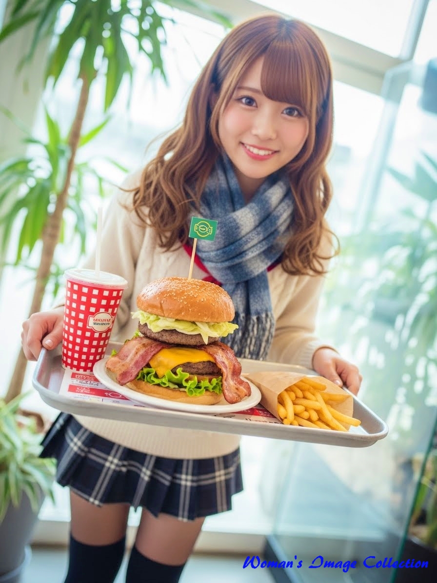 今回は、カフェでハンバーガーとフライドポテト、ジュースをトレイに乗せて微笑んでいる女性のプロンプトです。