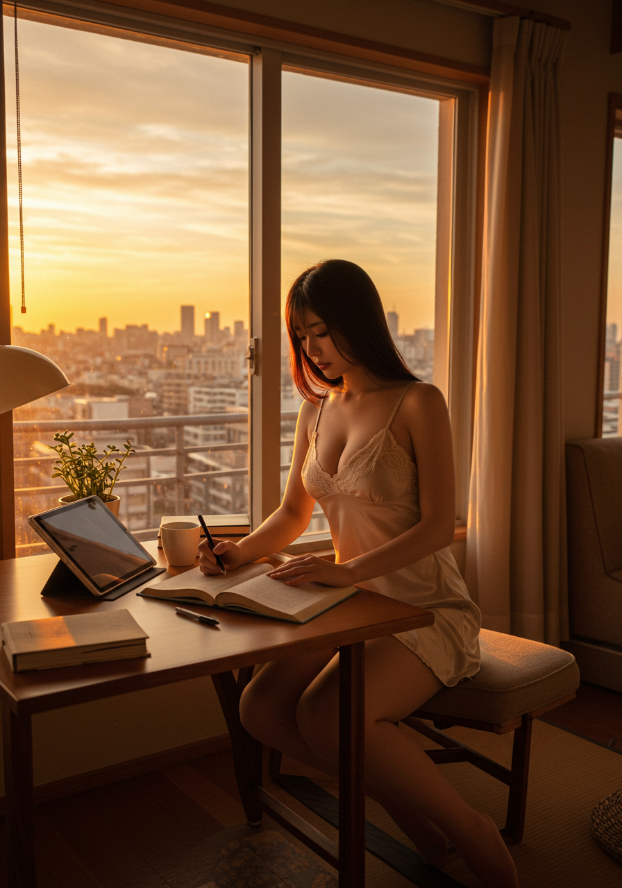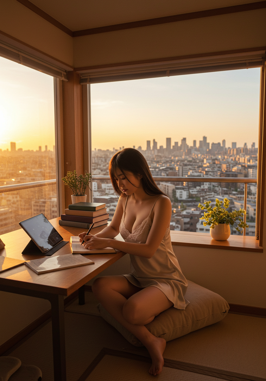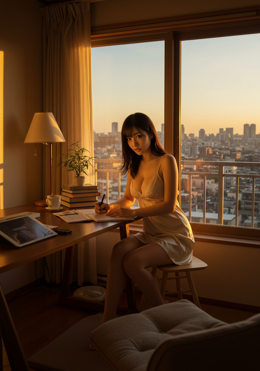 「女性にズームした効果。官能的で豊満な日本人女性。ミニマリスト風のアパートで、キャミソールドレス姿の日本人女性が机に向かって勉強するリアルな写真。彼女は机にもたれかかってあぐらをかき、ペンを握っている。部屋は夕日の温かく自然な光に満たされている。机の上にはタブレット、本、鉢植えが置かれ、窓の外には美しい街並みが広がっている。光と影に焦点を当てたこの高解像度写真は、静かで穏やか、そしてノスタルジックな雰囲気を伝えている。」
