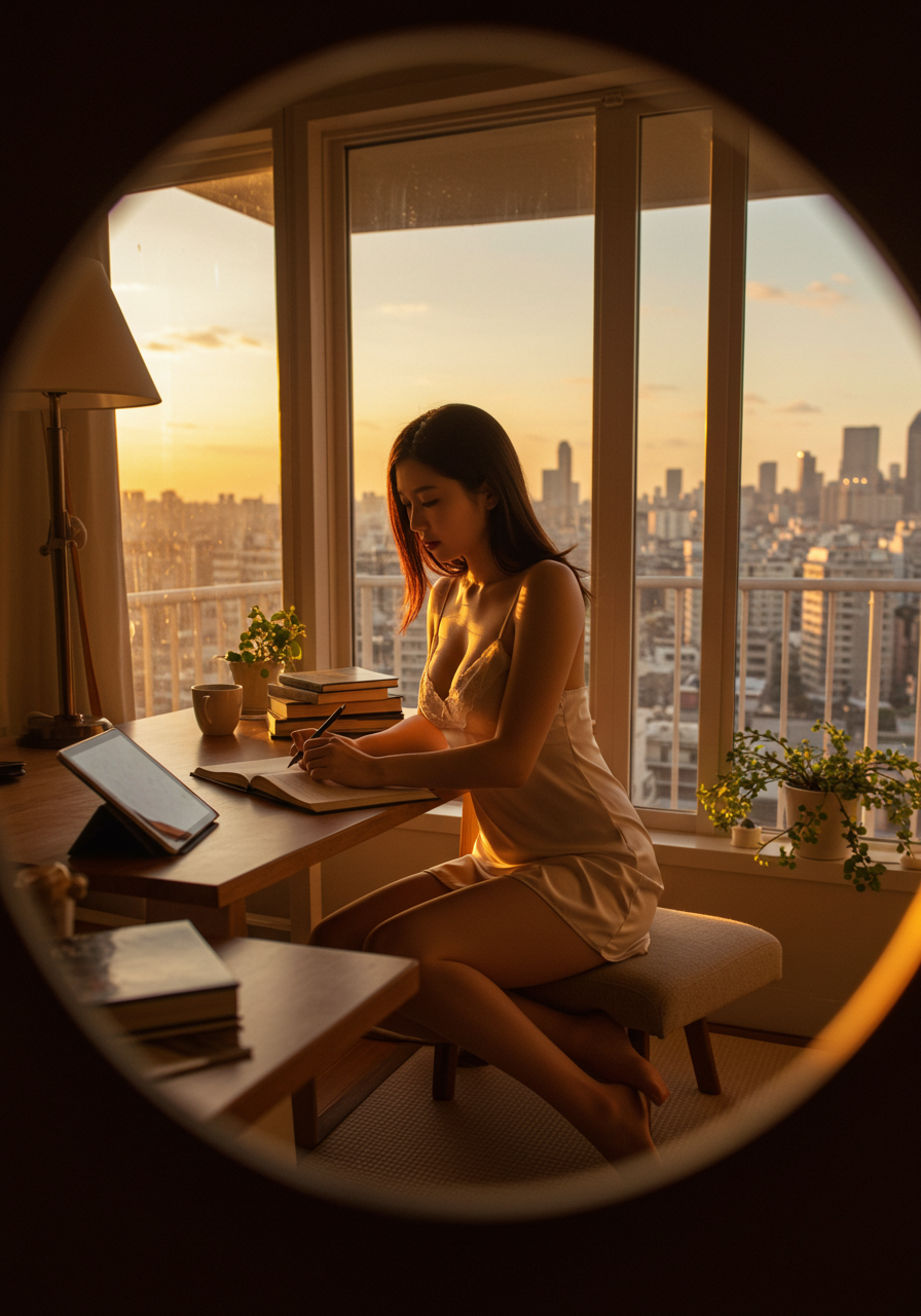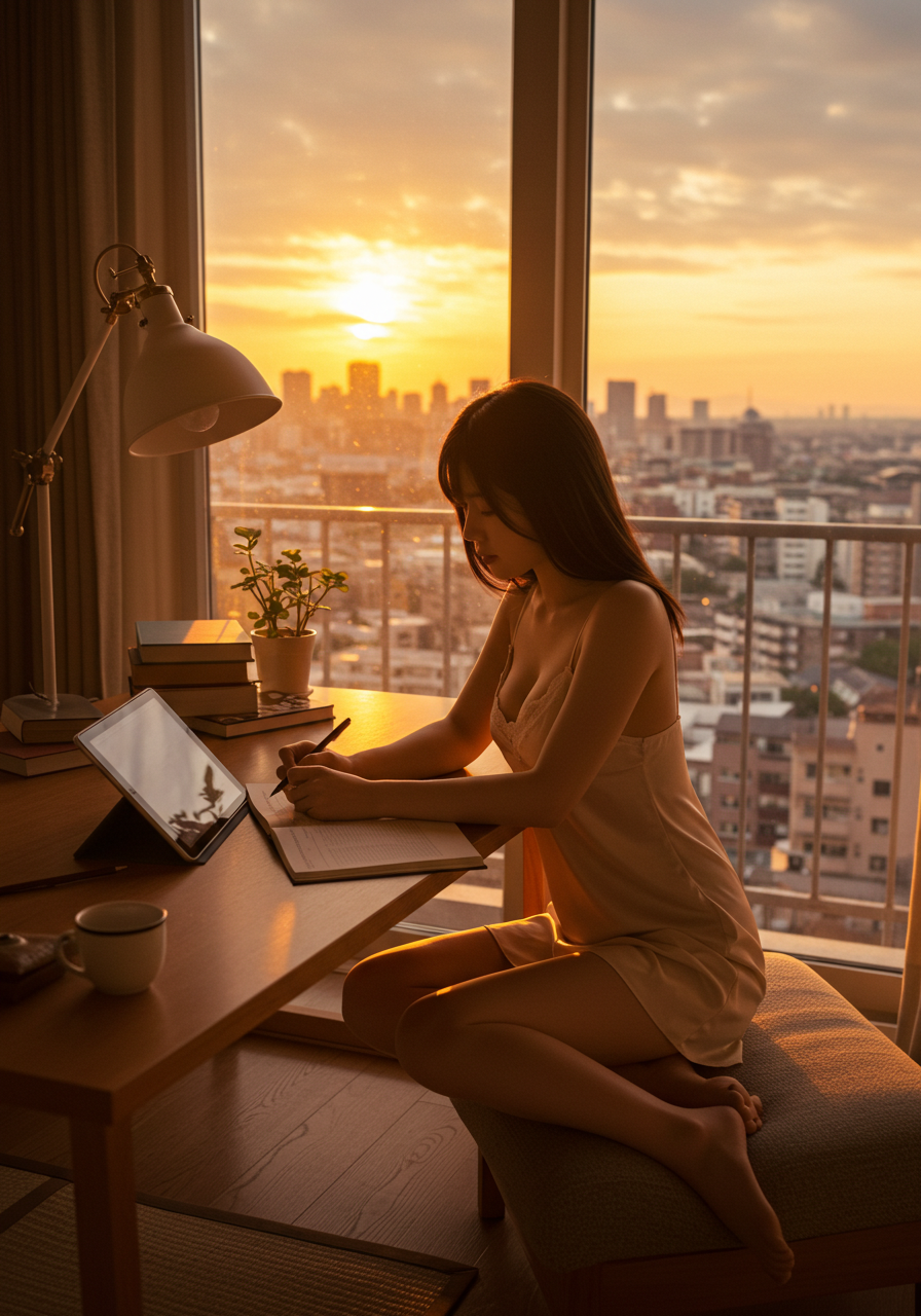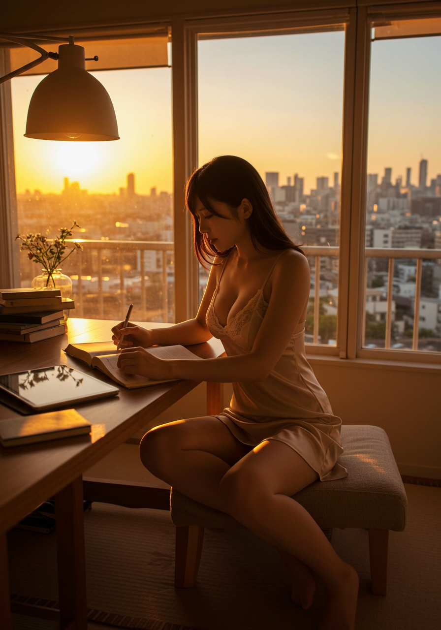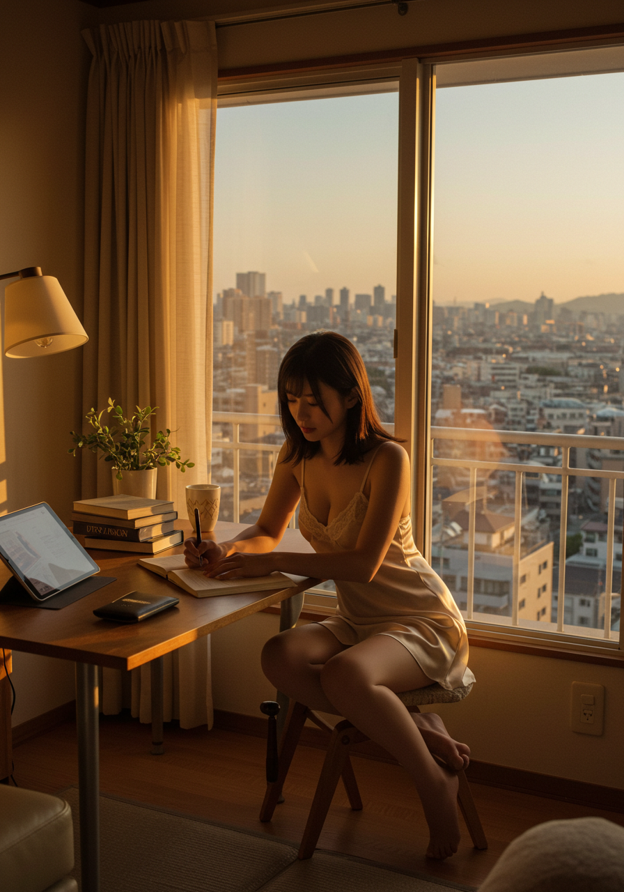 「女性にズームした効果。官能的で豊満な日本人女性。ミニマリスト風のアパートで、キャミソールドレス姿の日本人女性が机に向かって勉強するリアルな写真。彼女は机にもたれかかってあぐらをかき、ペンを握っている。部屋は夕日の温かく自然な光に満たされている。机の上にはタブレット、本、鉢植えが置かれ、窓の外には美しい街並みが広がっている。光と影に焦点を当てたこの高解像度写真は、静かで穏やか、そしてノスタルジックな雰囲気を伝えている。」