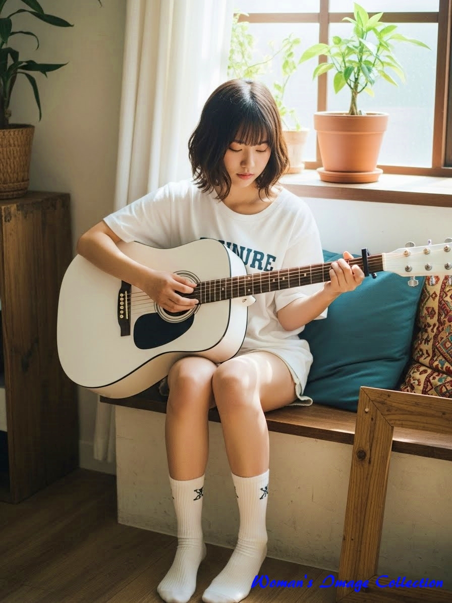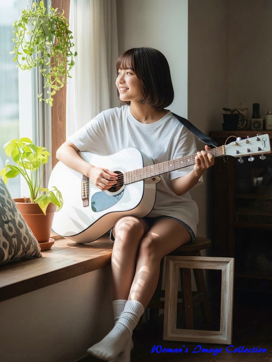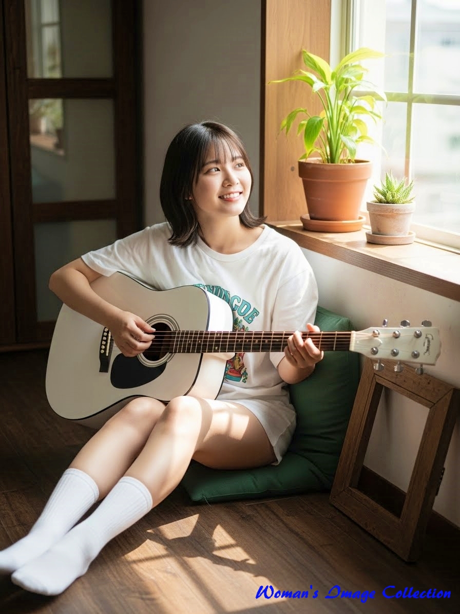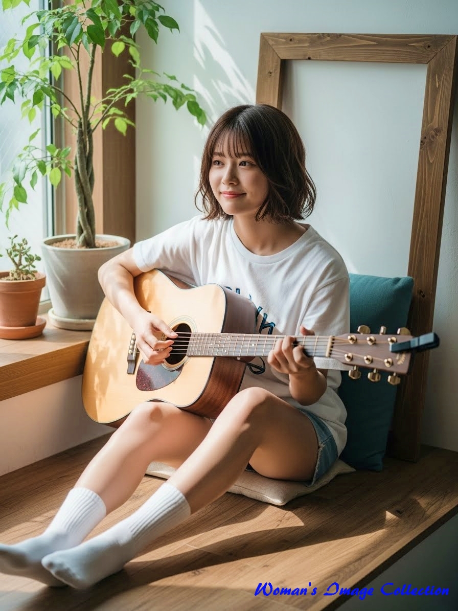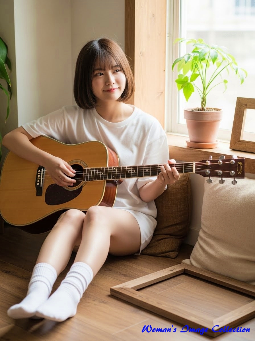 今回は、窓から入る自然光で明るい部屋でギターを弾いている女性のプロンプトです。