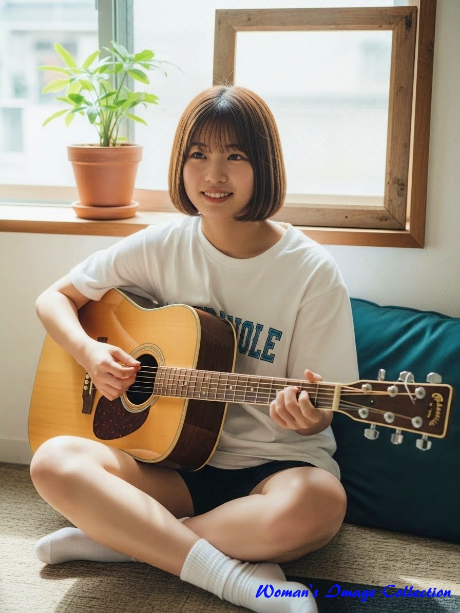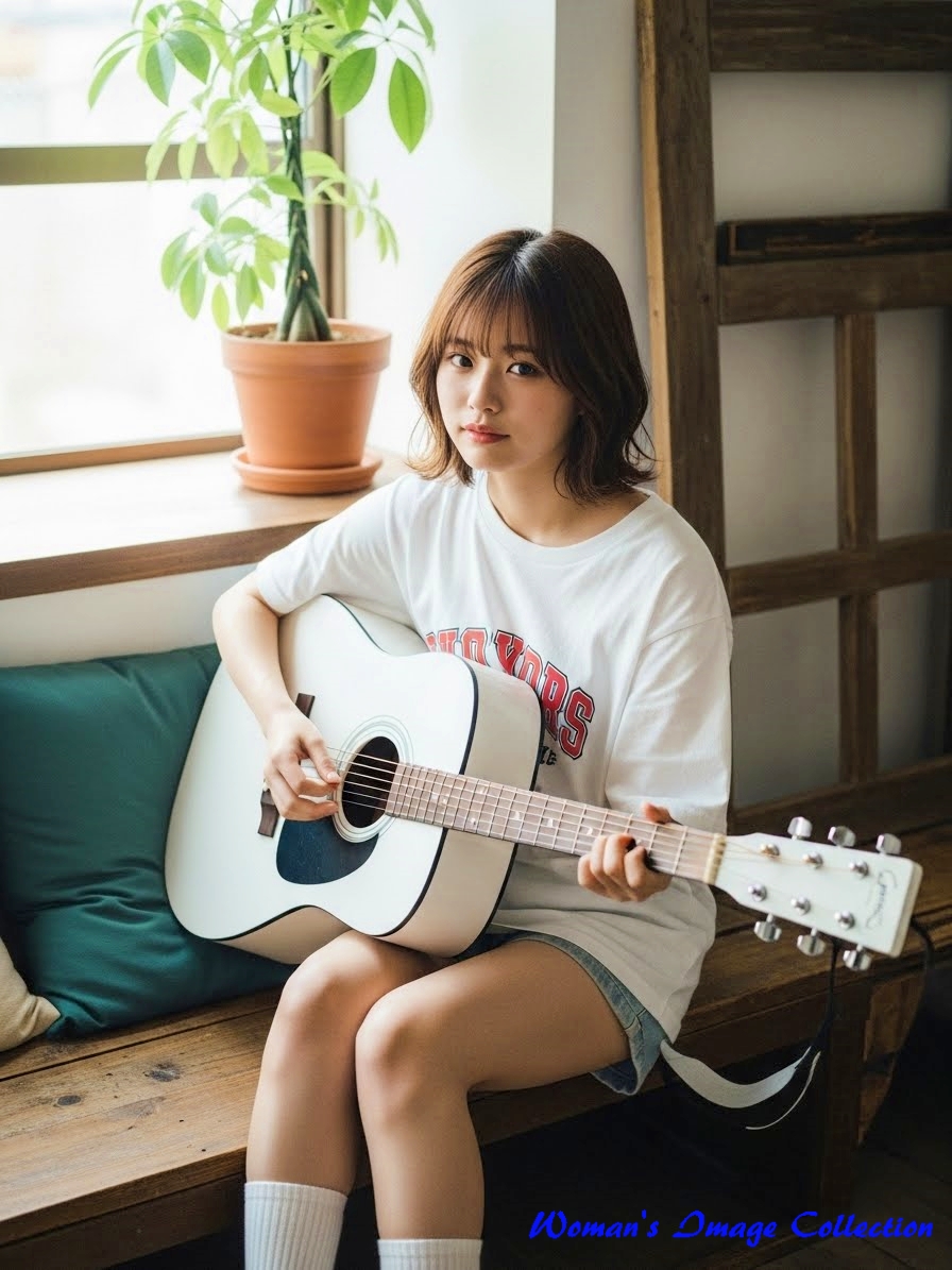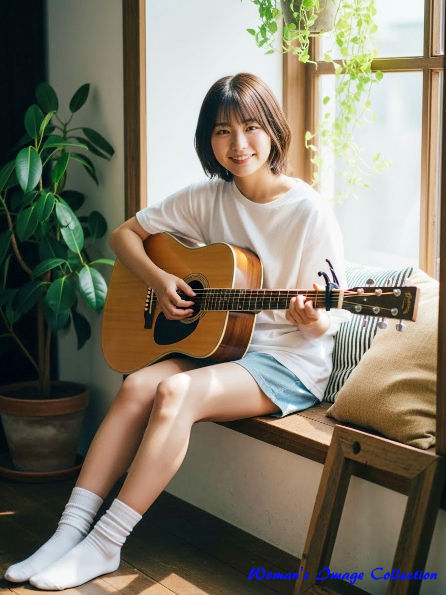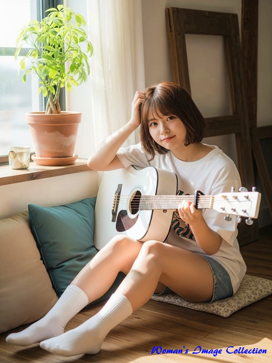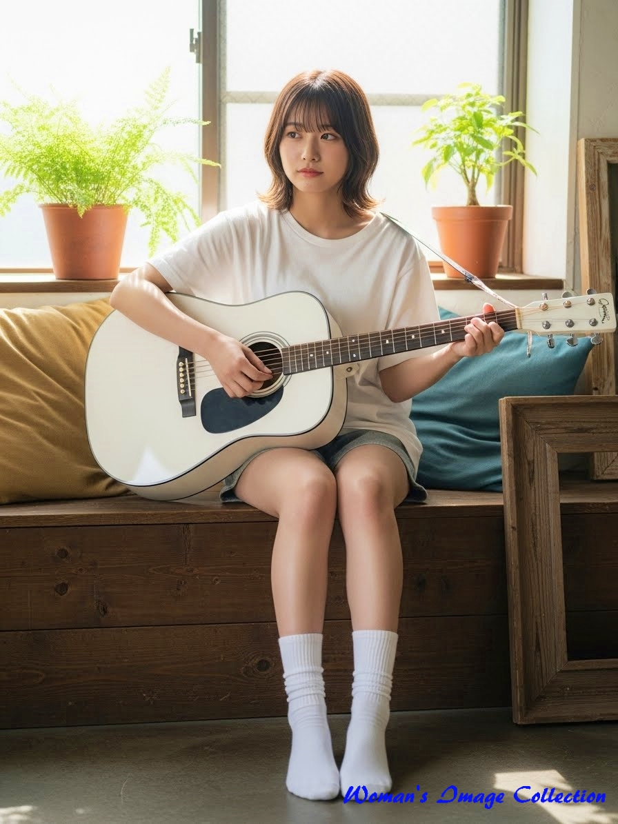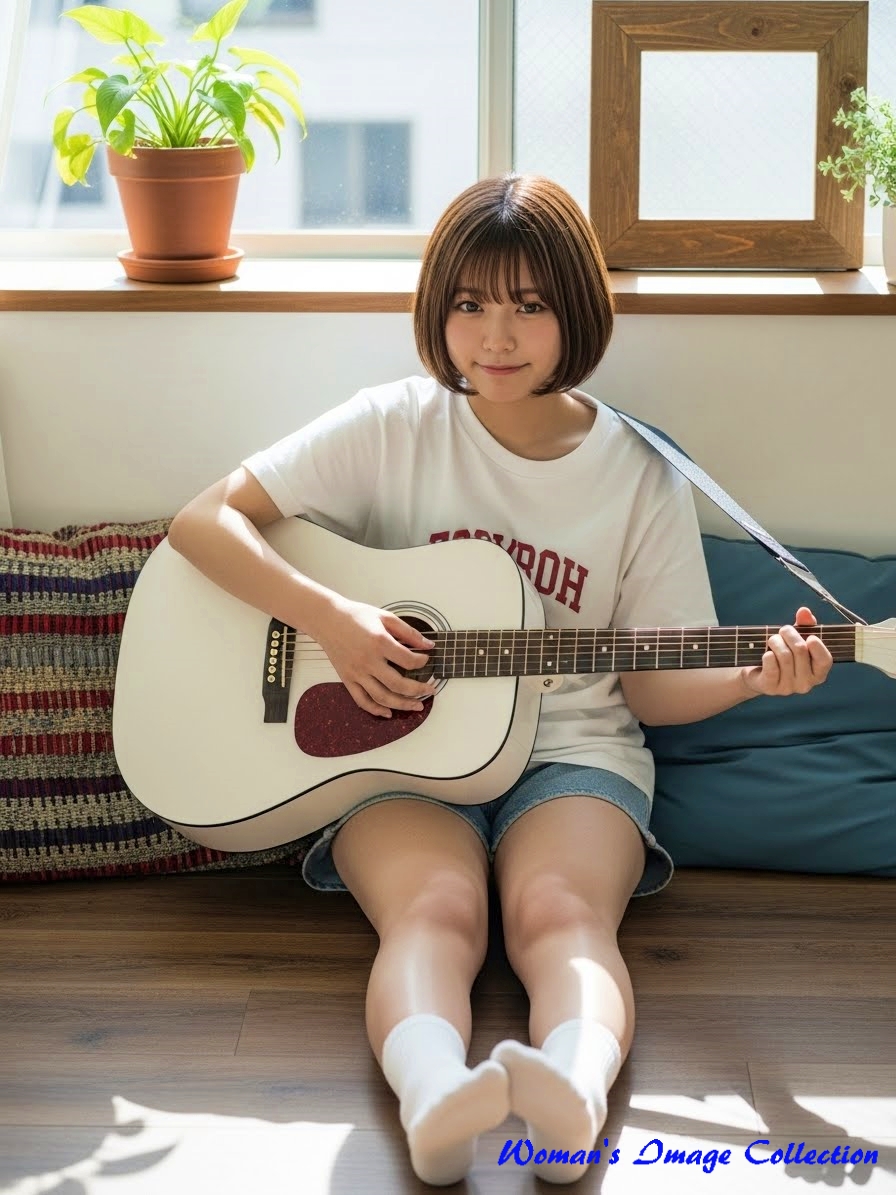 今回は、窓から入る自然光で明るい部屋でギターを弾いている女性のプロンプトです。