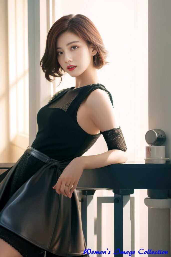 この画像に登場するのは、ブラックとゴールドを基調にした華やかなドレス。レザーとレースのコンビネーションが、美しさと力強さを兼ね備えた魅惑的な雰囲気を作り出しています。肩や腕に施されたオーガンジーのフリル、そして金色のディテールが高級感を演出し、視線を一気に引きつけます。
