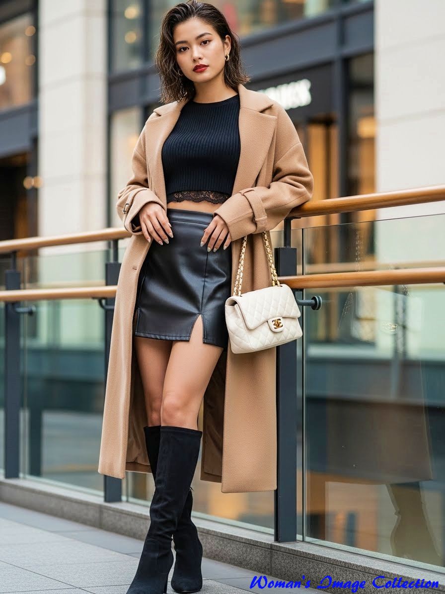 服装 (キャメルベージュのオーバーサイズウールトレンチコートをラフに肩掛け, 黒のクロップド丈オフショルダーリブニット, 胸元から黒レースのインナーをチラ見せ, ハイウエストのタイトな黒レザーミニスカート(深いサイドスリット入り), スリークな黒スエードニーハイブーツ, ゴールド金具付きの白いキルティングチェーンバッグ, 大胆な肌見せと異素材ミックス),