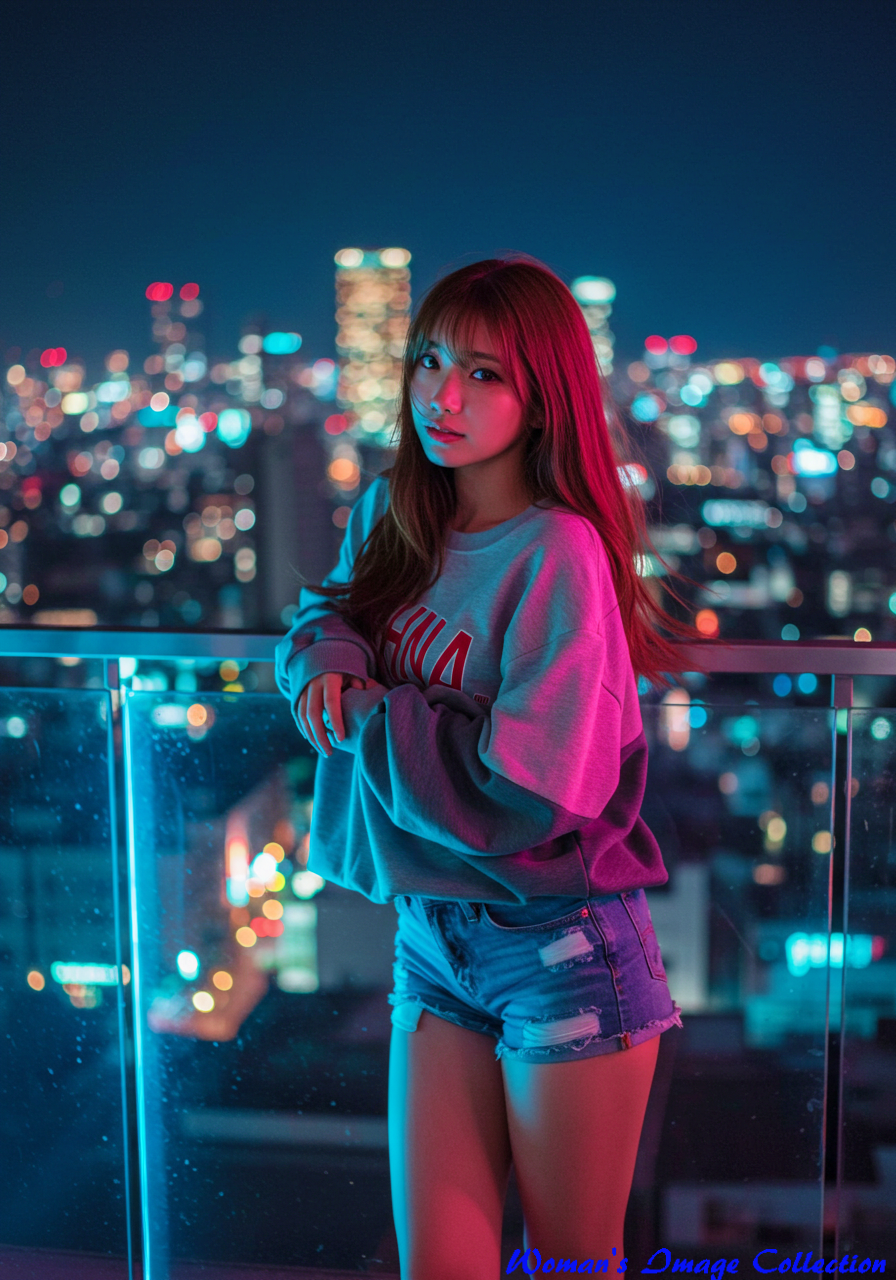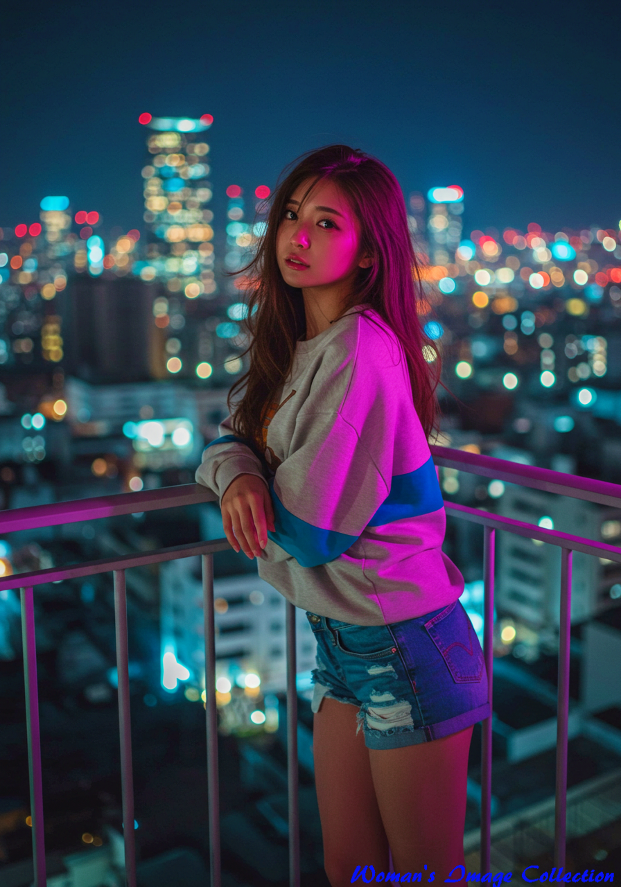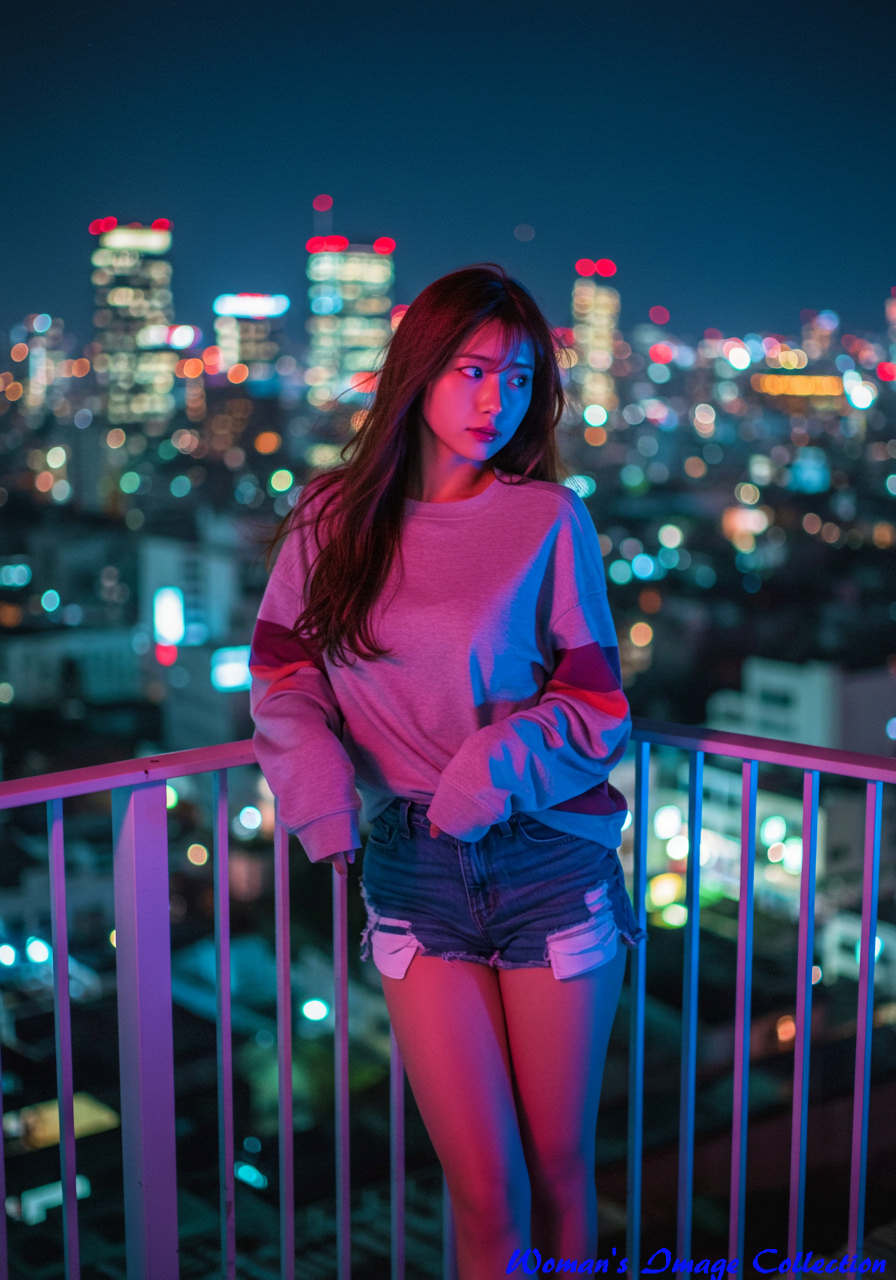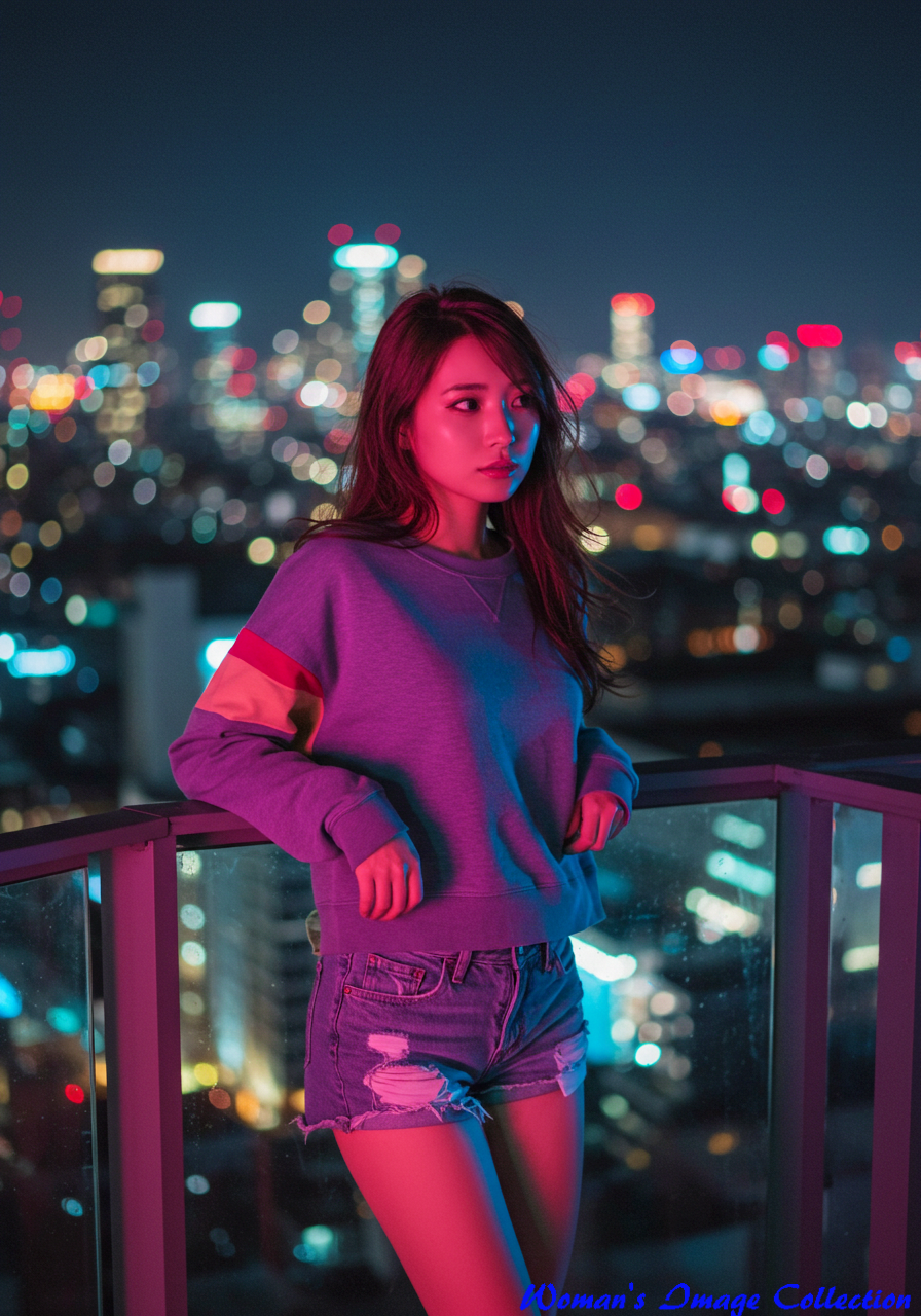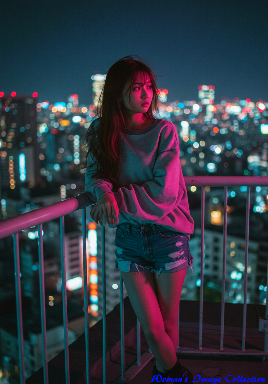 Lighting Type: 都市のネオンとストリートライトが織りなすドラマチックな夜間照明。被写体は正面からの弱いブルー系の光と、夜景からの温かいオレンジ・ピンク系の逆光を受けている。