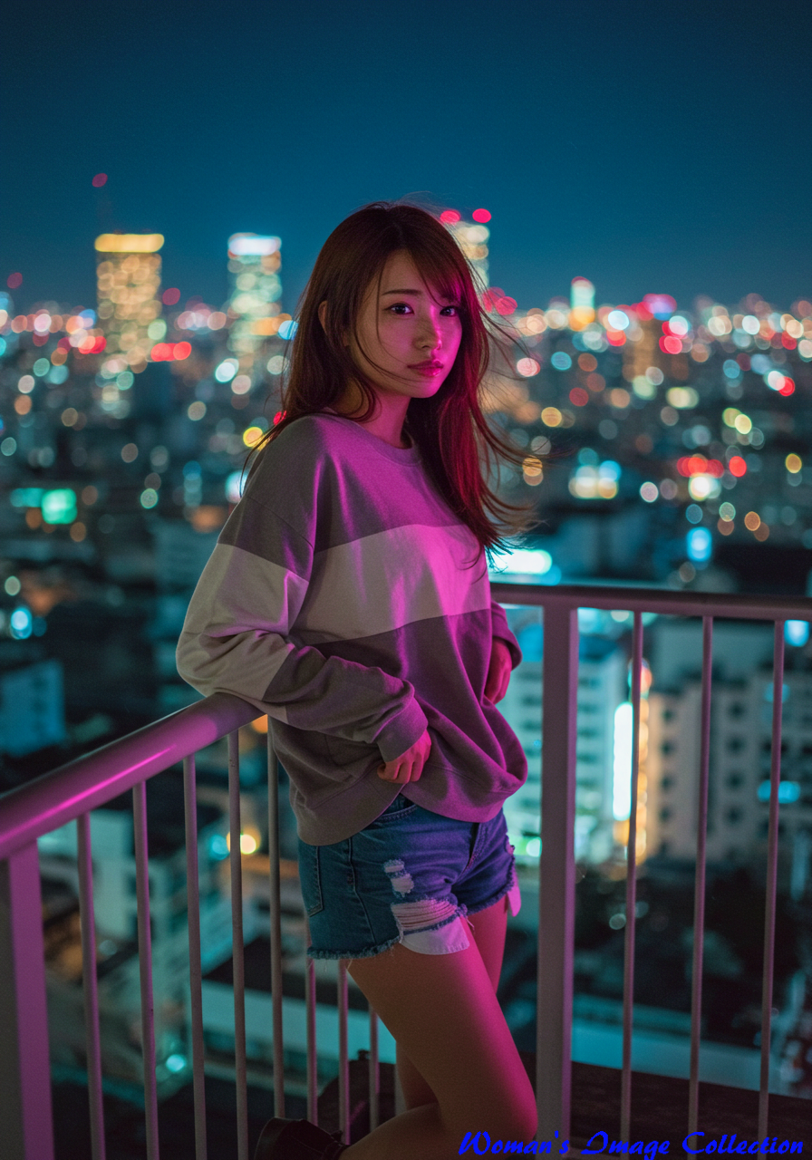 Emotion / Pose: 遠くの夜景を穏やかな表情で見ている。バルコニーの手すりに向こう向きに軽く肘をかけ、やや身体をひねって振り返ってカメラを見つめる立ち姿。