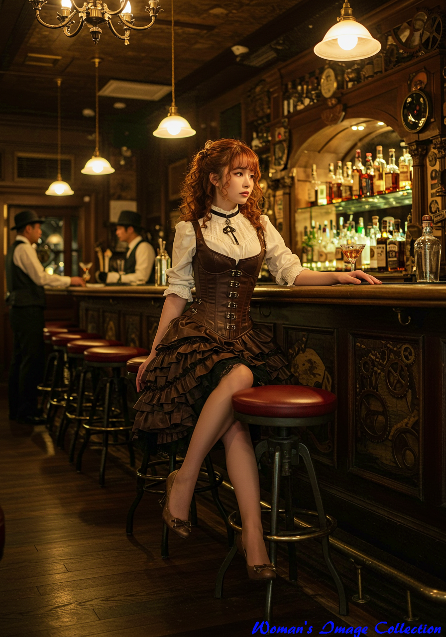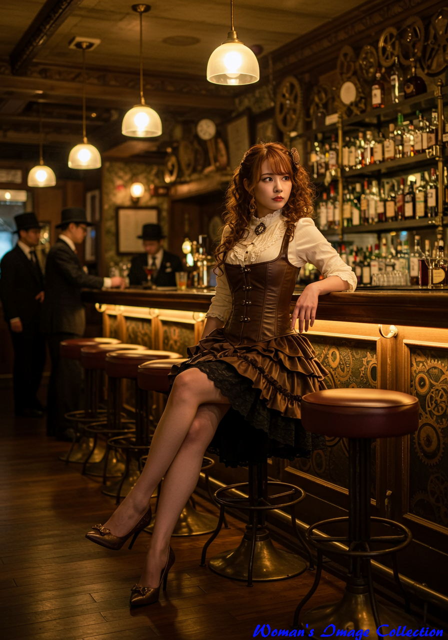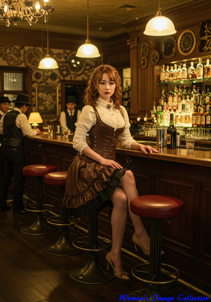 Specific Location: スチームパンク風に装飾された高級バーのカウンター席。壁には歯車や真鍮の装飾が施されている。