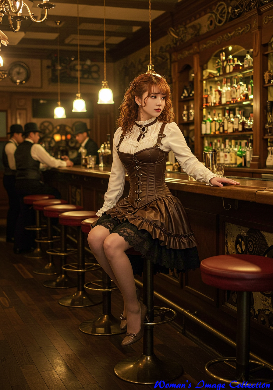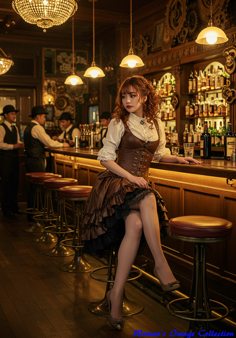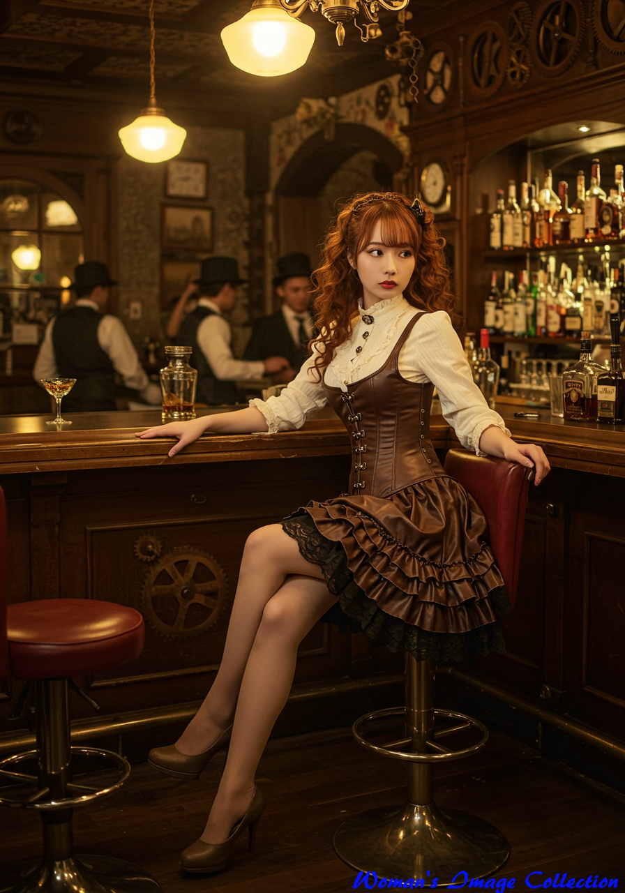Specific Location: スチームパンク風に装飾された高級バーのカウンター席。壁には歯車や真鍮の装飾が施されている。