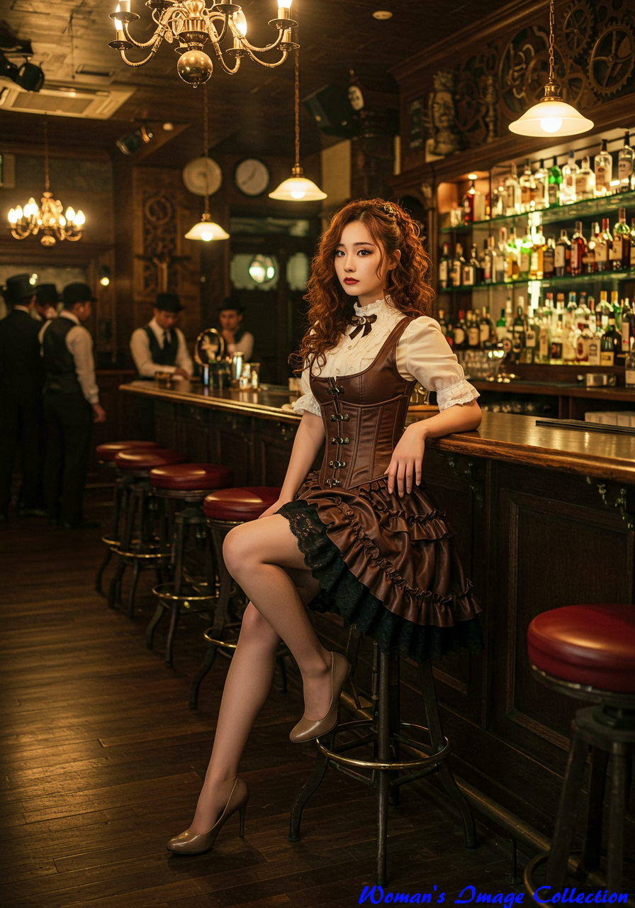 レトロのバーのカウンターに座っている白いブラウスに茶色のレザー調のでスカートの女性のプロンプトです。ボリューム感と、上部の濃い茶色の胴体部分が一体化したスチームパンク調のドレスをイメージしたプロンプトです。