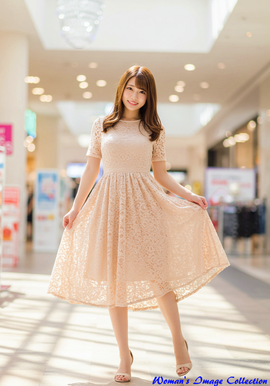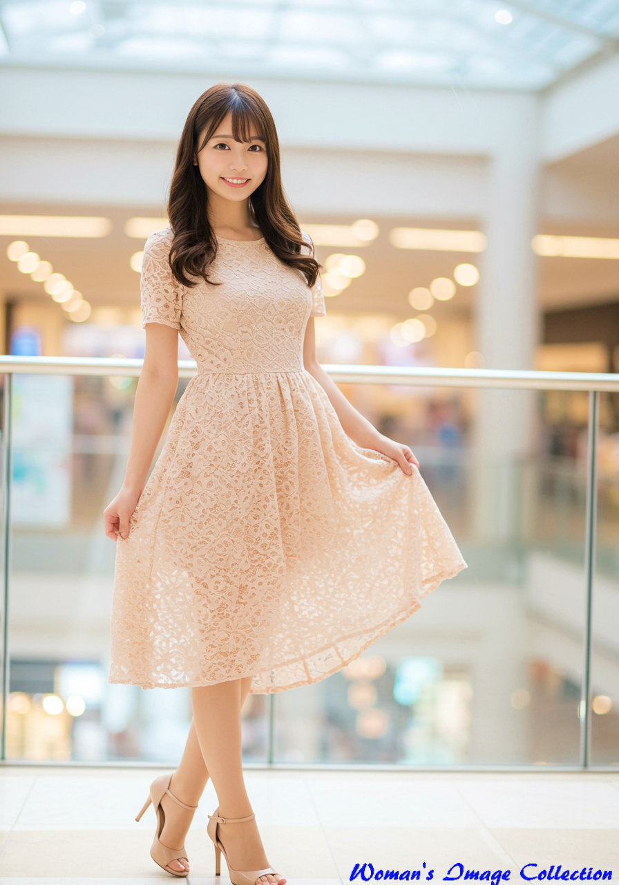 レースのワンピースの女性がスカートの裾を持ってポーズをとっているプロンプトを作成しました。背景はイオンモールにしてみました。かわいい表情にしたかったので、メイクアップで少し長めに設定してみました。