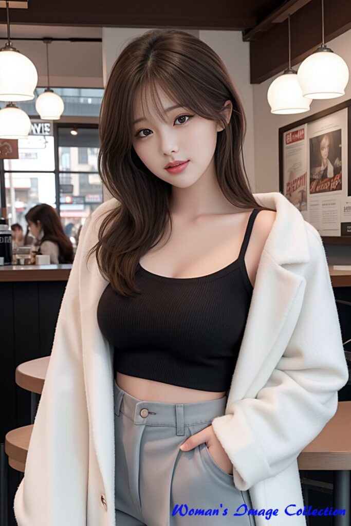 この画像は、洗練された都会的な雰囲気の中で、女性の魅力が最大限に引き出されたポートレート写真です。背景には現代的なカフェのインテリアが映り込み、シンプルかつスタイリッシュな空間が全体の印象を際立たせています。女性の表情は柔らかく、自然な魅力が写真全体を包み込み、見る人を惹きつける力を持っています。