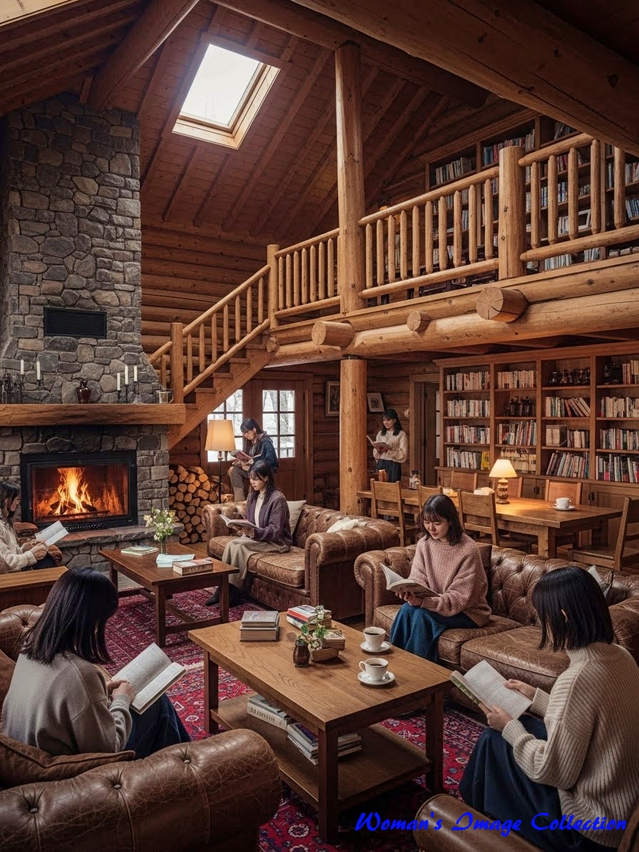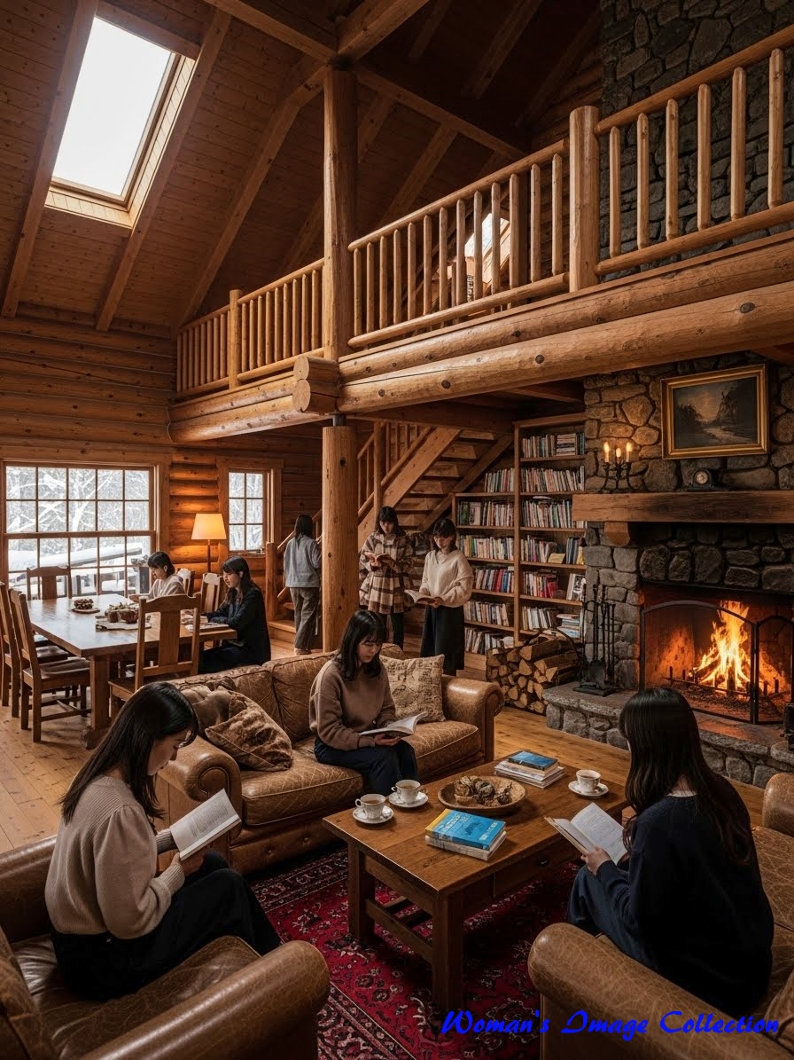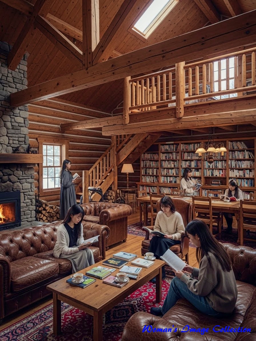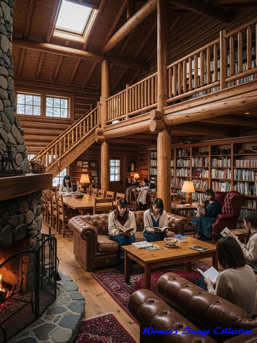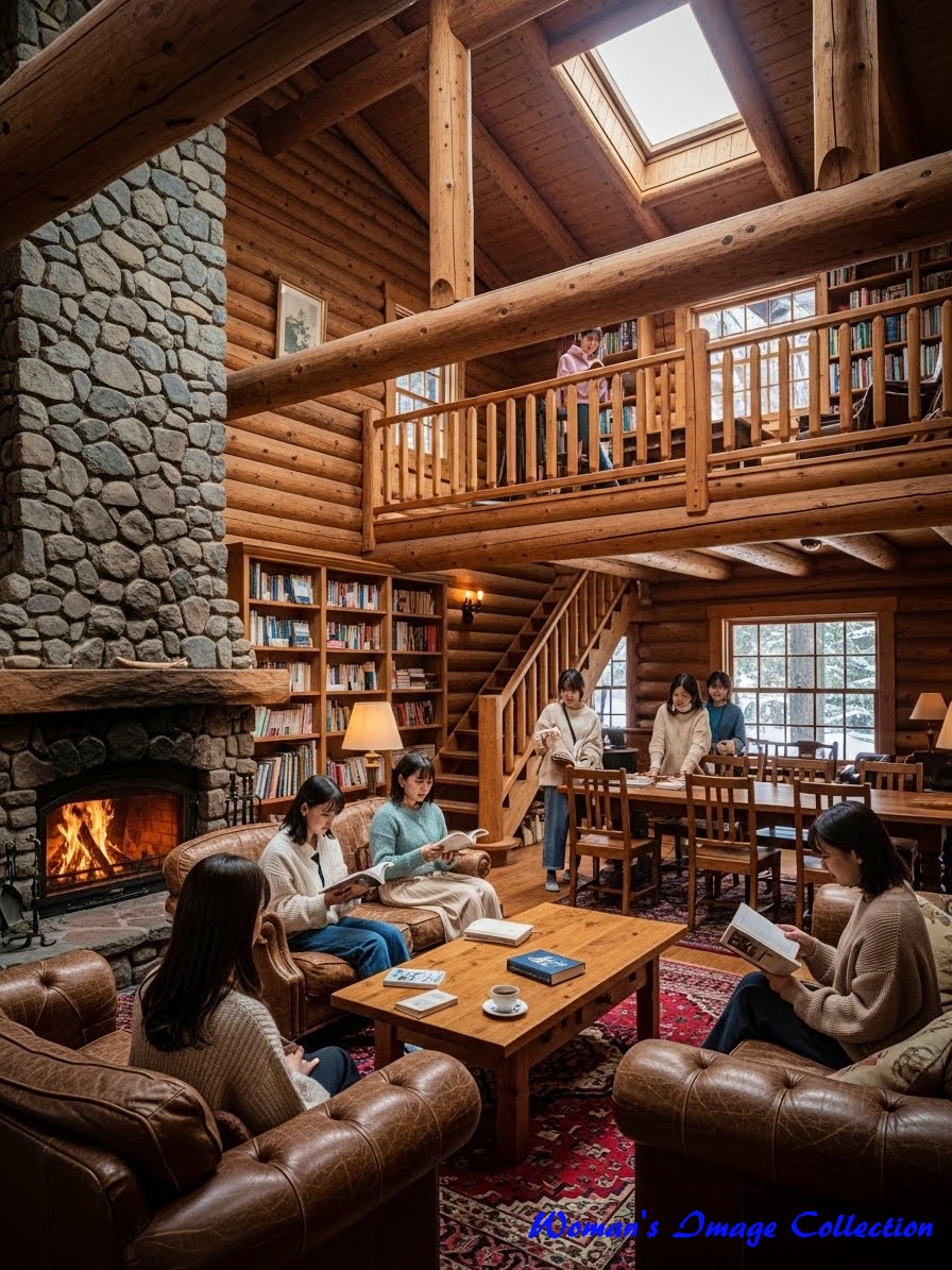 被写体 (広々としたログハウス, 石造りの暖炉に燃える火, 複数の快適な革製ソファとチェア, 木製のテーブル, 大きな木製ダイニングテーブル, 壁一面に並んだ木製の本棚にぎっしり詰まった本, 2階へ続く木製の階段, 2階のバルコニーと手すり,多くの若い様々な服を着た日本人女性達が本を選んだり、椅子に座って本を読んだり、お茶を飲んだりしている),