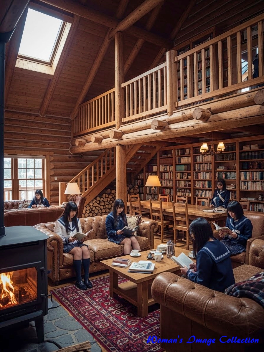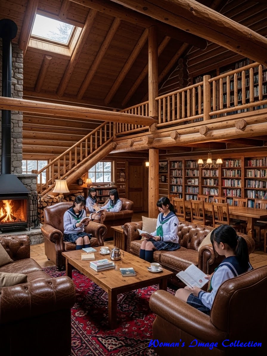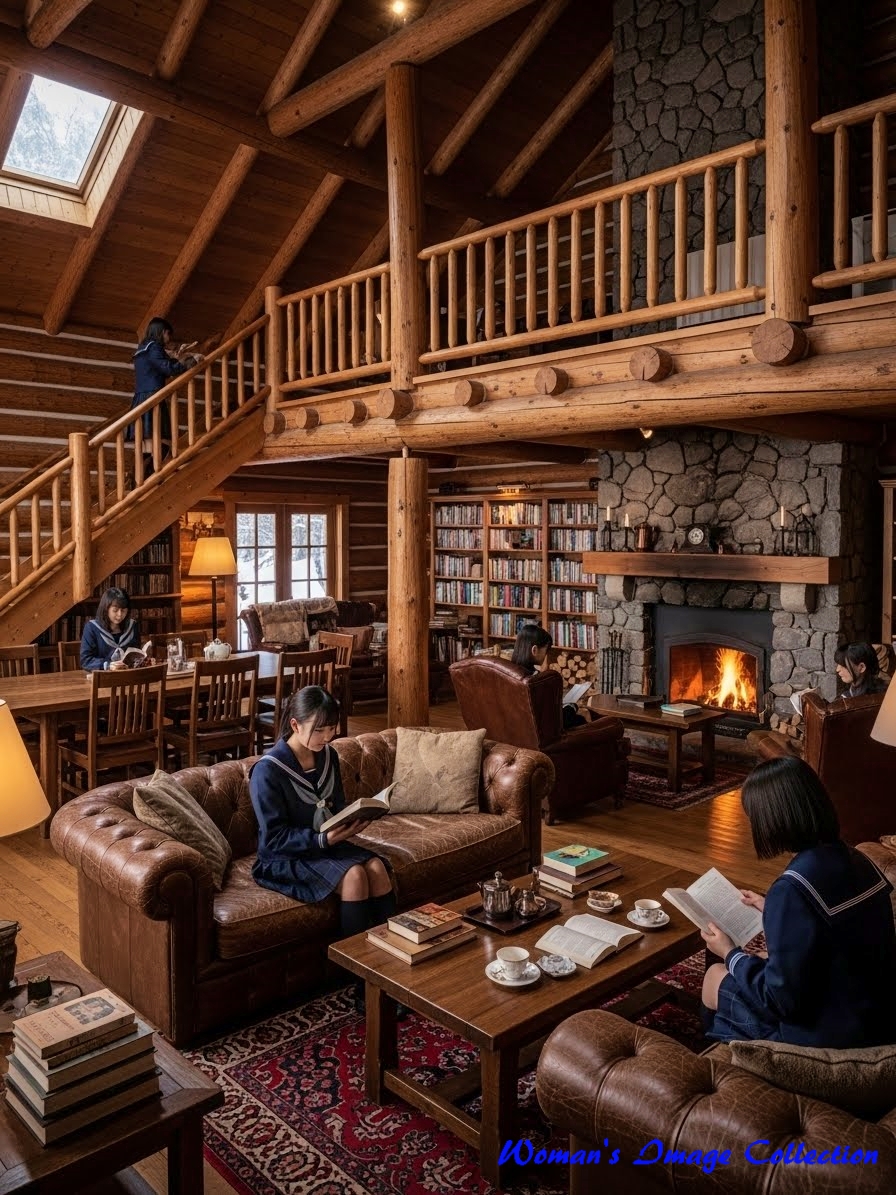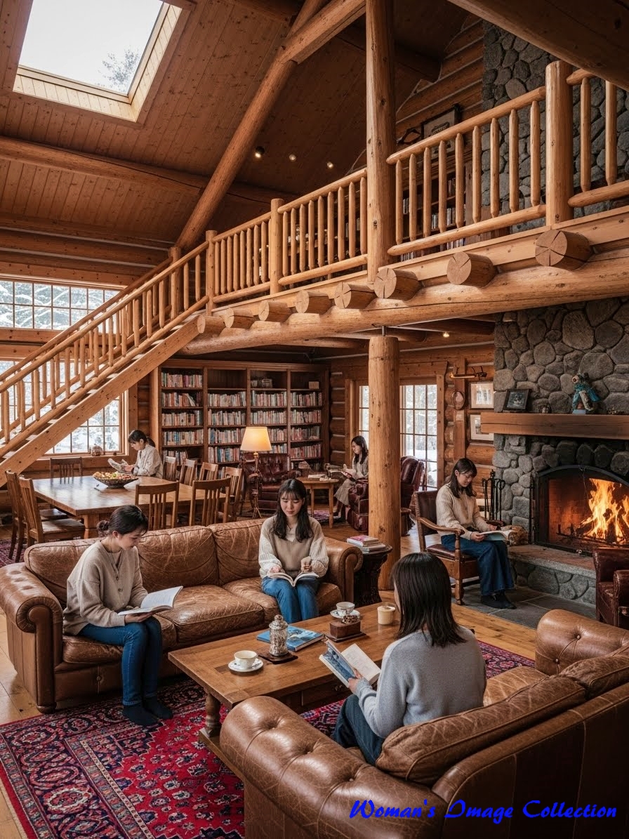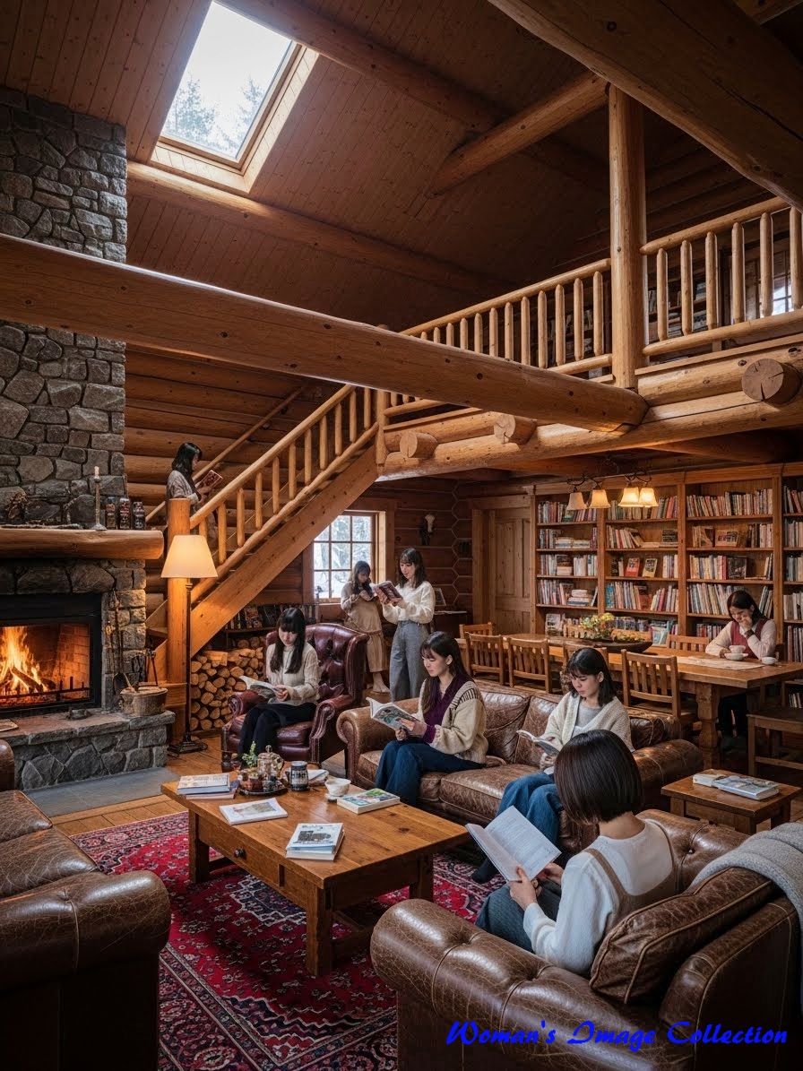 被写体 (広々としたログハウス, 石造りの暖炉に燃える火, 複数の快適な革製ソファとチェア, 木製のテーブル, 大きな木製ダイニングテーブル, 壁一面に並んだ木製の本棚にぎっしり詰まった本, 2階へ続く木製の階段, 2階のバルコニーと手すり,多くの若い様々な服を着た日本人女性達が本を選んだり、椅子に座って本を読んだり、お茶を飲んだりしている),