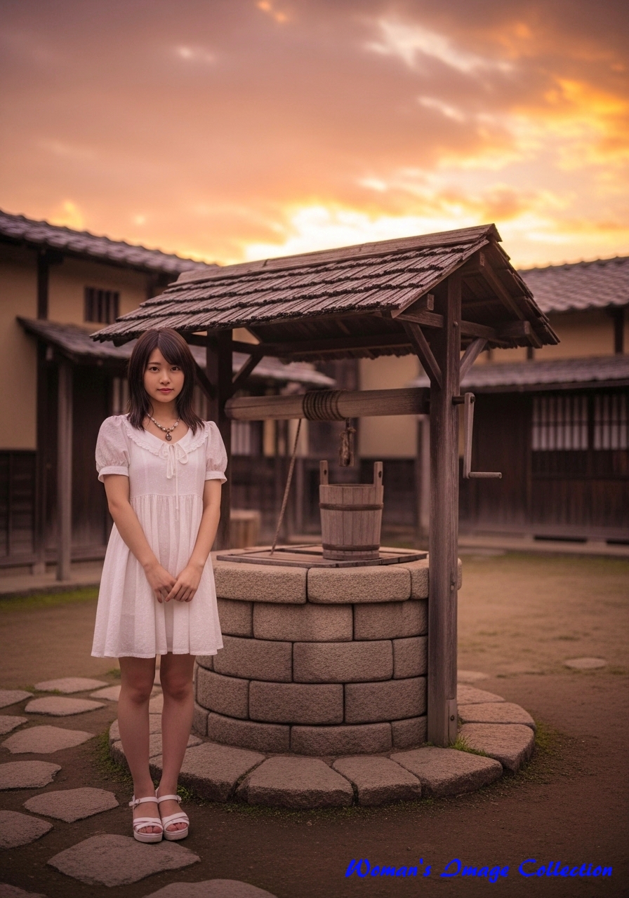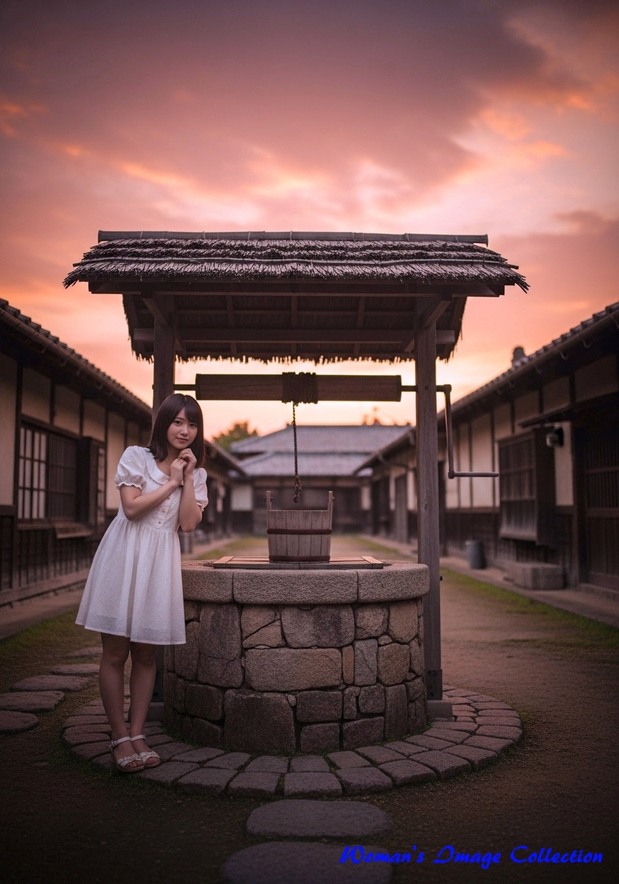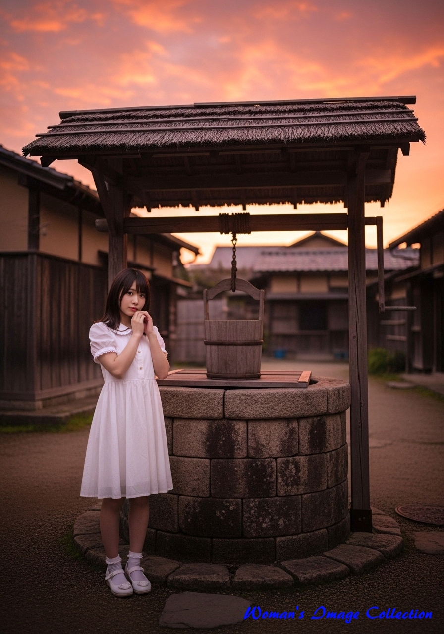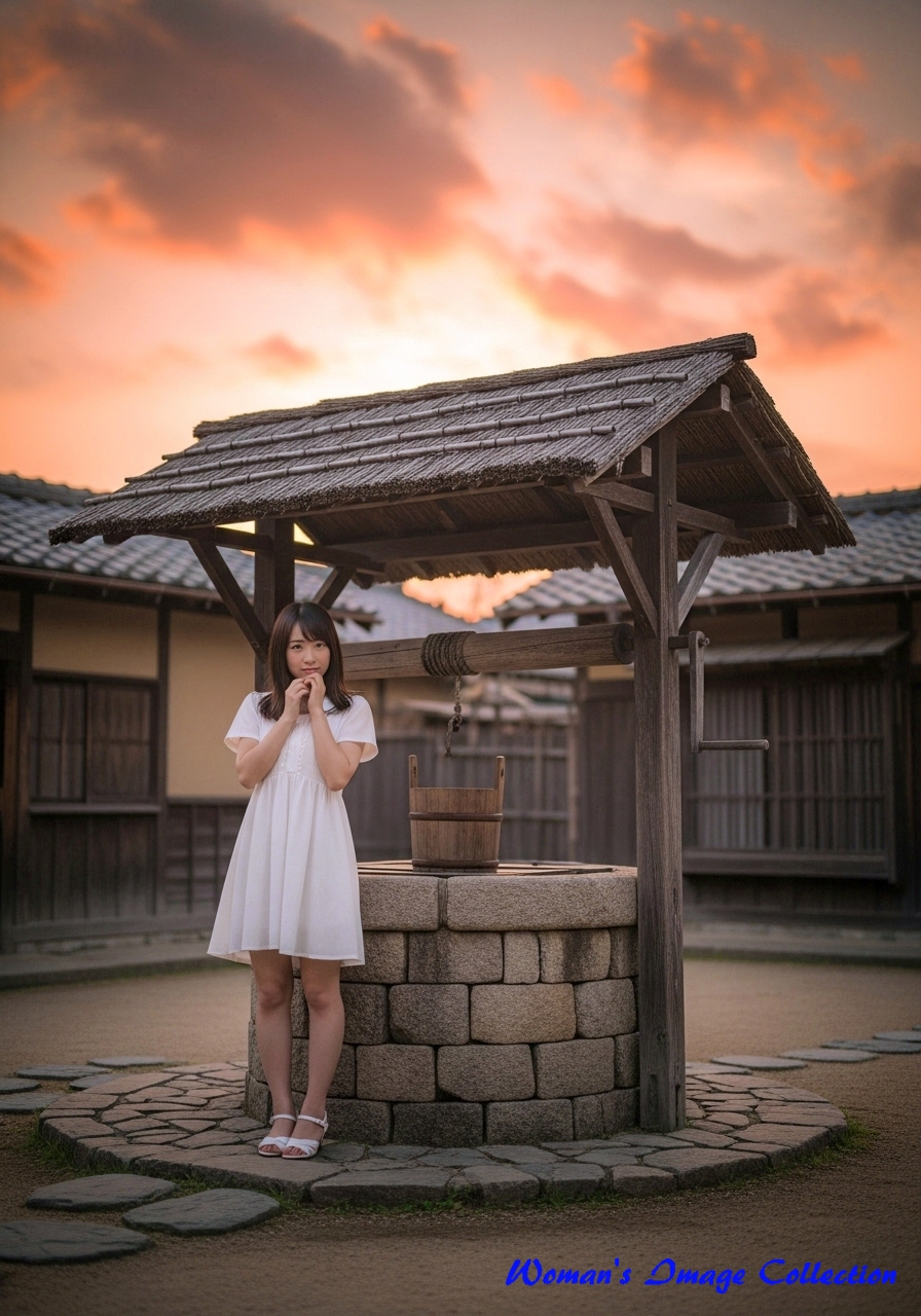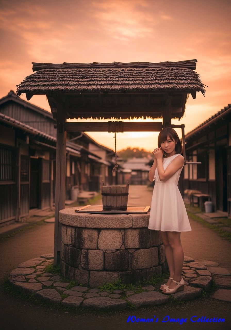 白いミニドレスの女性。恥ずかしそうにカメラを見つめる。微笑。大きな釣瓶のある井戸端。井戸はとても古く石で作られ、屋根は木の皮が張られており情緒を感じさせる。