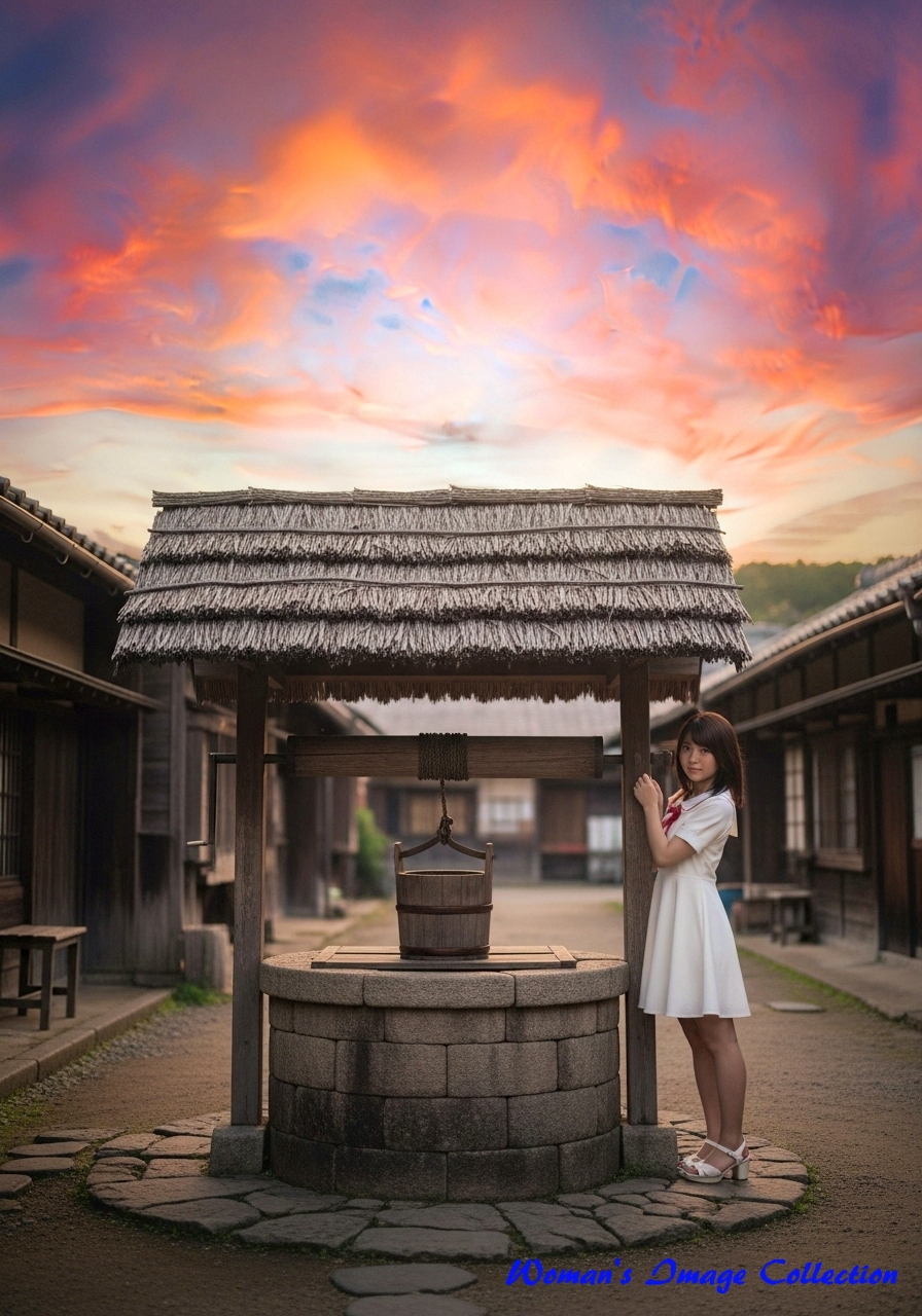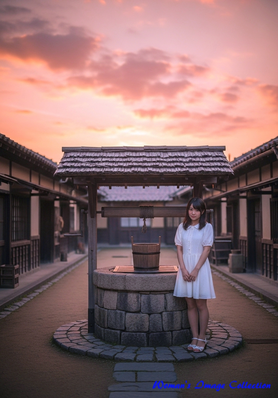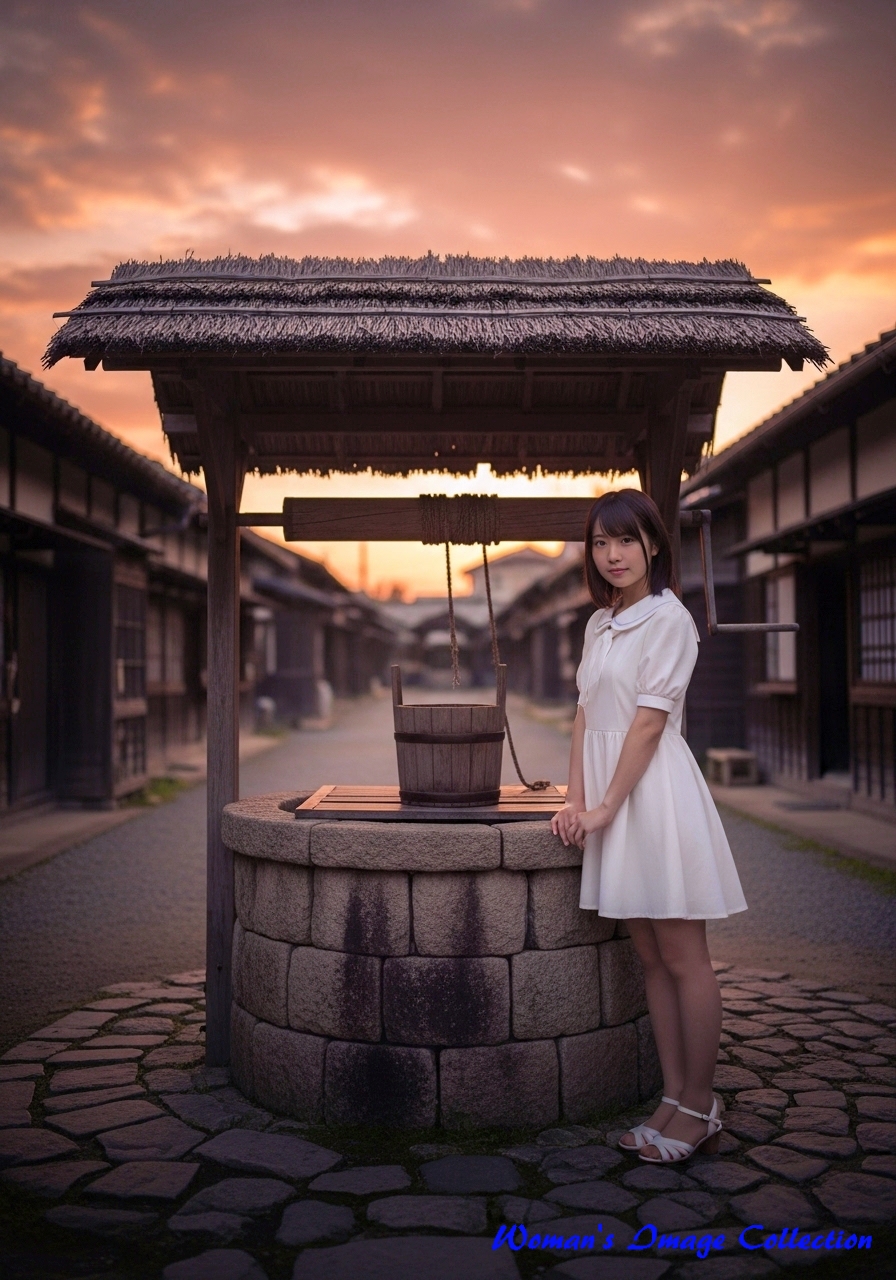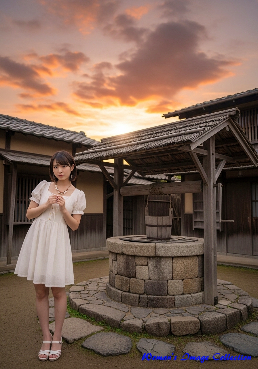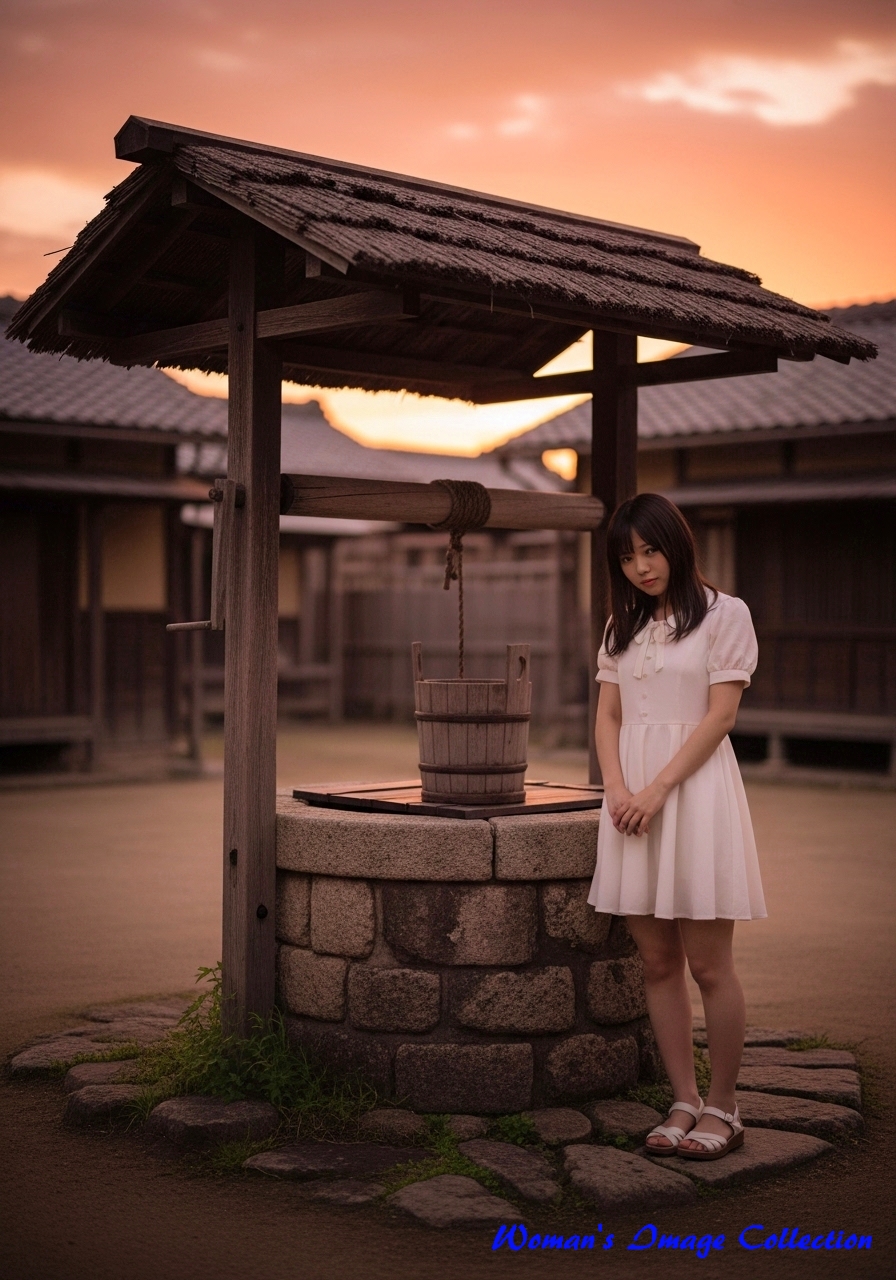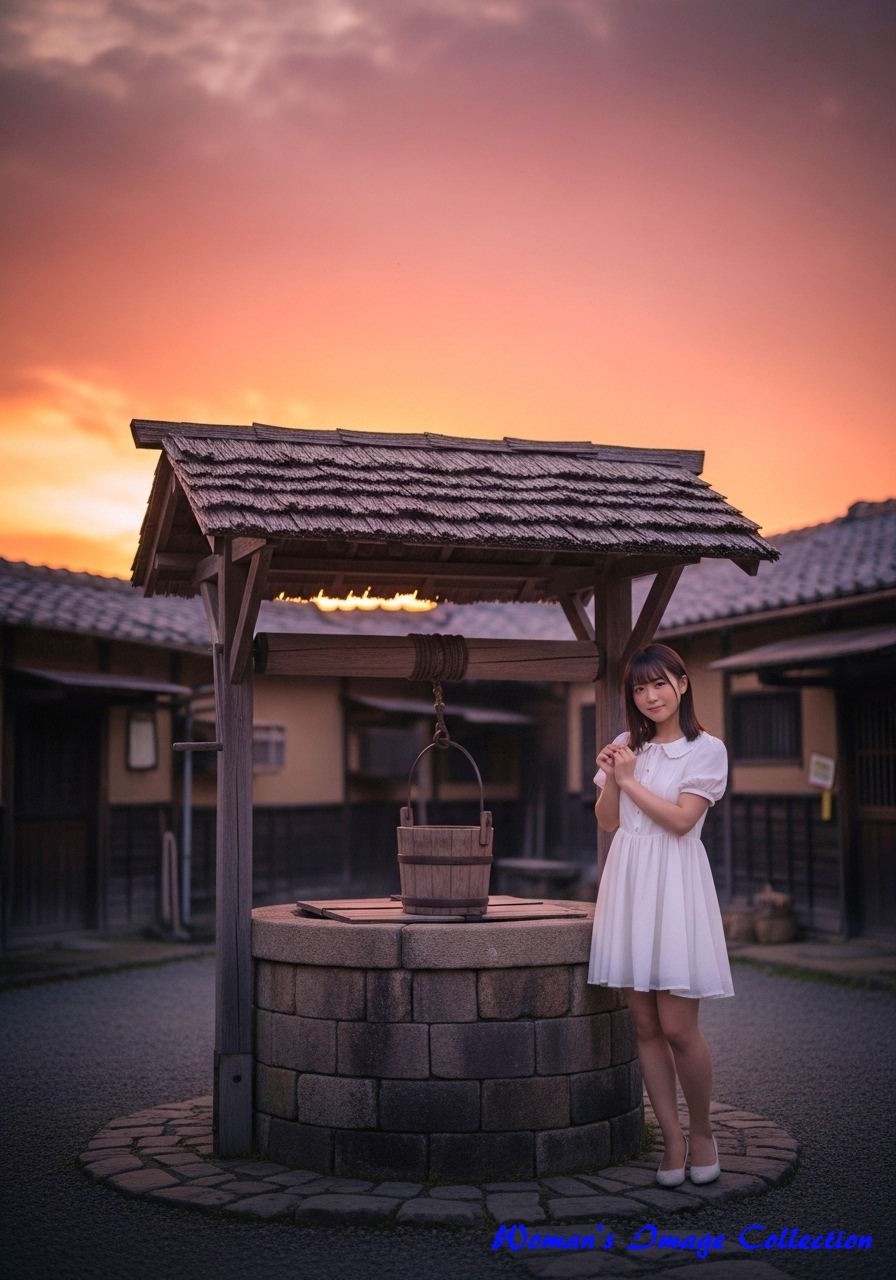 白いミニドレスの女性。恥ずかしそうにカメラを見つめる。微笑。大きな釣瓶のある井戸端。井戸はとても古く石で作られ、屋根は木の皮が張られており情緒を感じさせる。