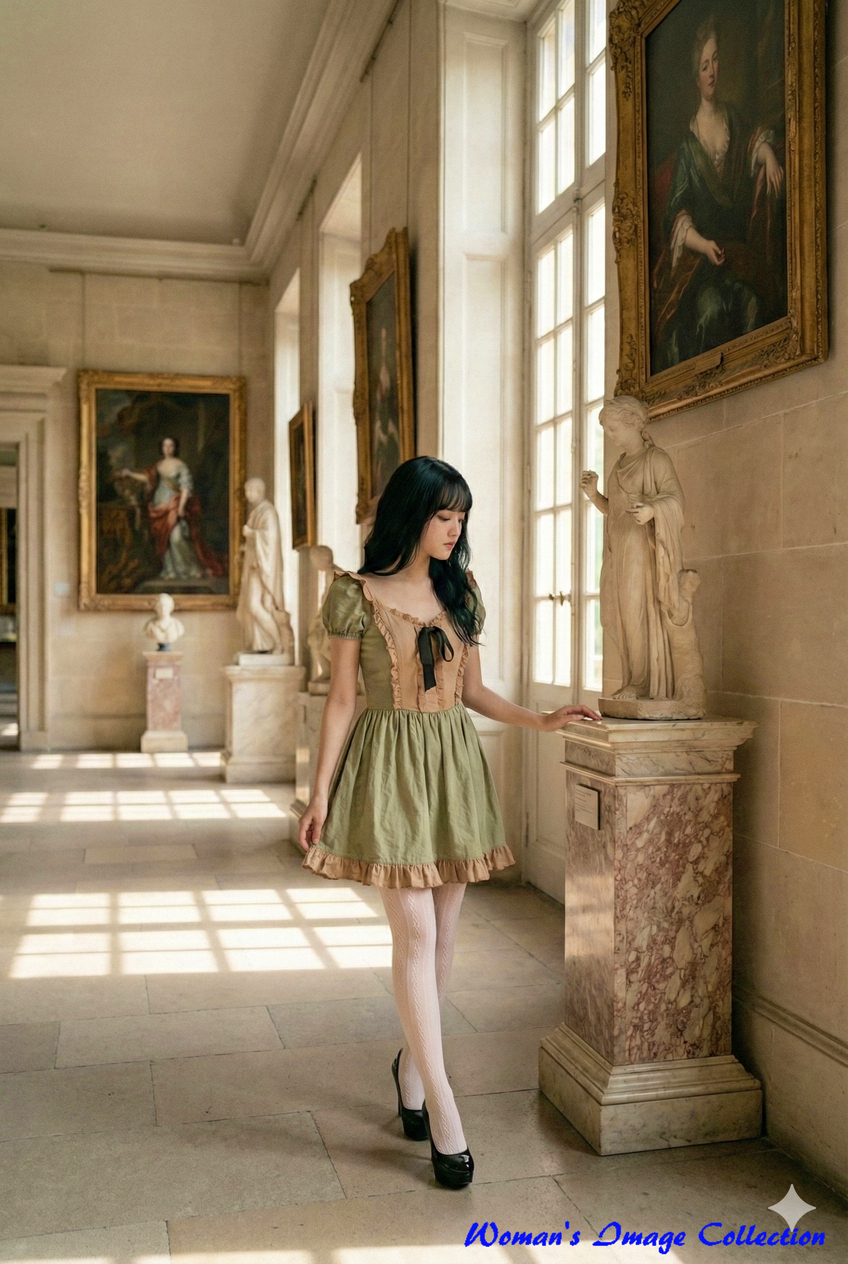 服装 (くすんだオリーブグリーンのパフスリーブワンピース, ヴィンテージ感のあるコットンリネン素材, 自然なシワ感, スクエアネックの襟元と裾にエクリュのフリル装飾とリボン, 白いケーブル編みのテクスチャタイツ, 光沢のある黒のエナメルハイヒールパンプス),