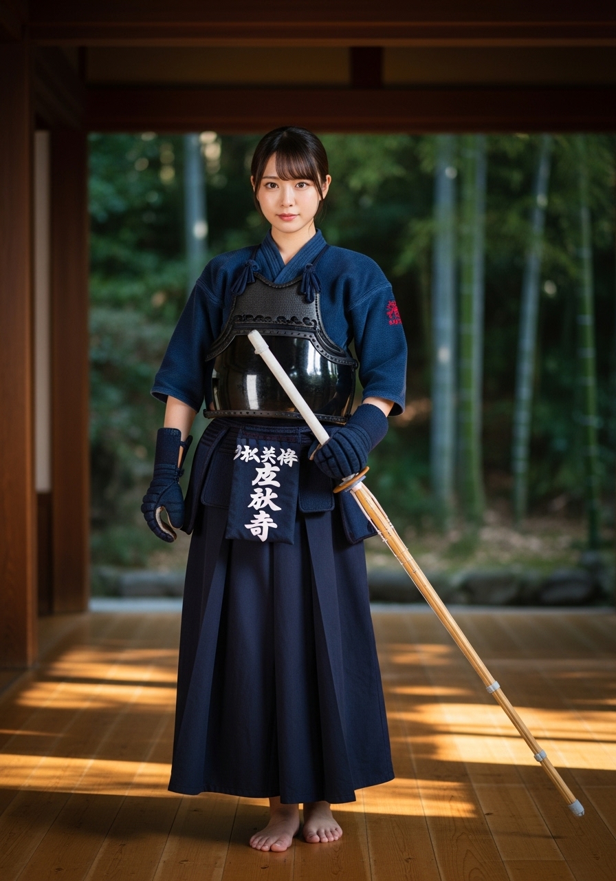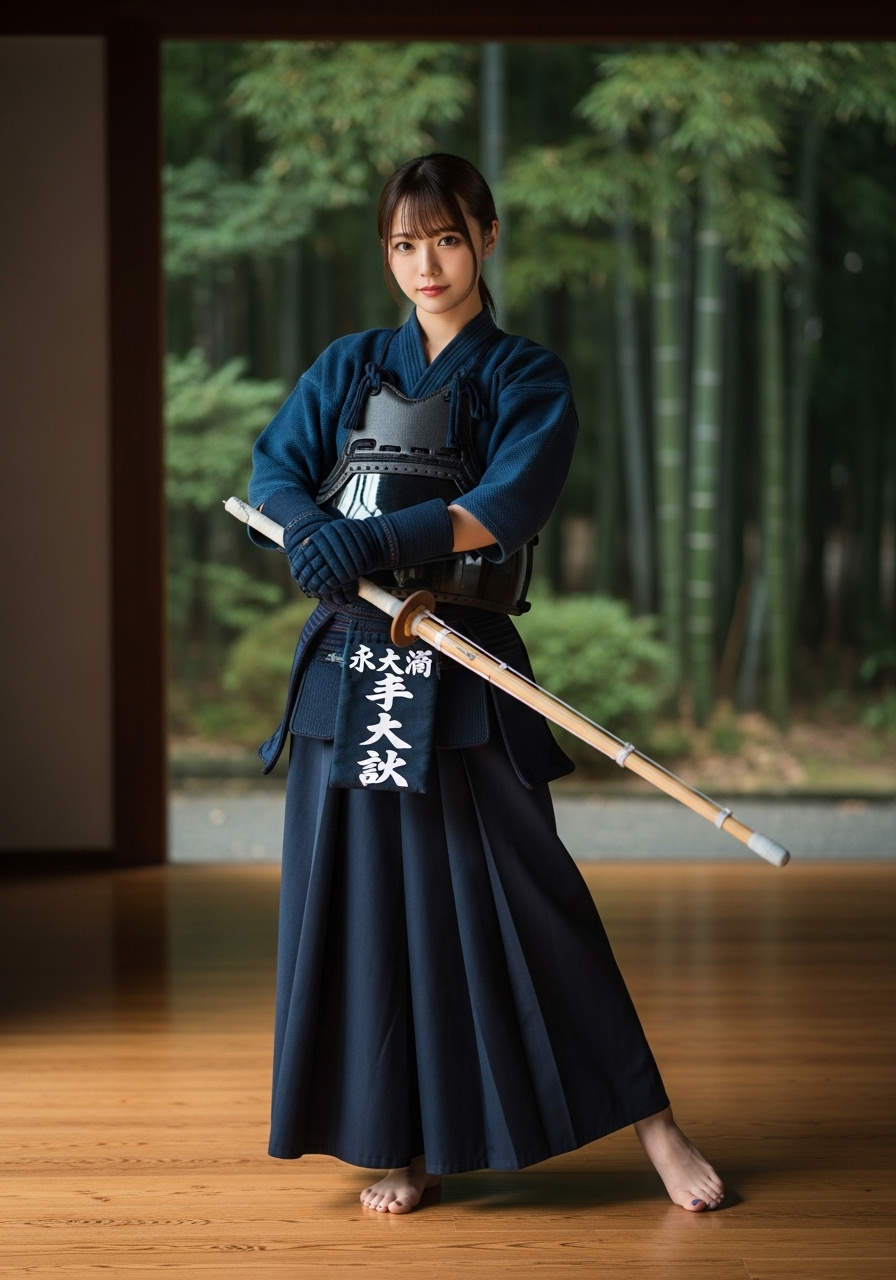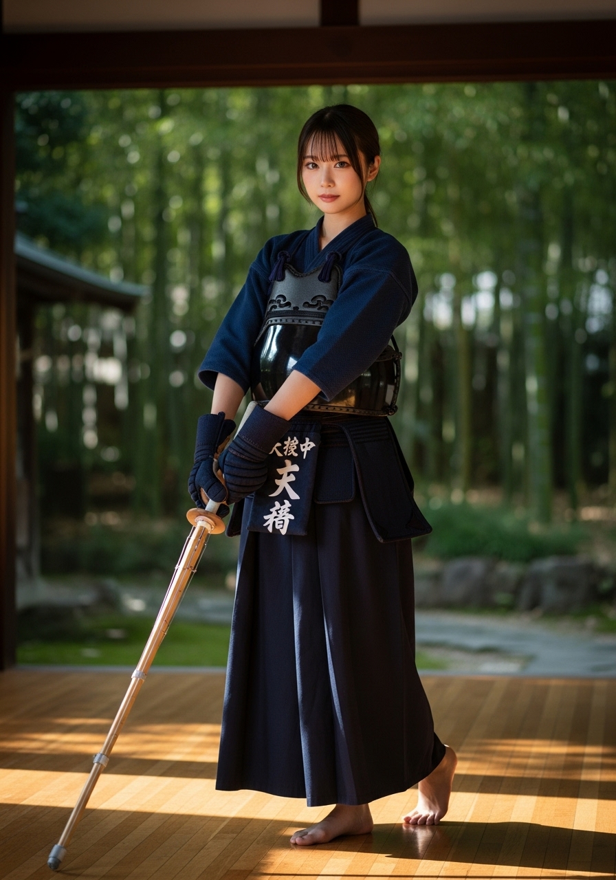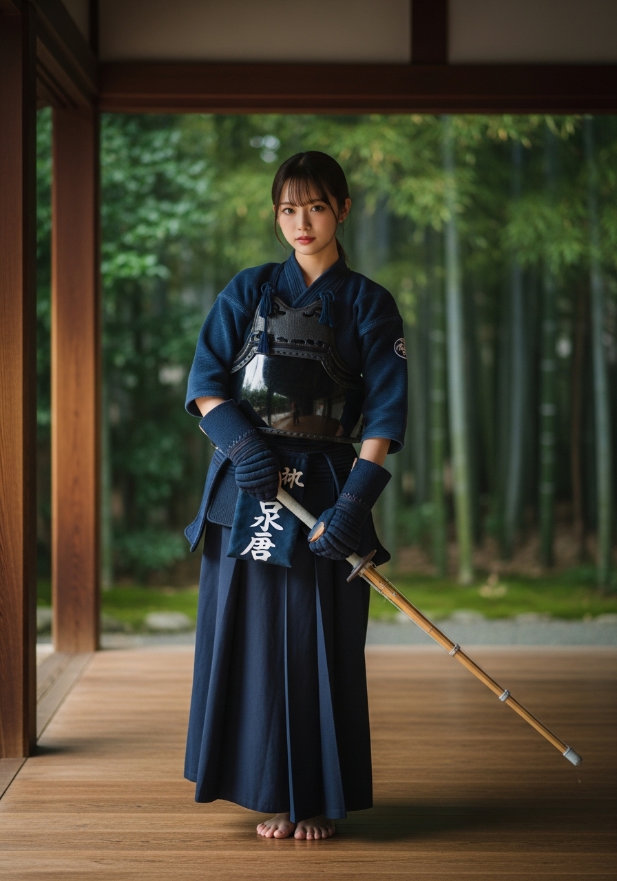Framing: 剣道着の縦のラインとポーズのダイナミズムを強調する縦長の構図、または中央に配置し対称性を強調。